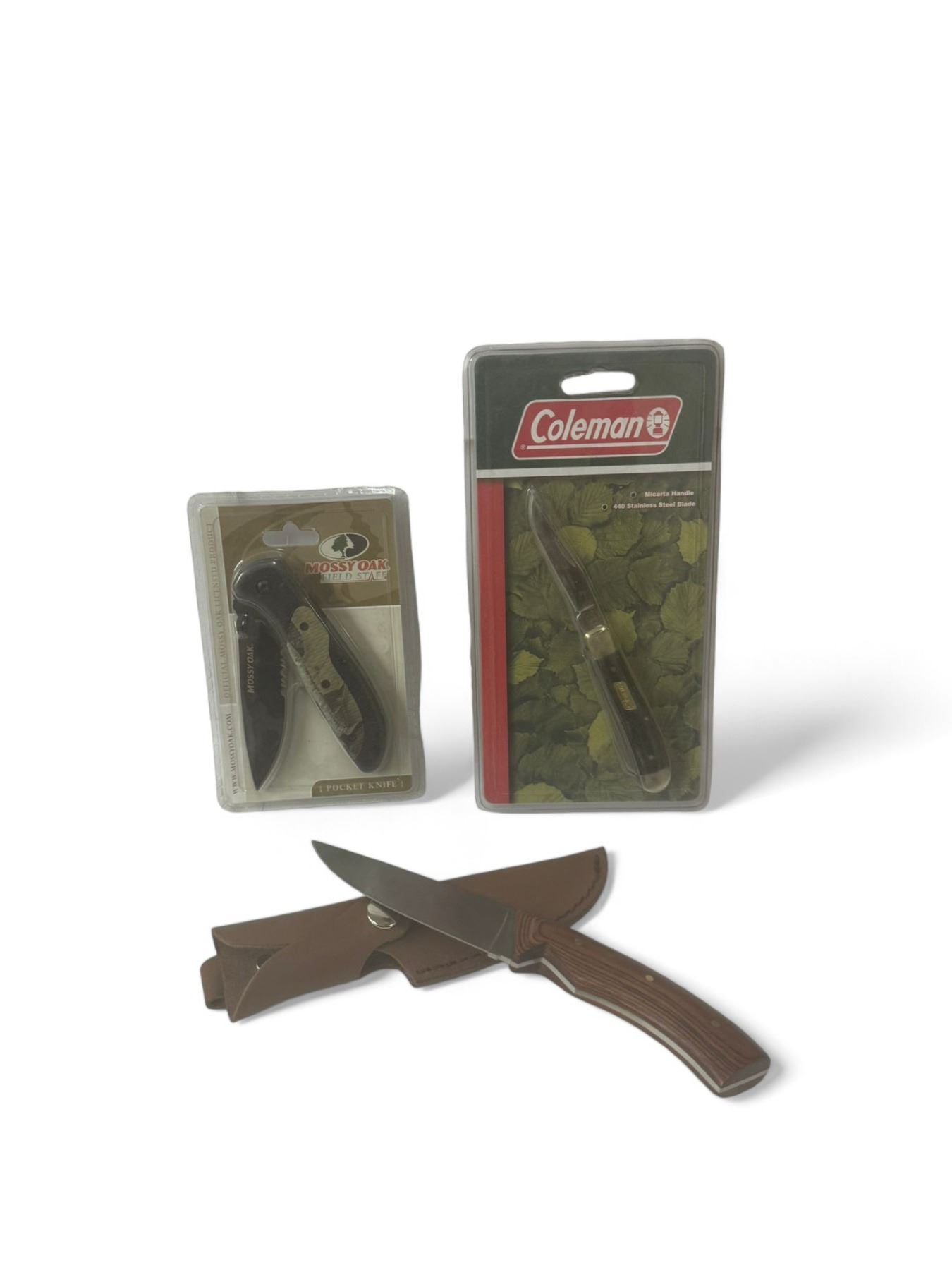 1 Coleman Knife, 1 Mossy Oak Pocket, 1 China Fixed Blade with Belt Clip Sheath