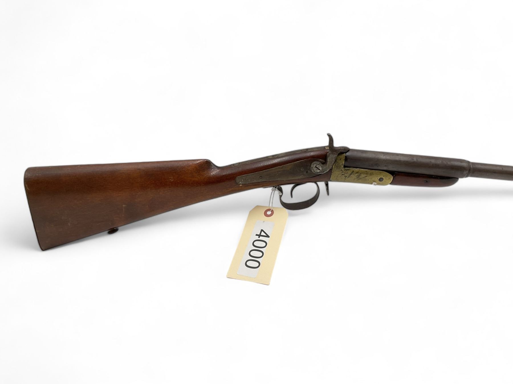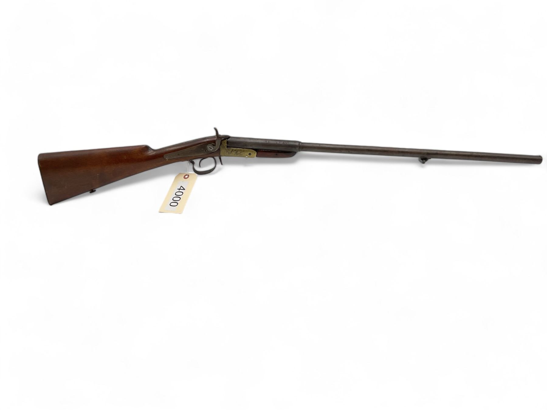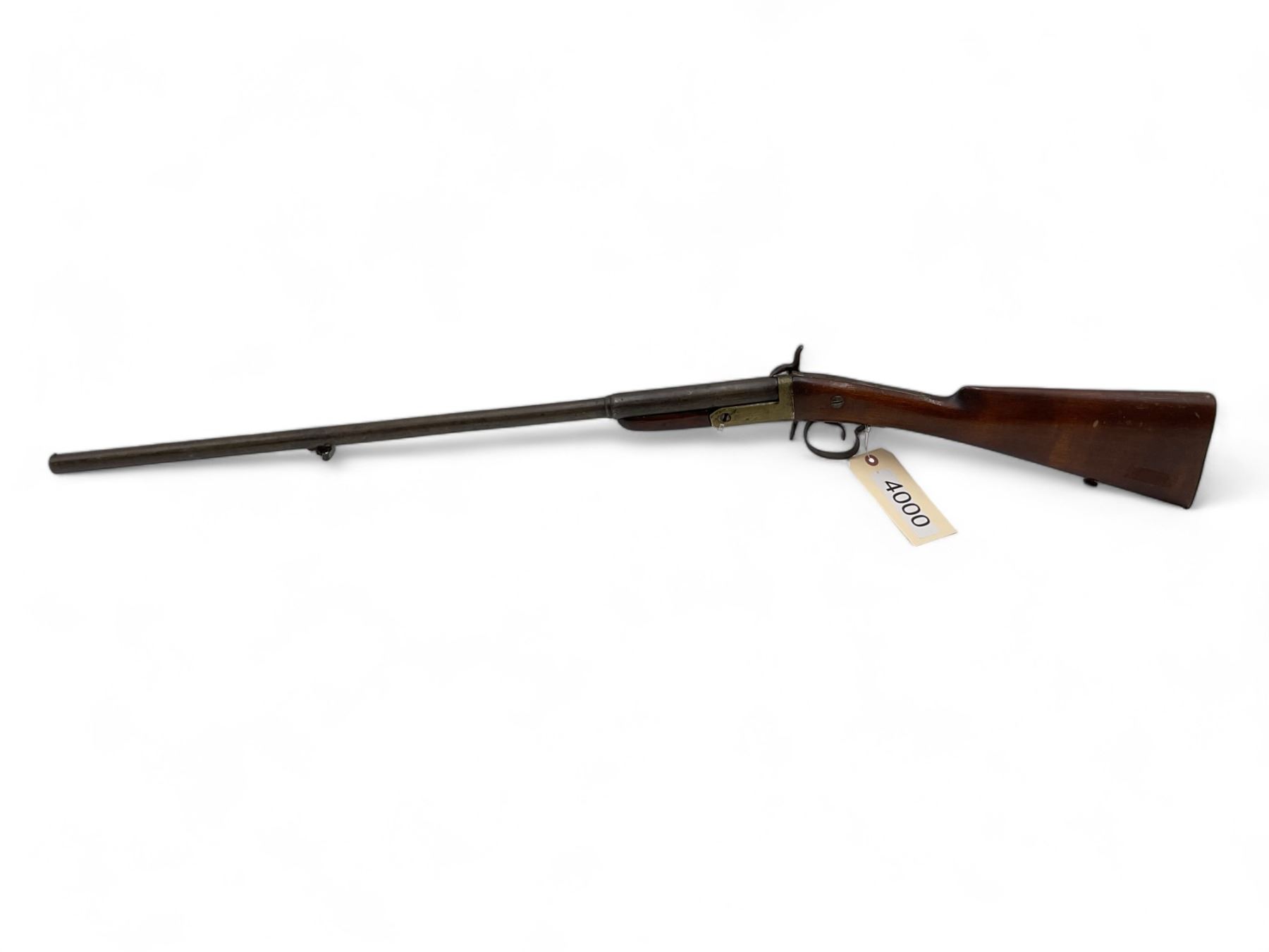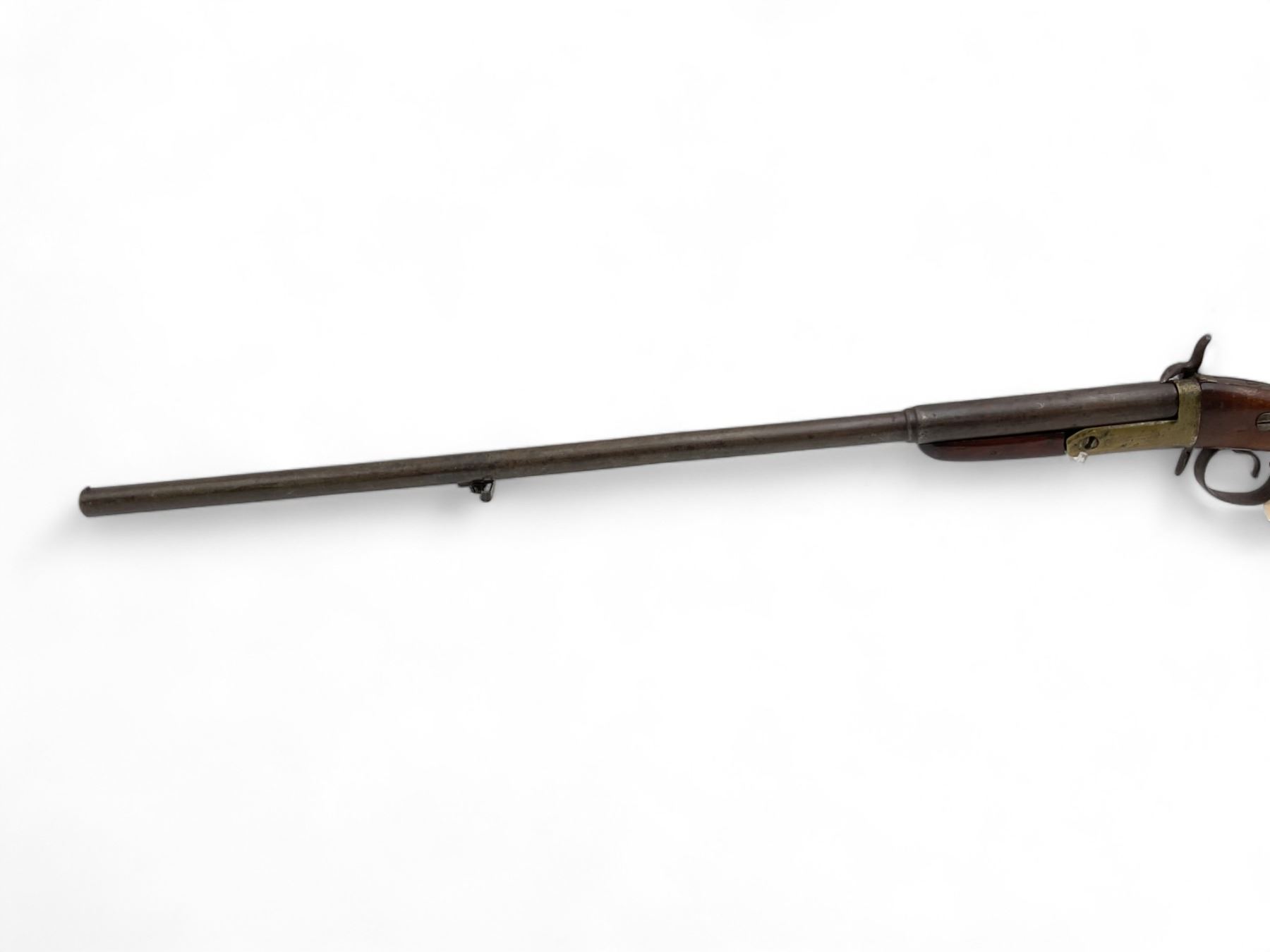16Ga Pinfire Single Shot Shotgun 30" Barrel Wood Stock, Antique. Bead sight; comes with sling mounts. Must be over 18 years of age to purchase; no license required as this is an antique.
