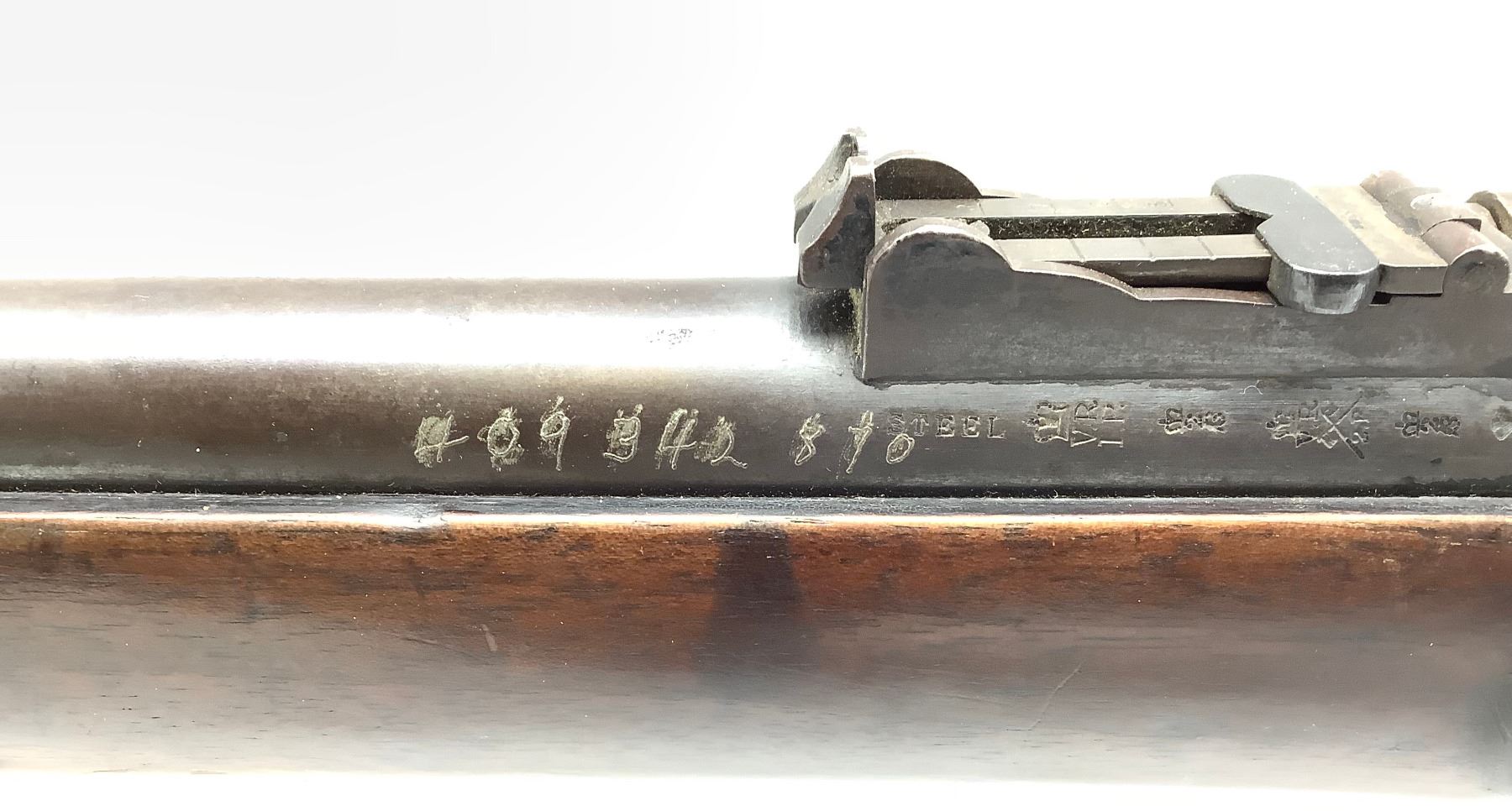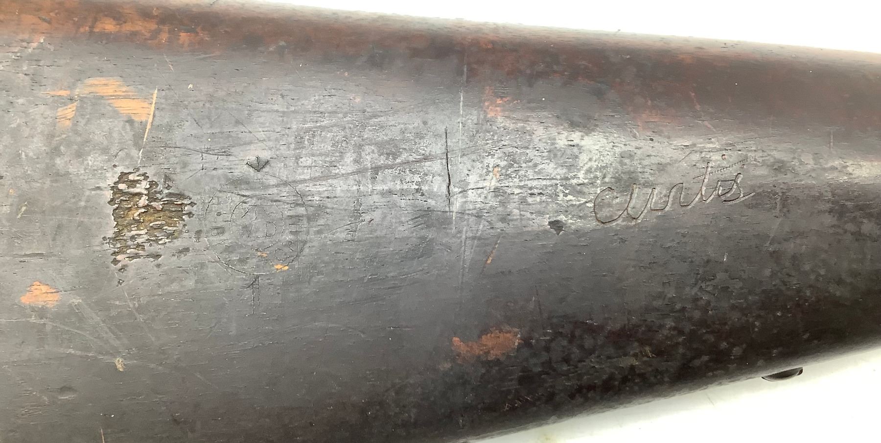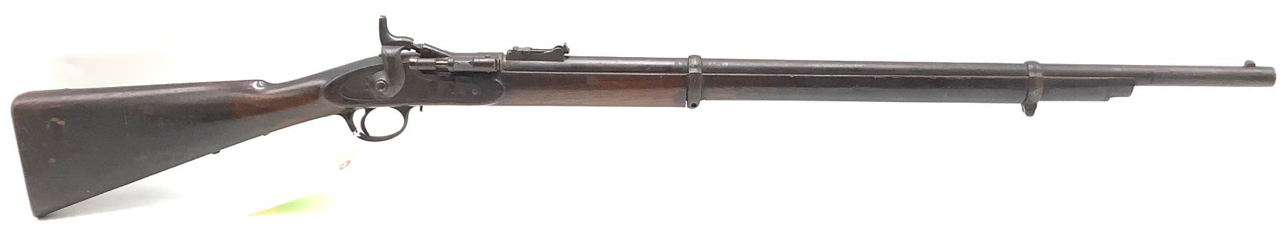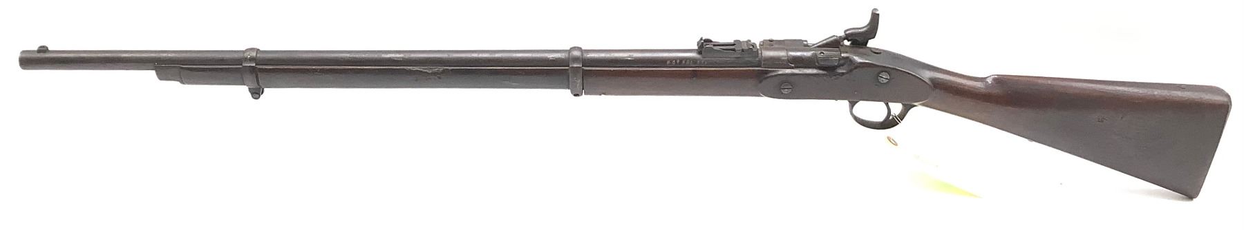 1872 BSA-manufactured Snider-Enfield Mk III breech-loading shirt service rifle chambered in .577 Snider. Good bore. Extractor spring is broken or missing, bayonet lug on the barrel has been ground off, a SIN number has been engraved on the barrel and a name has been engraved on the butt.