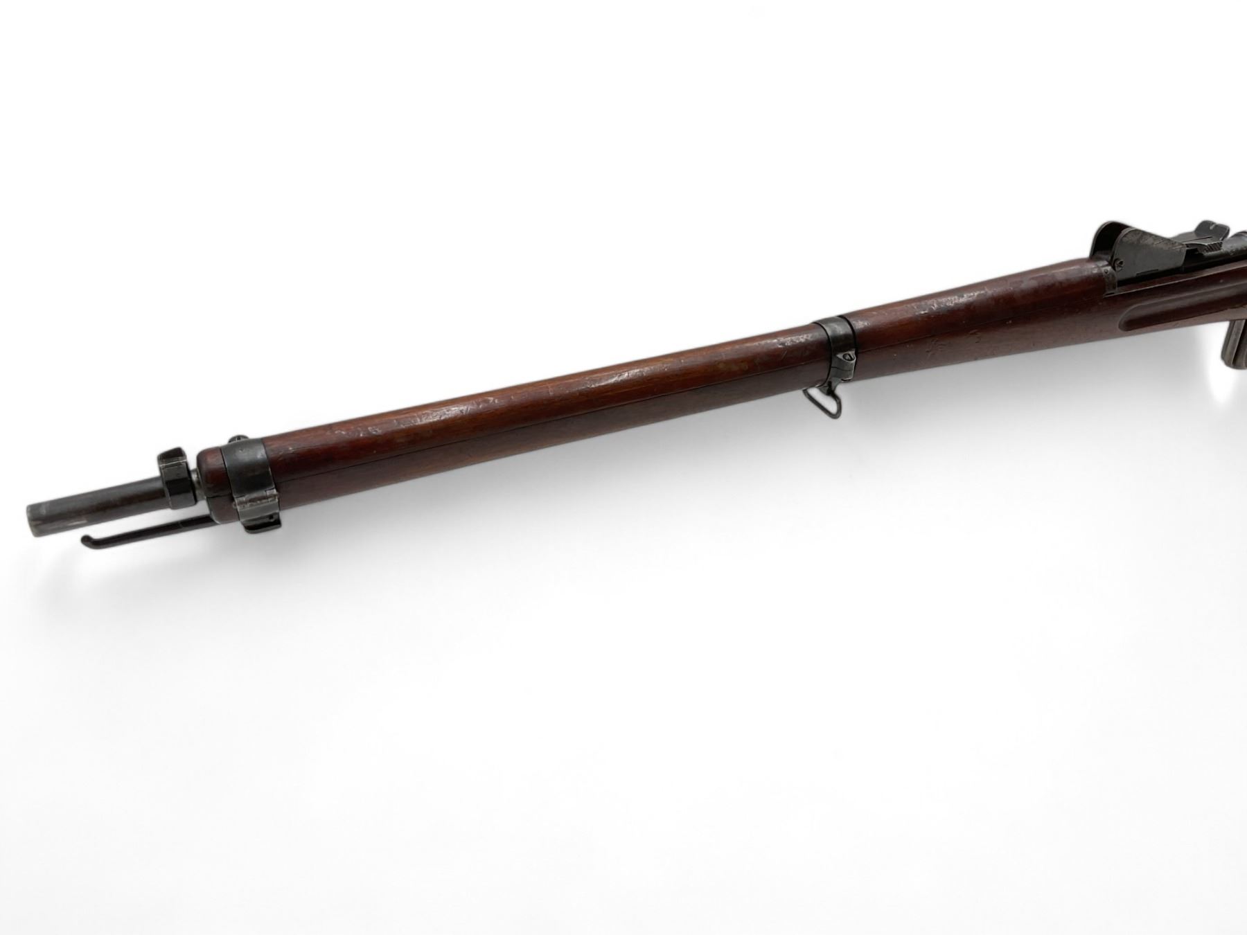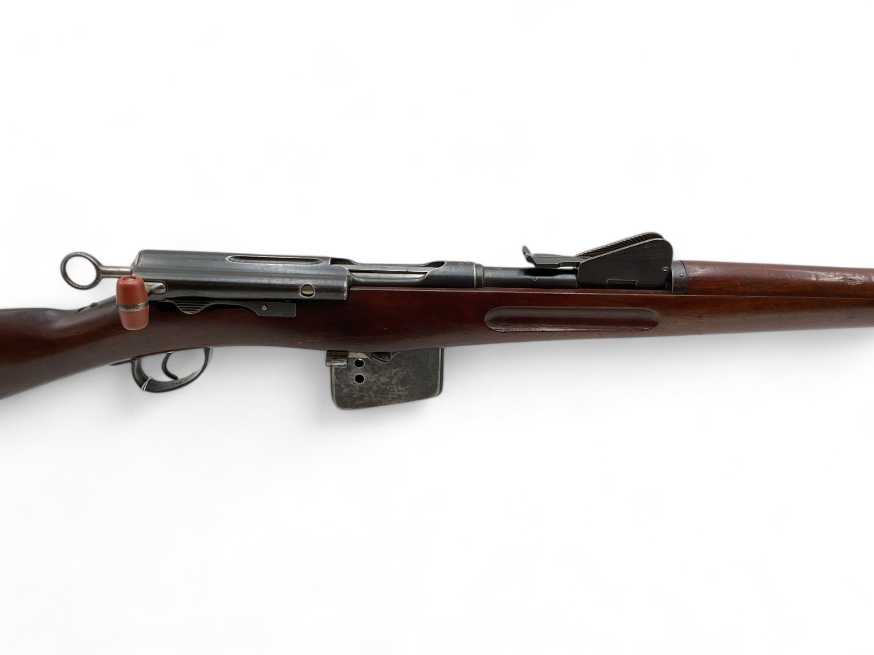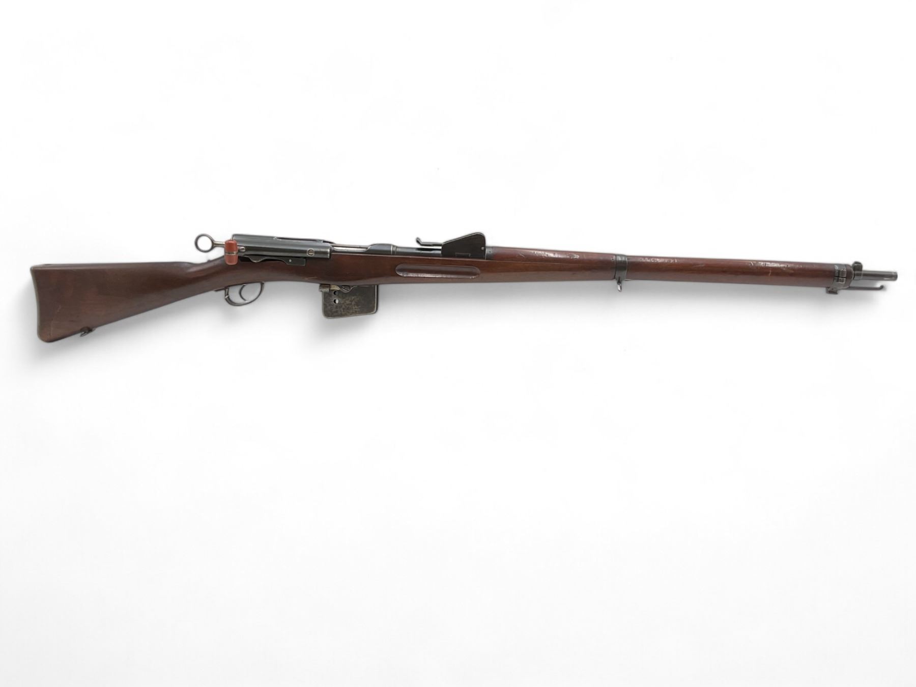 An 1892-manufactured Schmidt-Rubin Model 1889 straight-pull bolt-action service rifle. 31" barrel with bright bore chambered in 7.5X53.5. Wood stock. Factory open sights, 12-round detachable box magazine.