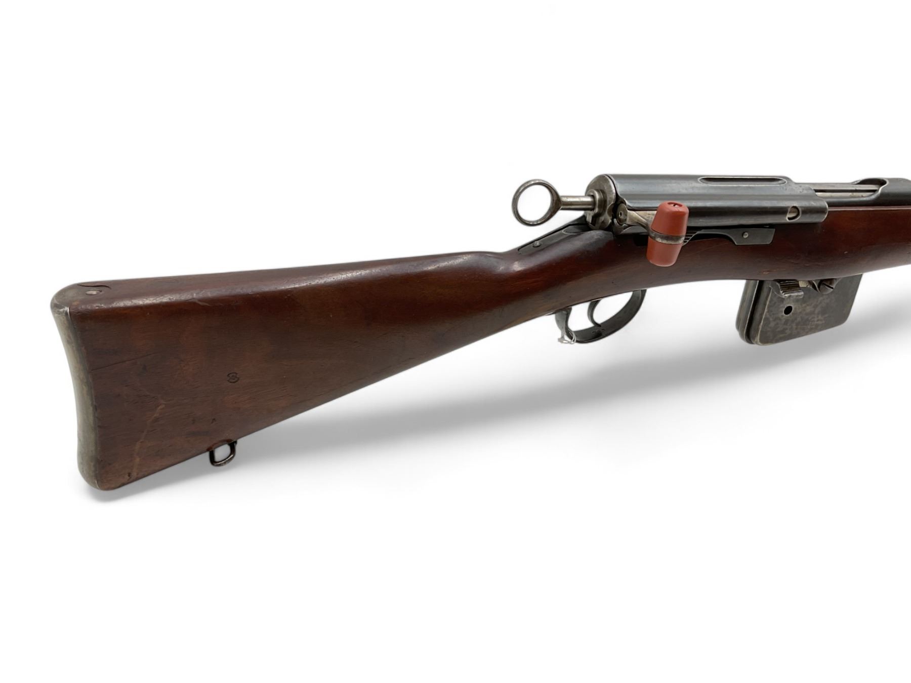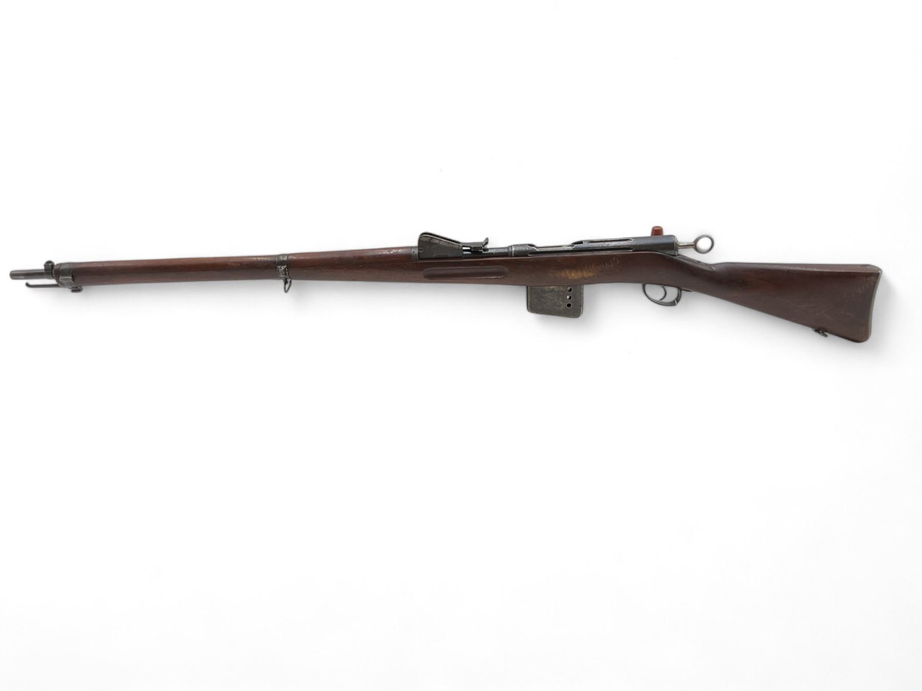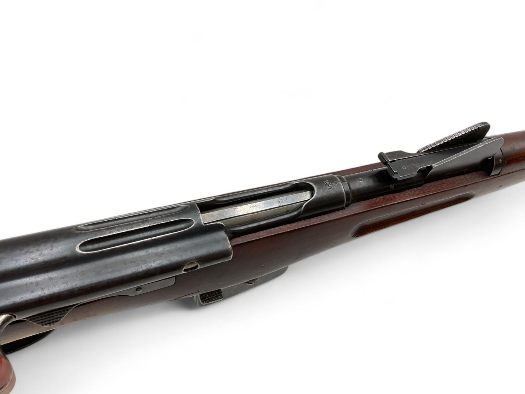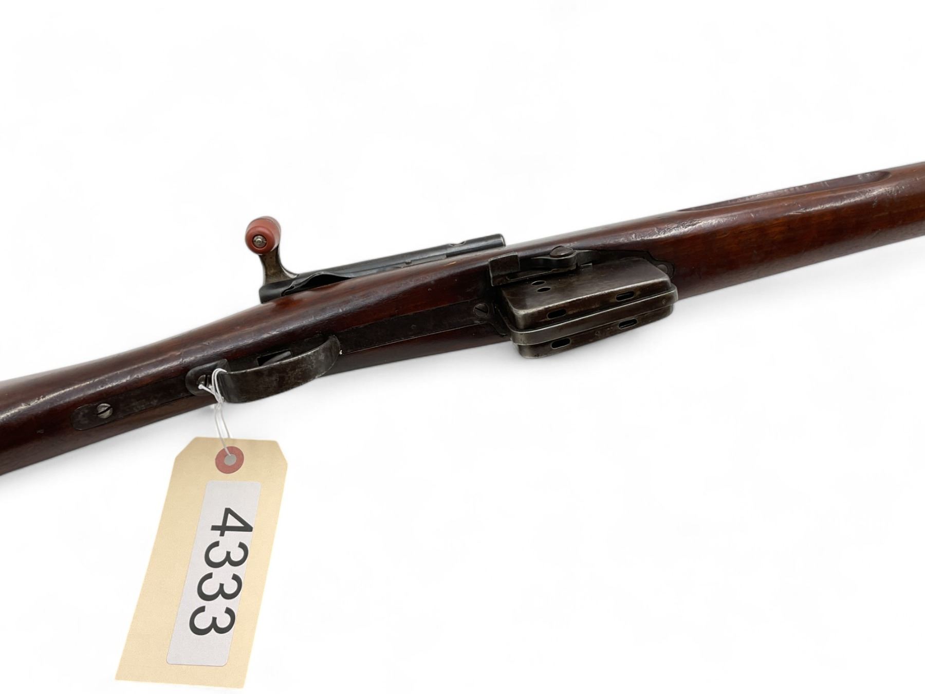 An 1892-manufactured Schmidt-Rubin Model 1889 straight-pull bolt-action service rifle. 31" barrel with bright bore chambered in 7.5X53.5. Wood stock. Factory open sights, 12-round detachable box magazine.