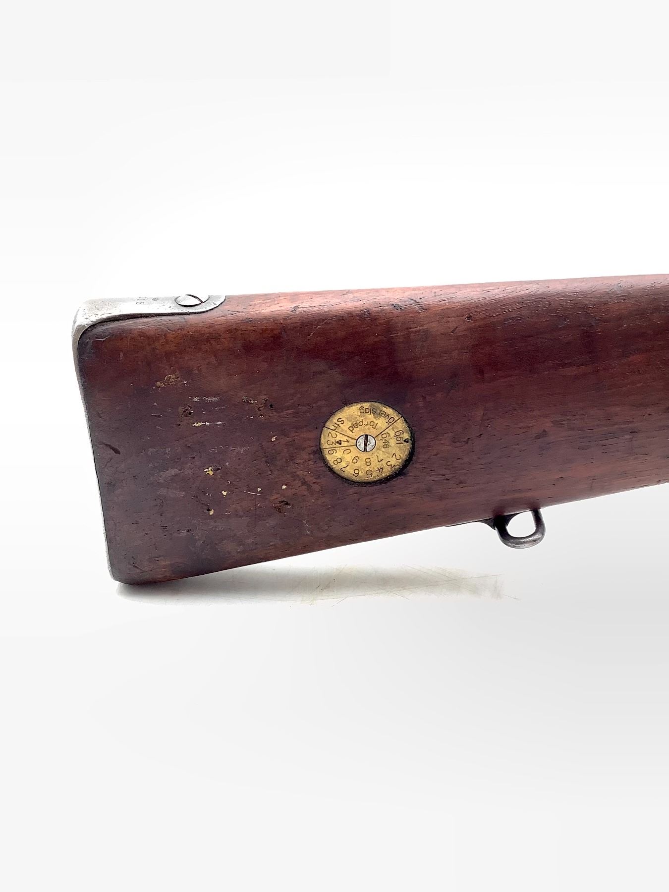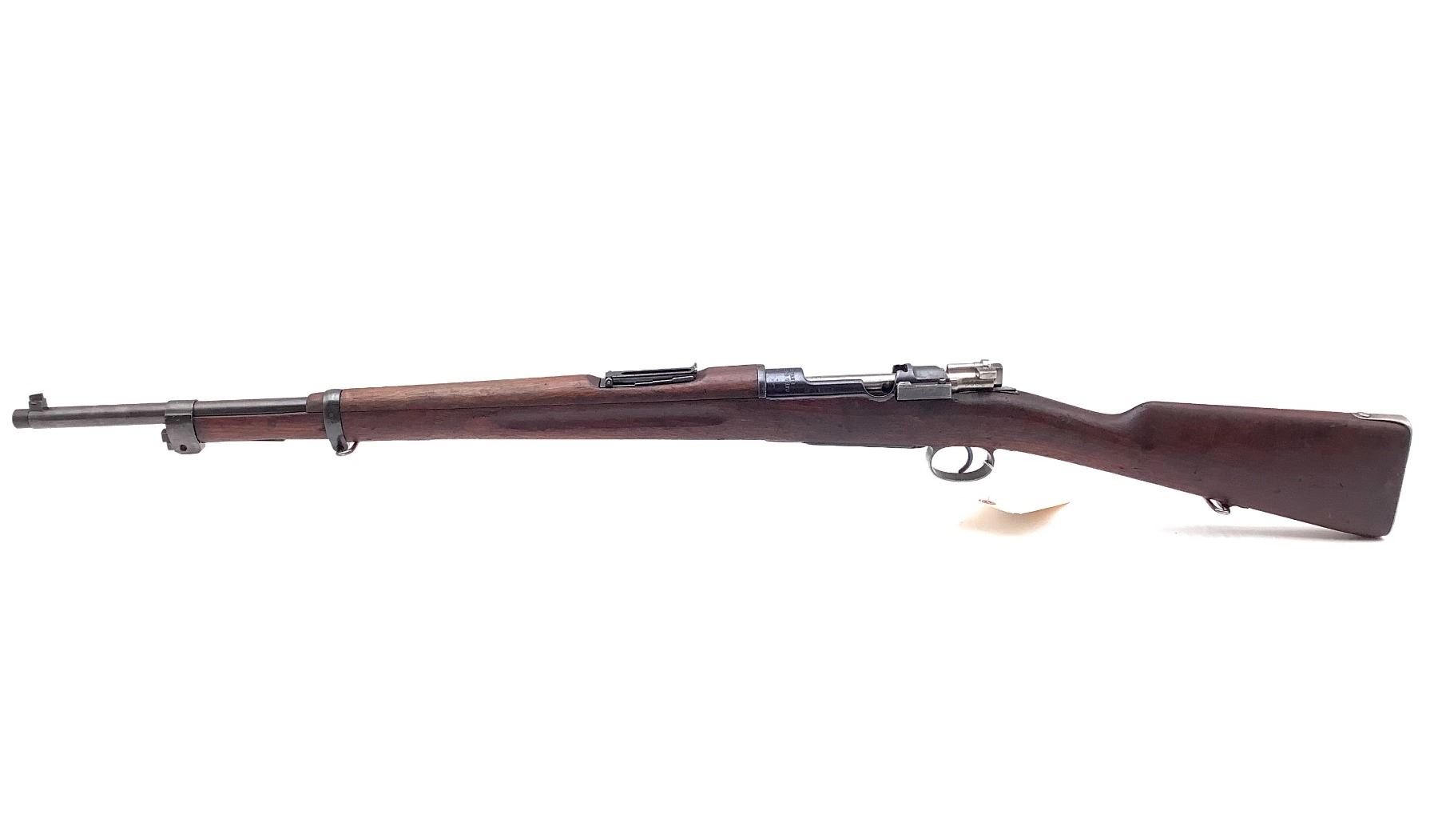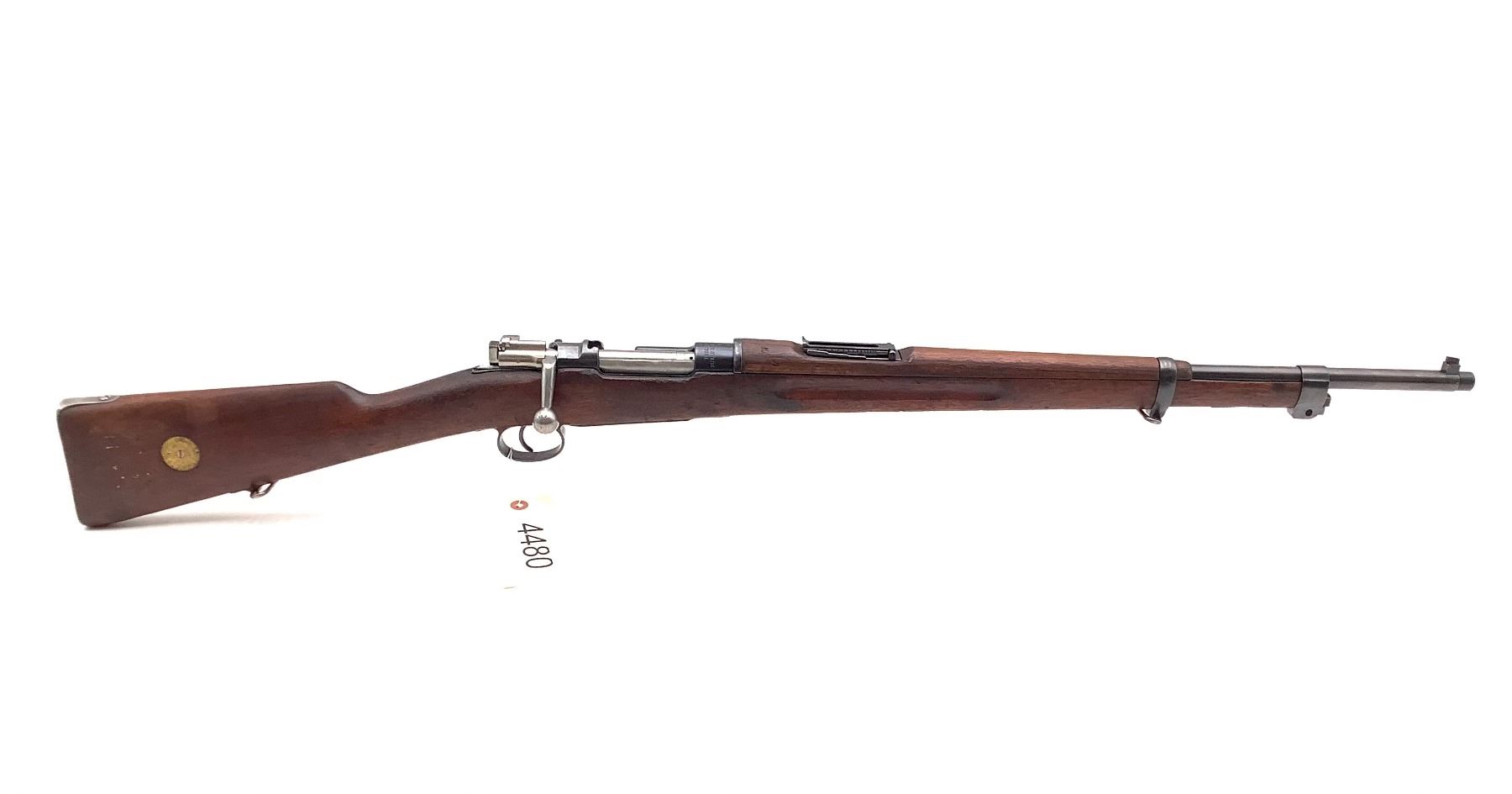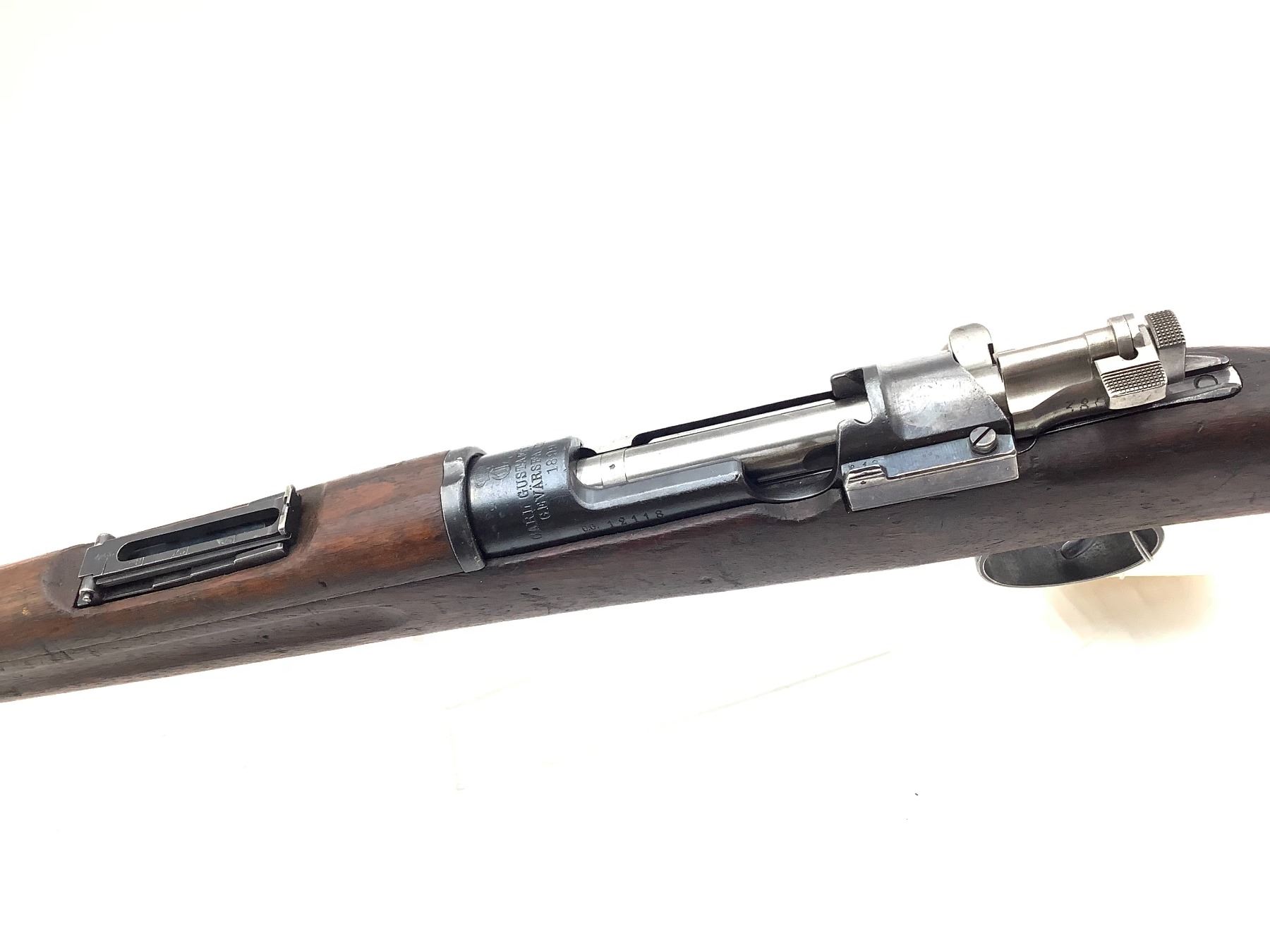 An 1899 Carl Gustafs-manufactured Swedish M38 Mauser. 24" barrel with good bore chambered in 6.5X55. Wooden stock, adjustable sights, internal magazine. Matching serial numbers on receiver, magazine, shroud, buttplate and front band. Ballistic data disk on the buttstock has been replaced with a blank disk.