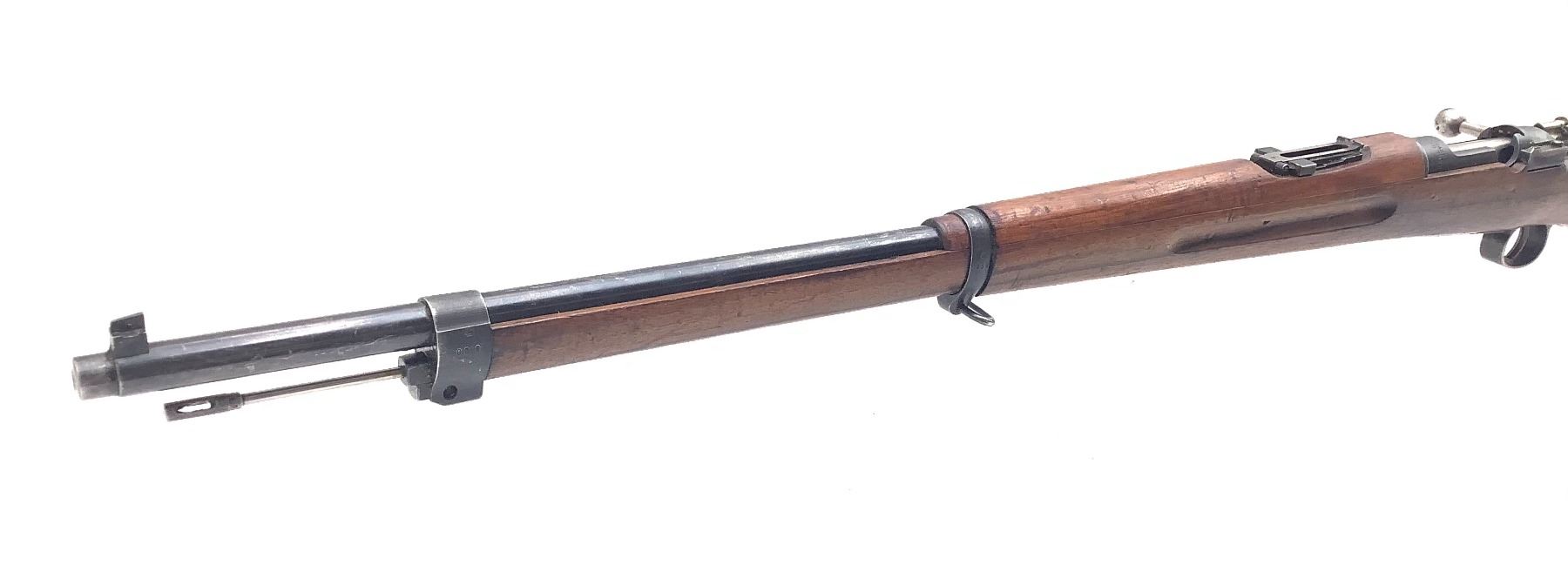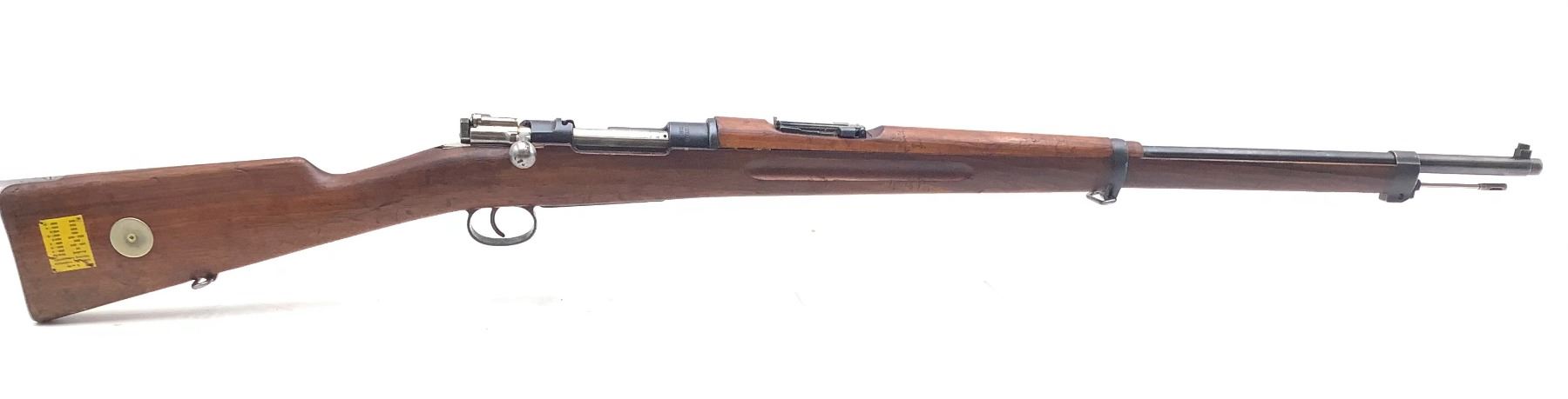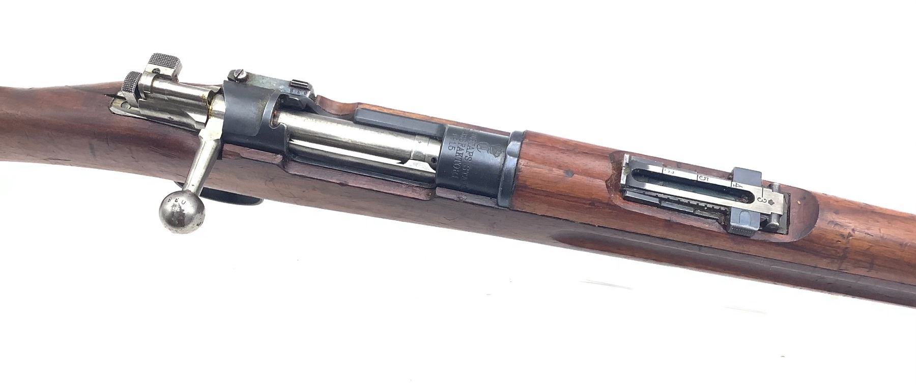 A 1915-manufactured Carl Gustafs Model 1896 Swedish Mauser bolt-action service rifle. 30" barrel with bright, shiny bore chambered in 6.5x55 Swedish. Adjustable sight, Stock and receiver have some marks. The stock disk has been replaced with a blank disk.
