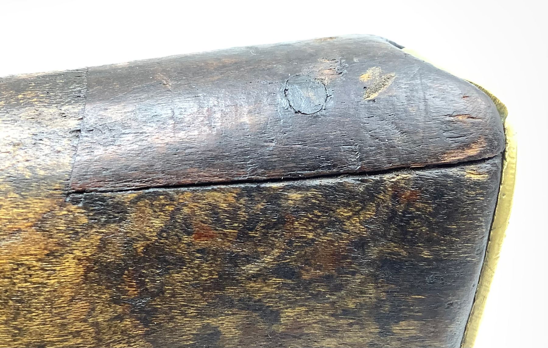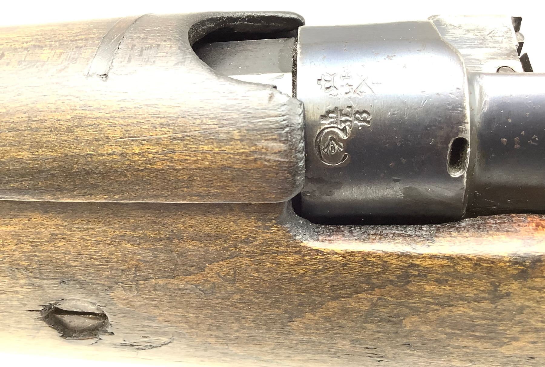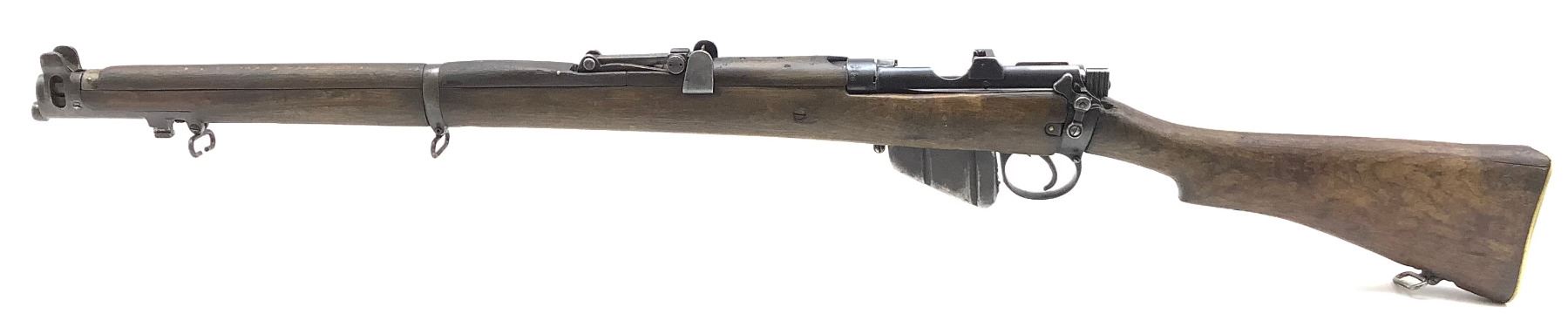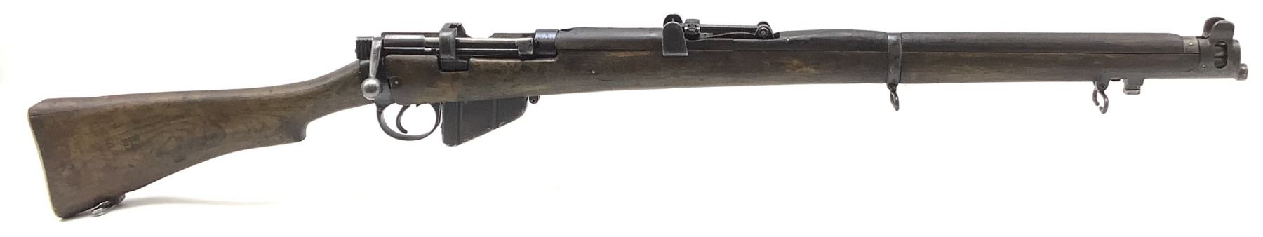 1918 Peddled Scheme Lee-Enfield No. 1 Mk. III* Canadian Army-marked service rifle (photo), .303 British-chambered barrel has frosted rifling. Matching serial numbers on bolt, receiver and rear sight leaf. Some blueing remaining and some finish going to patina. There is a repair on the buttstock that is starting to separate (photo).