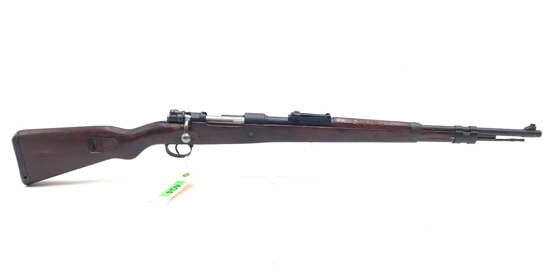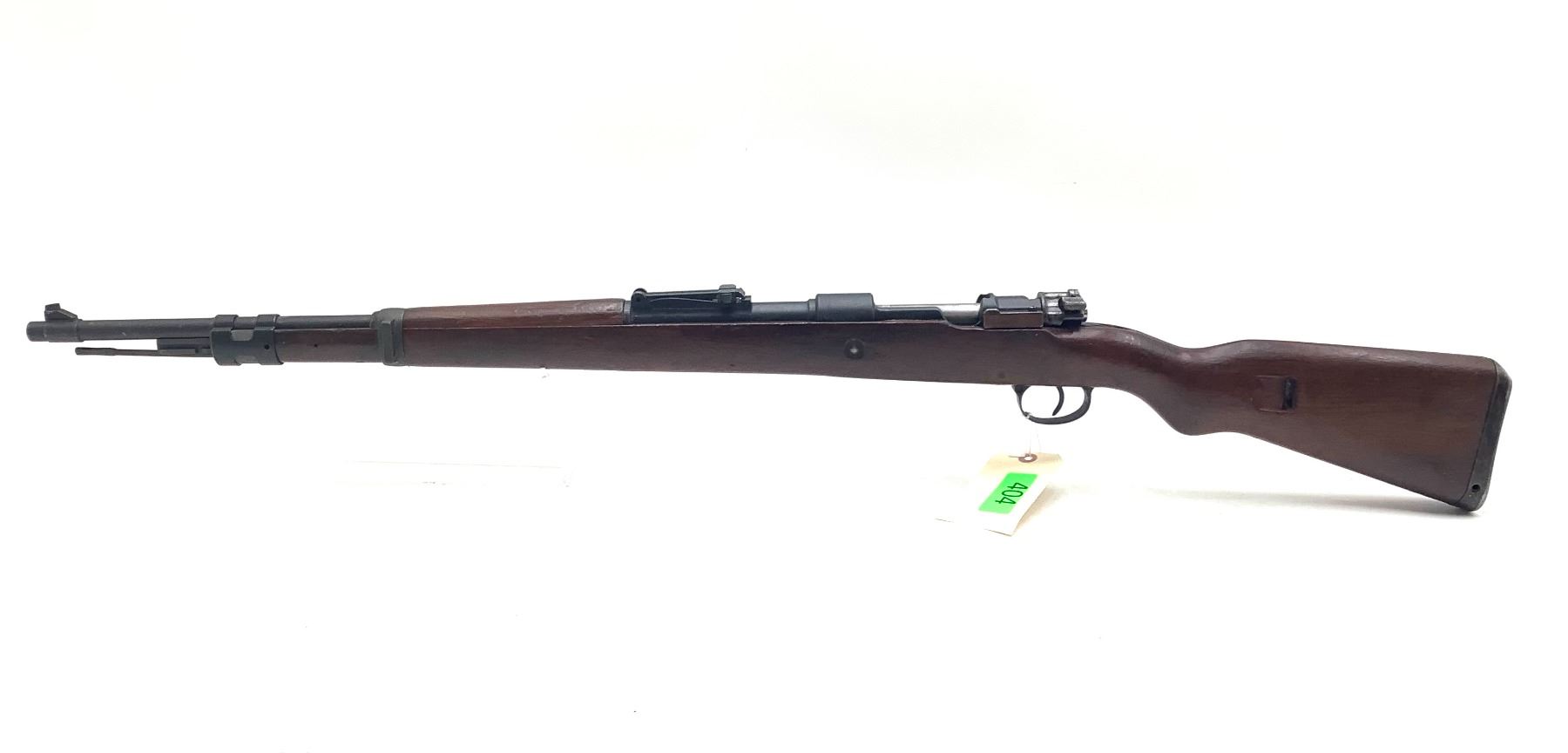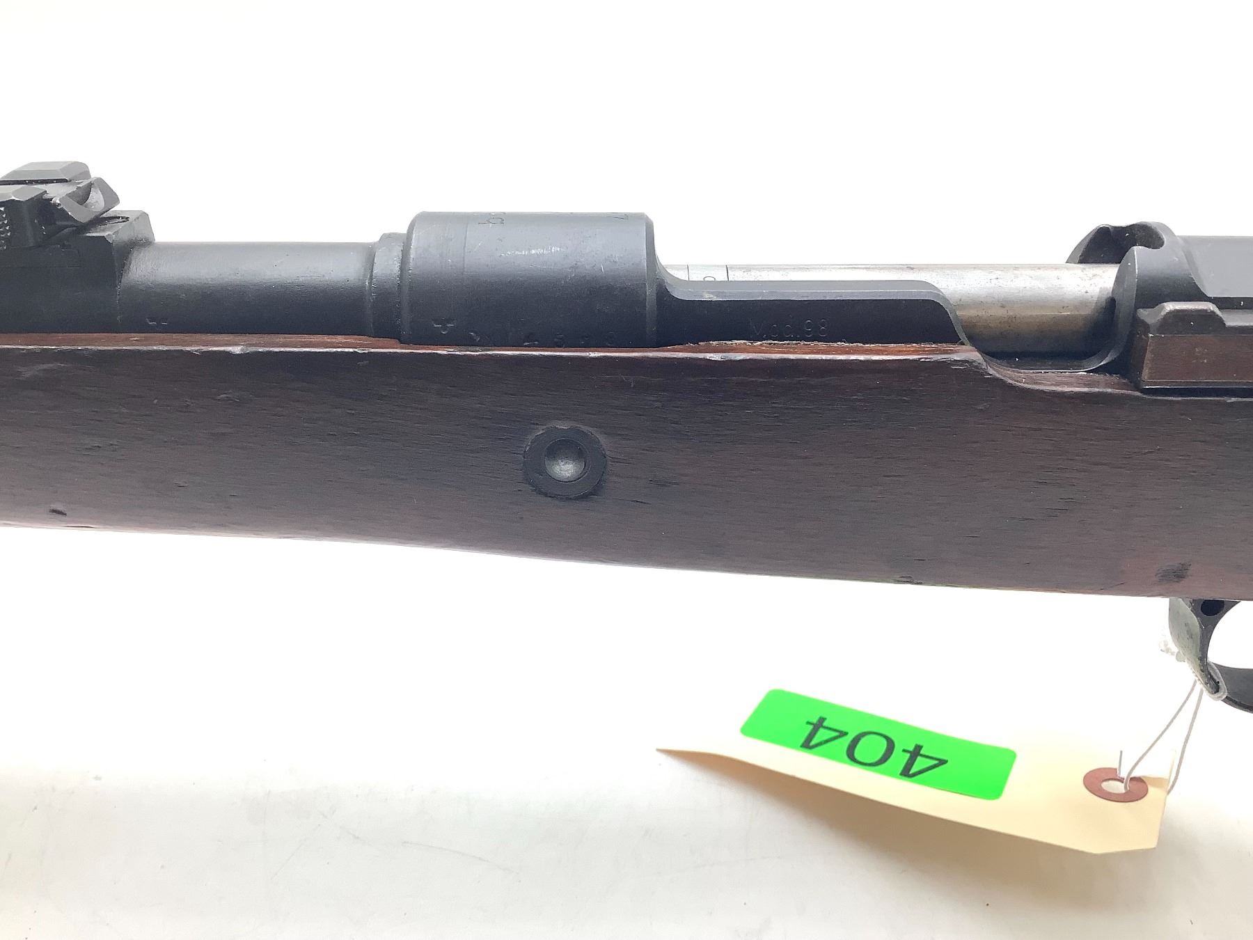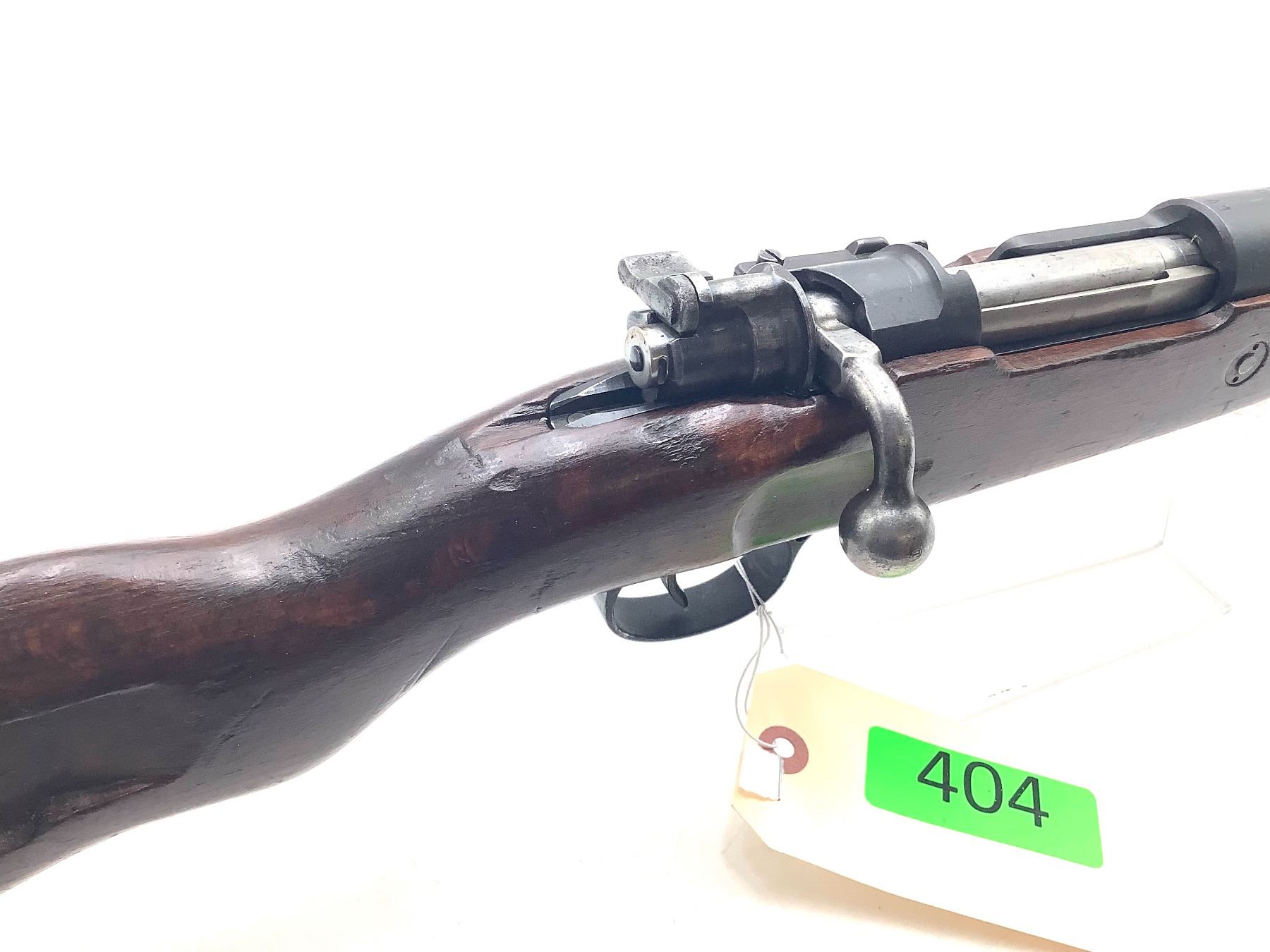 A 1941 Gustloff-manufactured Mauser Kar98K bolt-action service rifle. 24" barrel made by ERMA (Erfurter Maschinenfabrik) with good bore chambered in 8mm Mauser. Post-war Israeli 7.62-marked wooden stock. Fixed sights, internal 5-round magazine.
