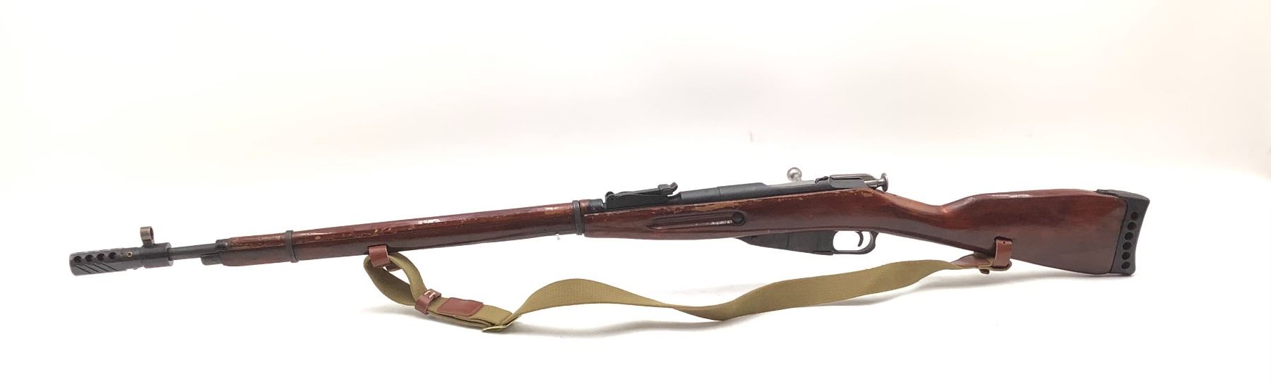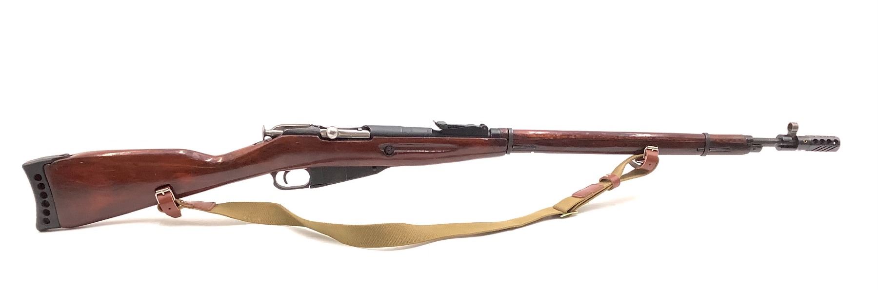 A used surplus 1941 Izhevsk Mosin-Nagant 1891/30 bolt-action service rifle chambered in 7.62 X 54R. Matching serial numbers on barrel, bolt and magazine baseplate. The stock has been fitted with a rubber recoil pad and a bolt-on muzzle brake. Some rust on bolt, otherwise good condition overall.