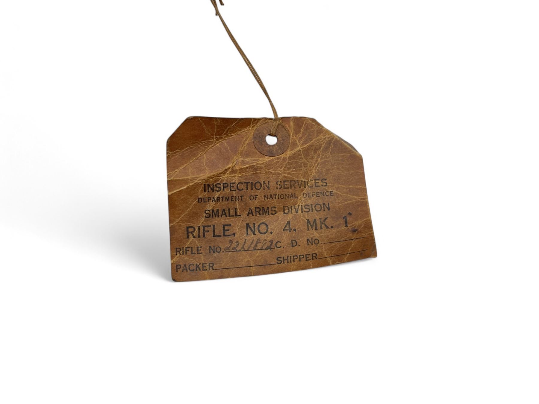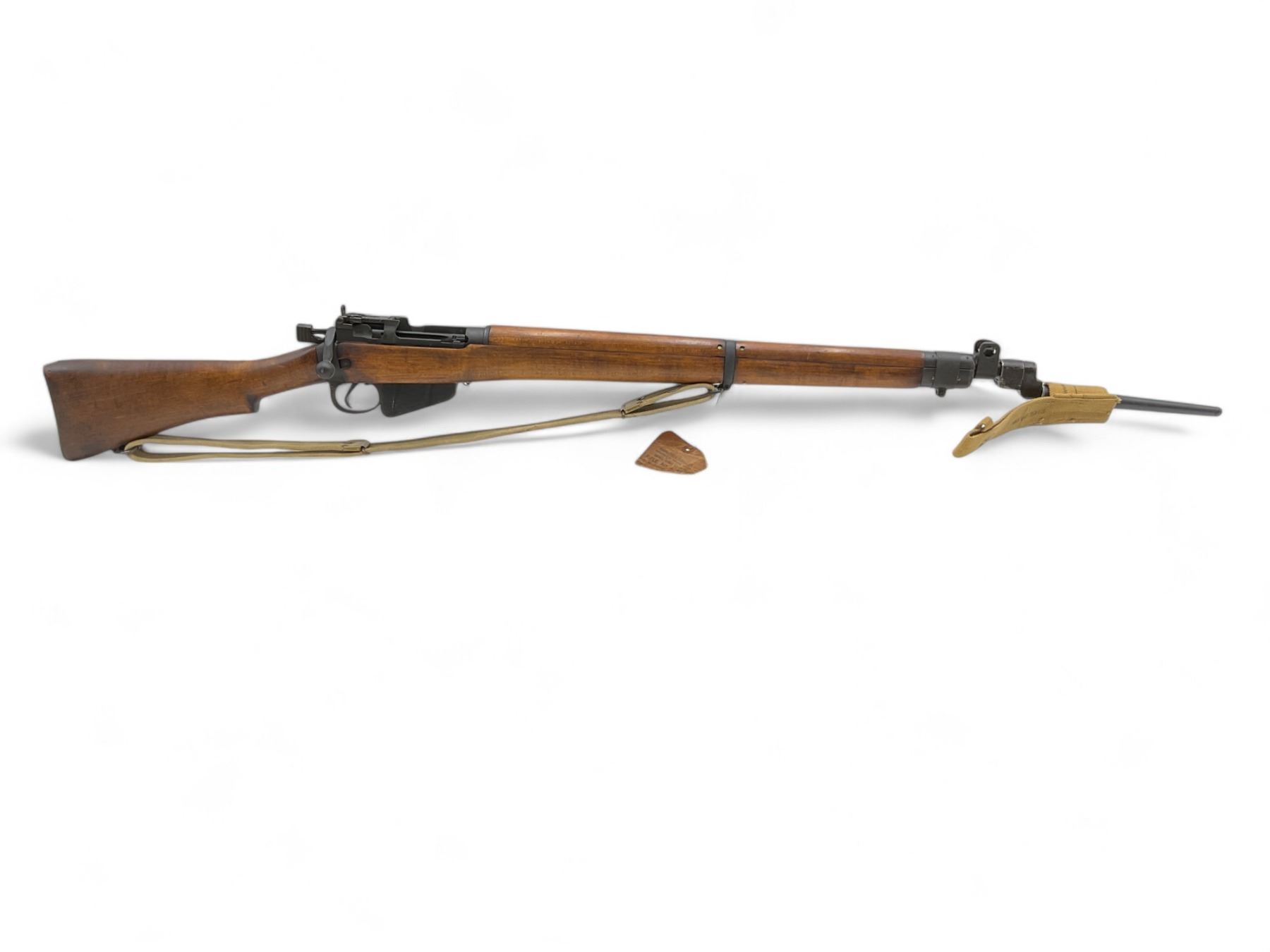 What appears to be an unissued 1943-manufactured Long Branch Lee-Enfield No. 4 Mk. I* bolt-action service rifle. 25.2" barrel with mirror-bright two-groove bore chambered in 303 British. Wood stock. Includes bayonet, scabbard and 1943-dated Pattern 1937 bayonet frog and sling. Consignor indicates this gun was unissued and they removed from the grease but we can not verify this. There is a rack number on the butt of the gun and some marks on the butt stock. Comes with sling and bayonet scabbard. Matching bolt and firearm serial numbers. Magazine is not serialized. Fitted with stamped British Mark III rear sights. Includes inspection hang tag.