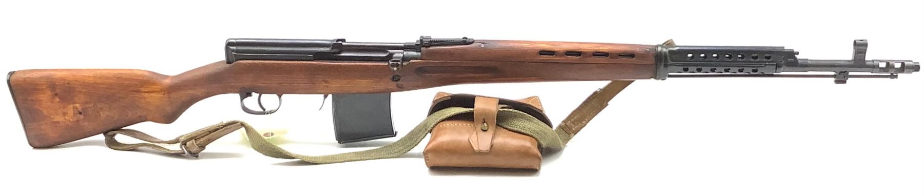 A surplus 1943 Mednogorsk-manufactured SVT-40 semi-automatic service rifle chambered in 7.62X54R. Matching serial numbers on receiver, bolt and trigger guard. Includes sling, leather magazine pouch and one magazine. Missing safety, otherwise good condition.
