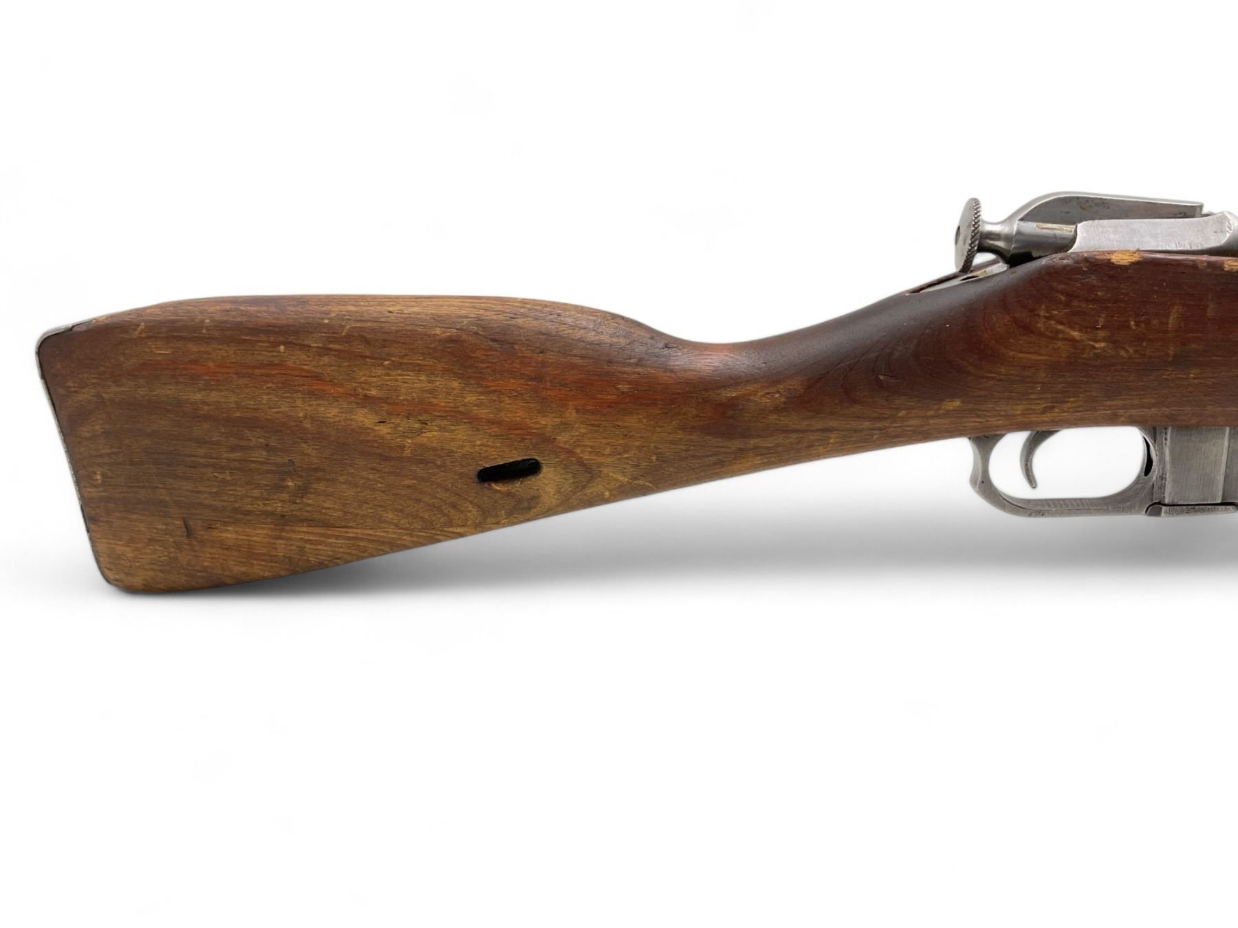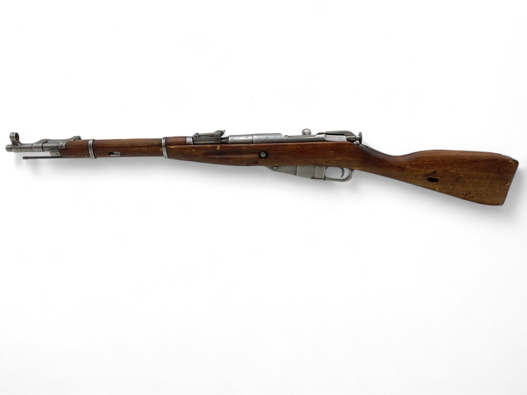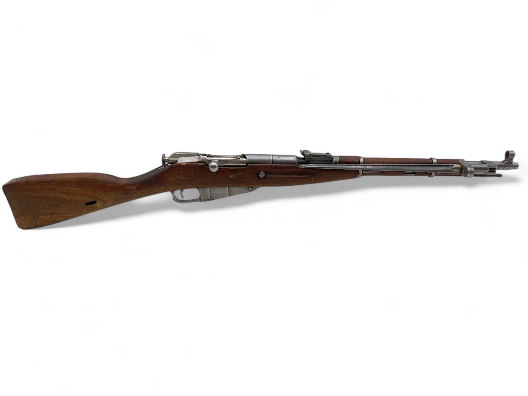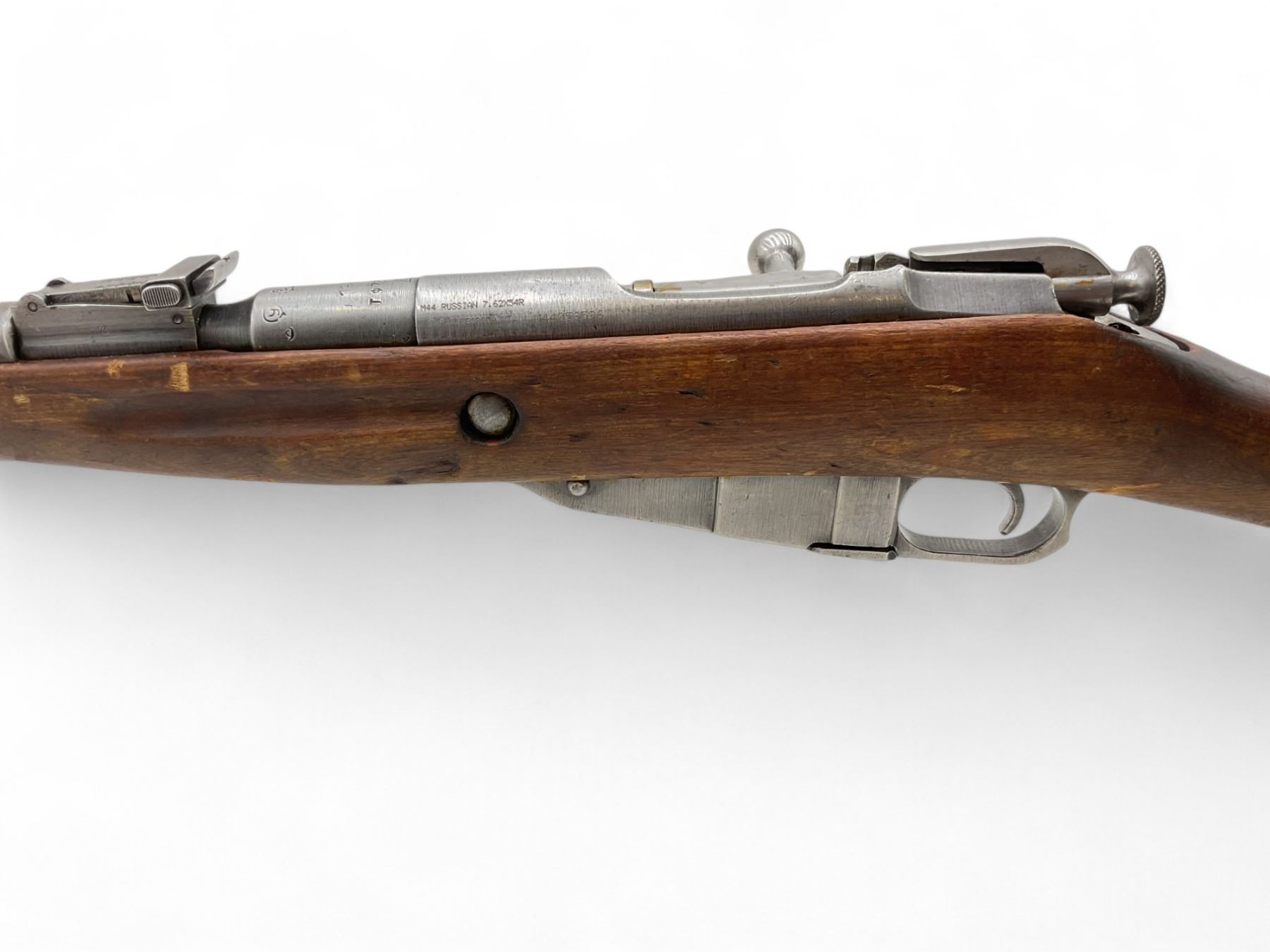 A 1945 Izhevsk-manufactured Mosin-Nagant M44 bolt-action service carbine. 21" barrel with good bore chambered in 7.62X54R. Wood Stock. External fixed magazine, factory sights. Side folding bayonet.
