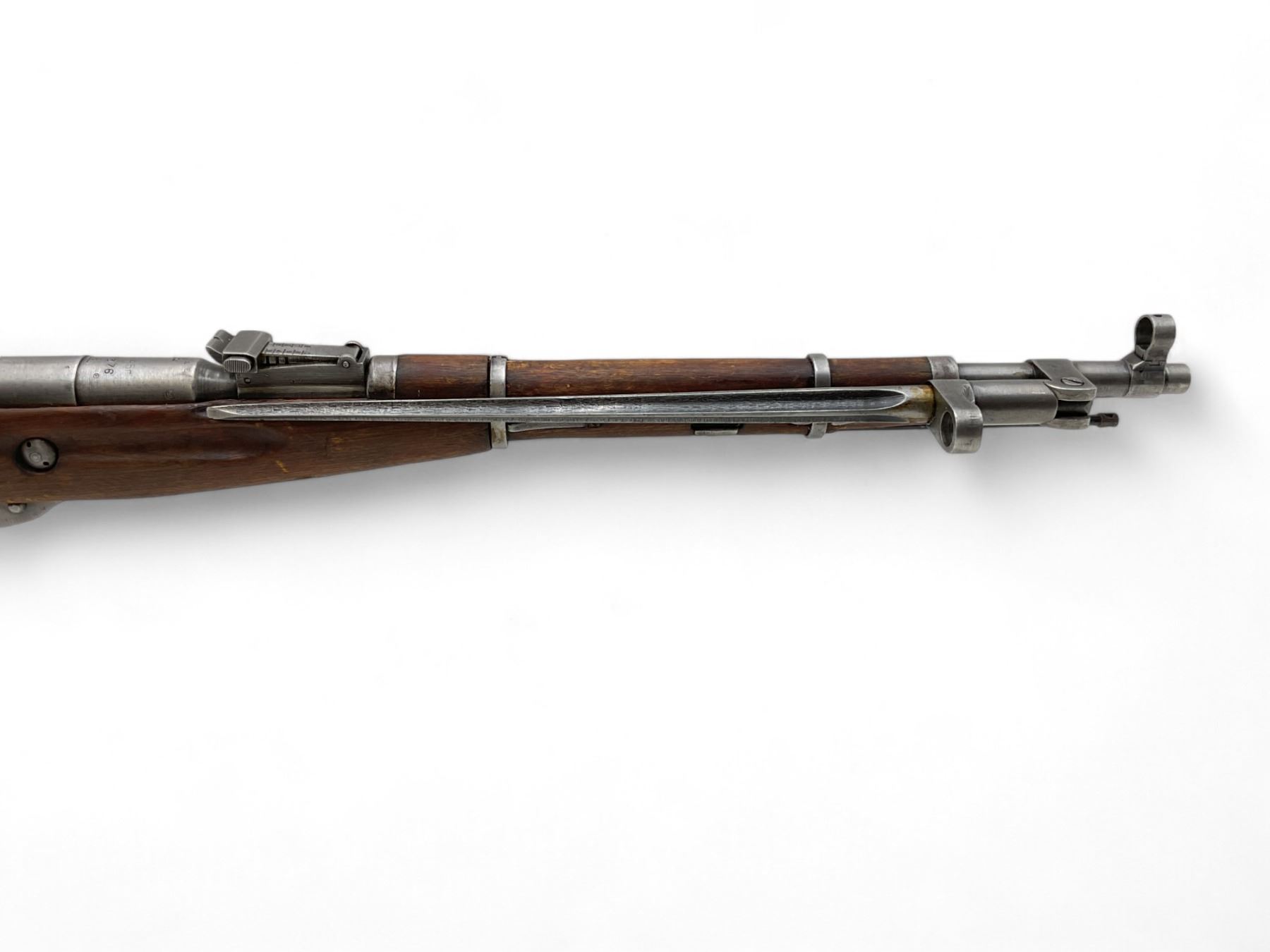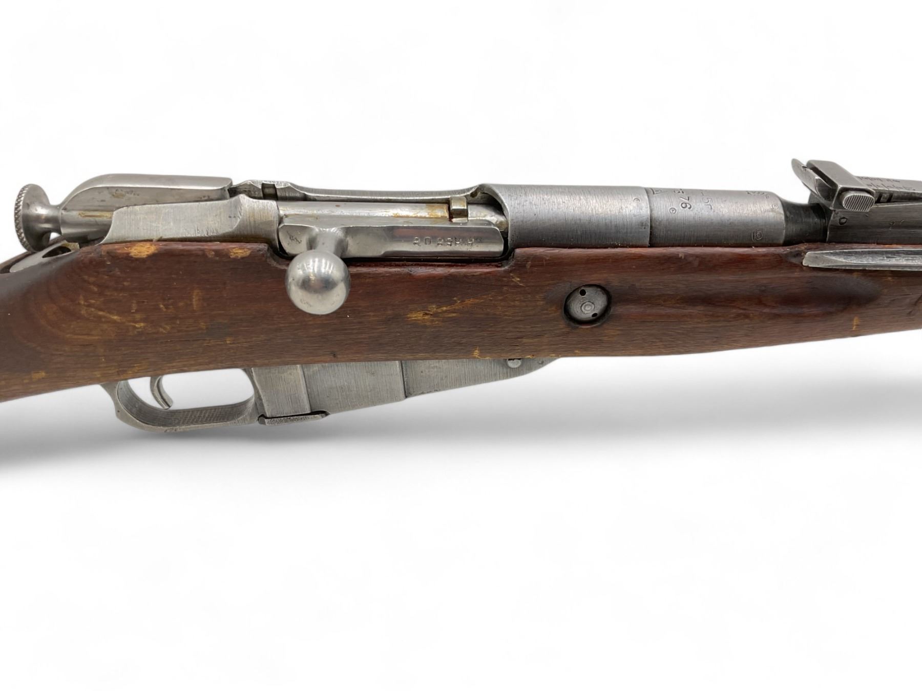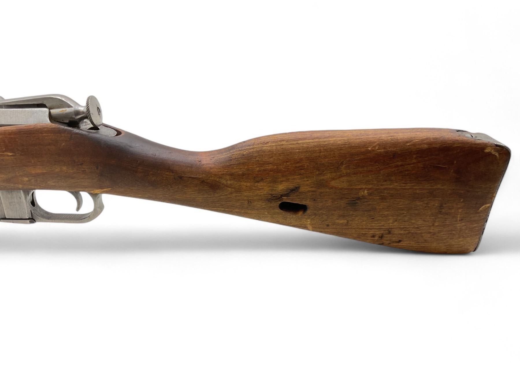 A 1945 Izhevsk-manufactured Mosin-Nagant M44 bolt-action service carbine. 21" barrel with good bore chambered in 7.62X54R. Wood Stock. External fixed magazine, factory sights. Side folding bayonet.