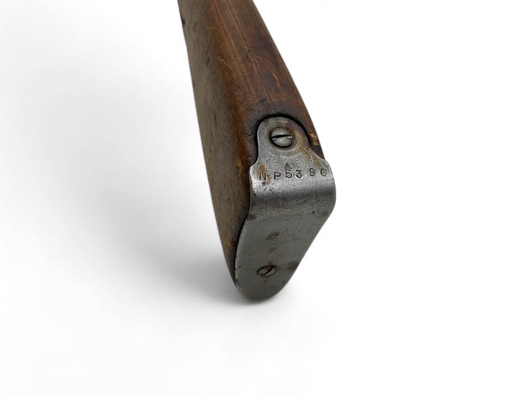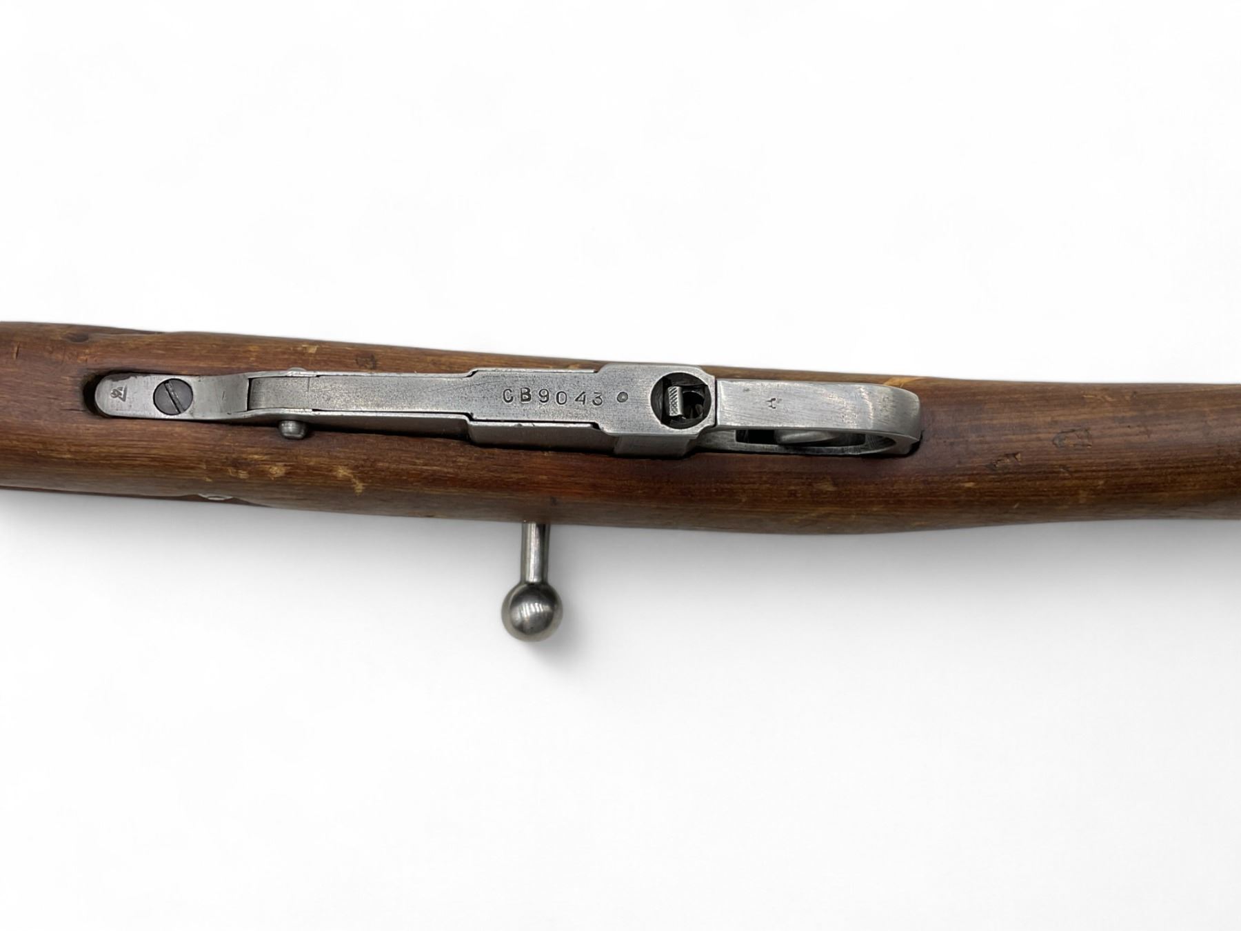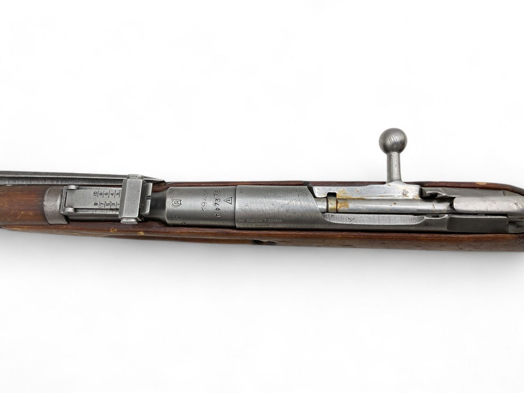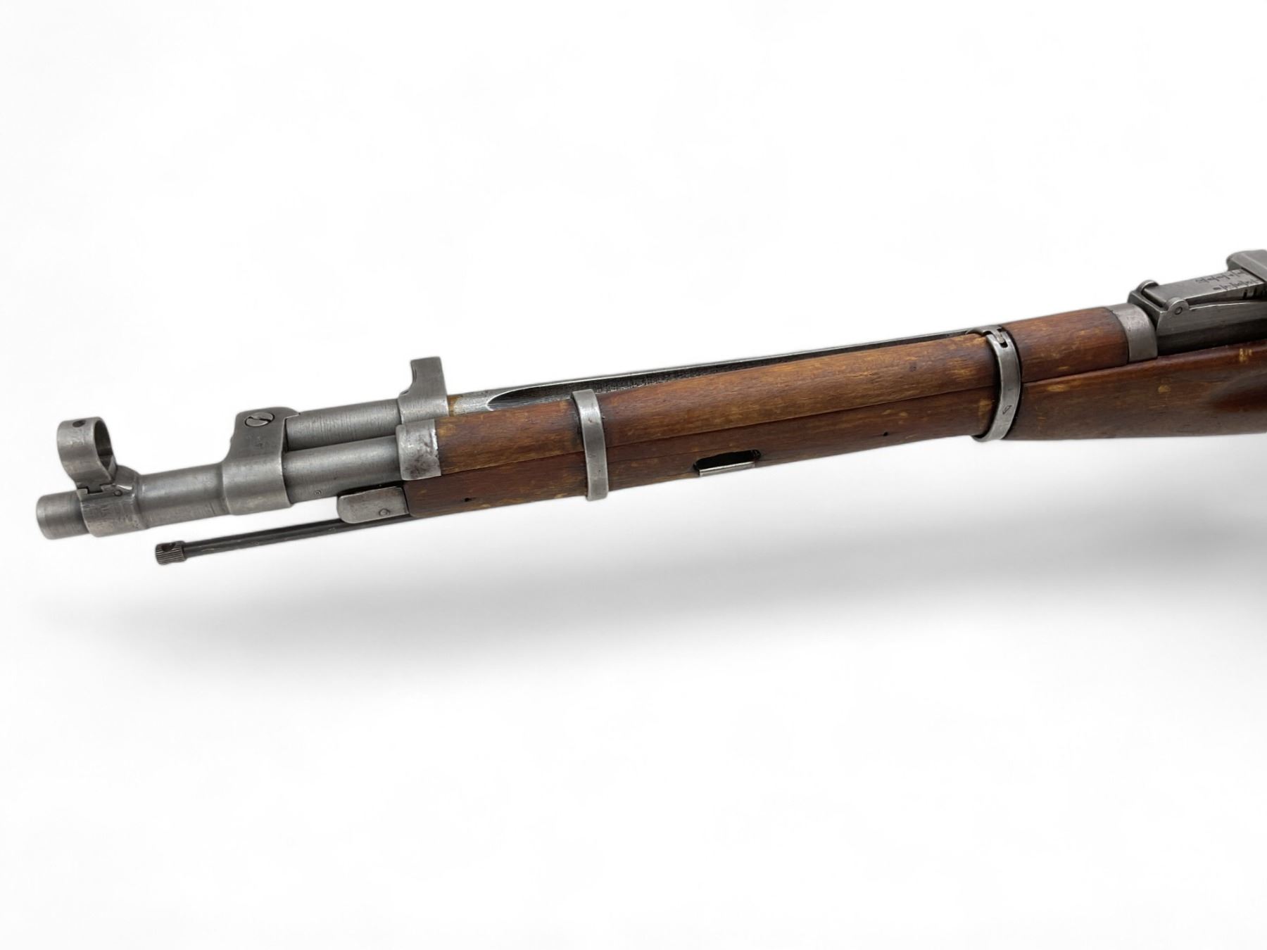 A 1945 Izhevsk-manufactured Mosin-Nagant M44 bolt-action service carbine. 21" barrel with good bore chambered in 7.62X54R. Wood Stock. External fixed magazine, factory sights. Side folding bayonet.
