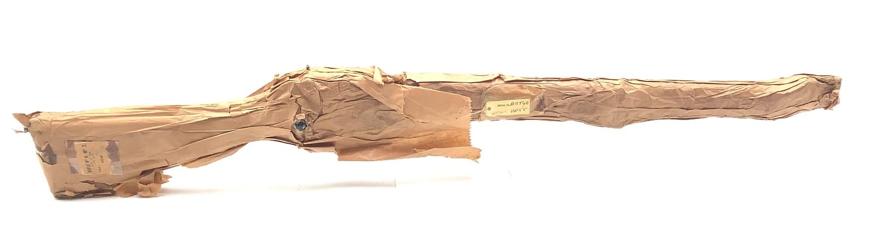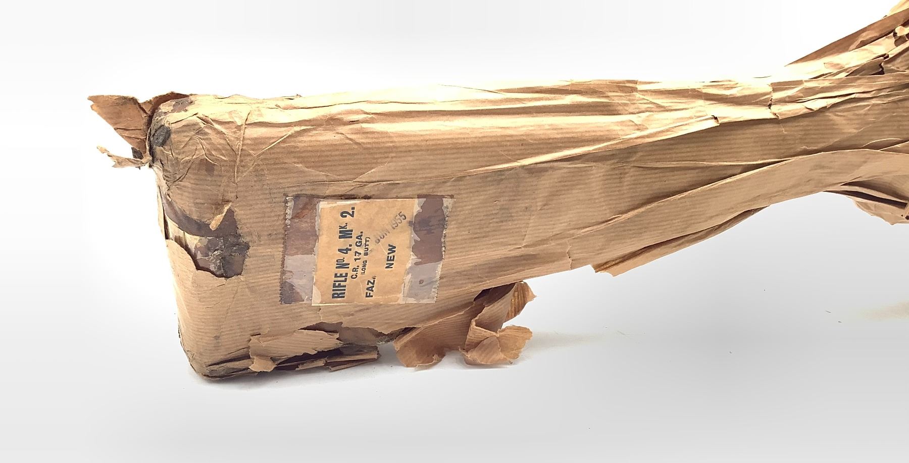 A June 1955 Royal Ordnance Factory Fazakerley-produced Lee-Enfield No. 4 Mk. 2 bolt-action service rifle. 25" barrel chambered in 303 British. This rifle is still in the original ordnance paper wrapping and cosmoline.