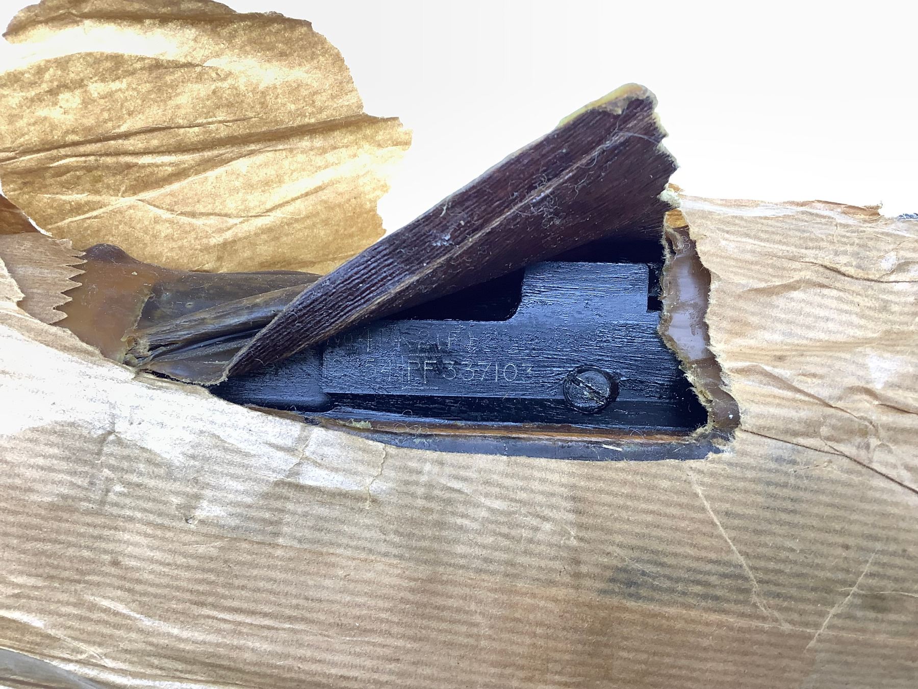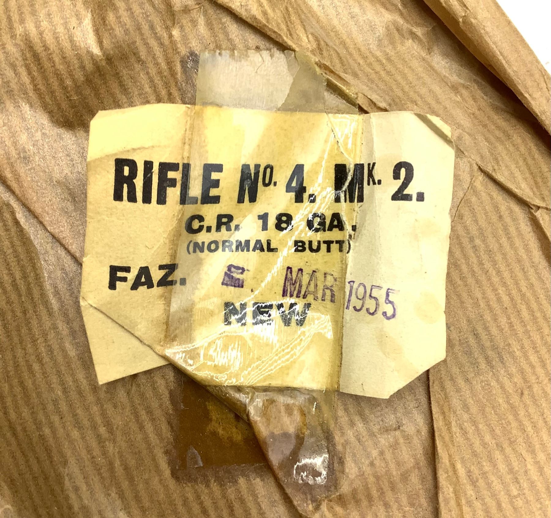 1955 Royal Ordnance Factory Fazakerley-manufactured Irish-contract Lee-Enfield No. 4 Mk 2 bolt-action service rifle chambered in .303 British. Rifle is brand-new in preservative and includes a bayonet and scabbard, also in preservative. The wrapping has been opened in one spot to confirm the serial number, see picture.