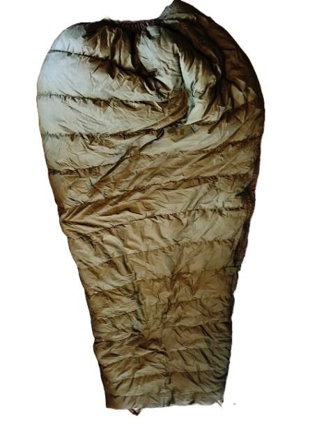 These sleeping bags are made of water-repellent poplin cotton outer shell with 100% polyester filling. They feature a 64" long zipper, offset stitching at the seams and a 3" storm flap with snaps over the zipper. rated for -10°F. Mummy style bags with a draw cord hood. These bags are 93" long, 30" wide at the top and 14" at the bottom and weigh 8lbs. They were issued from the 1970's into the early 2000's.