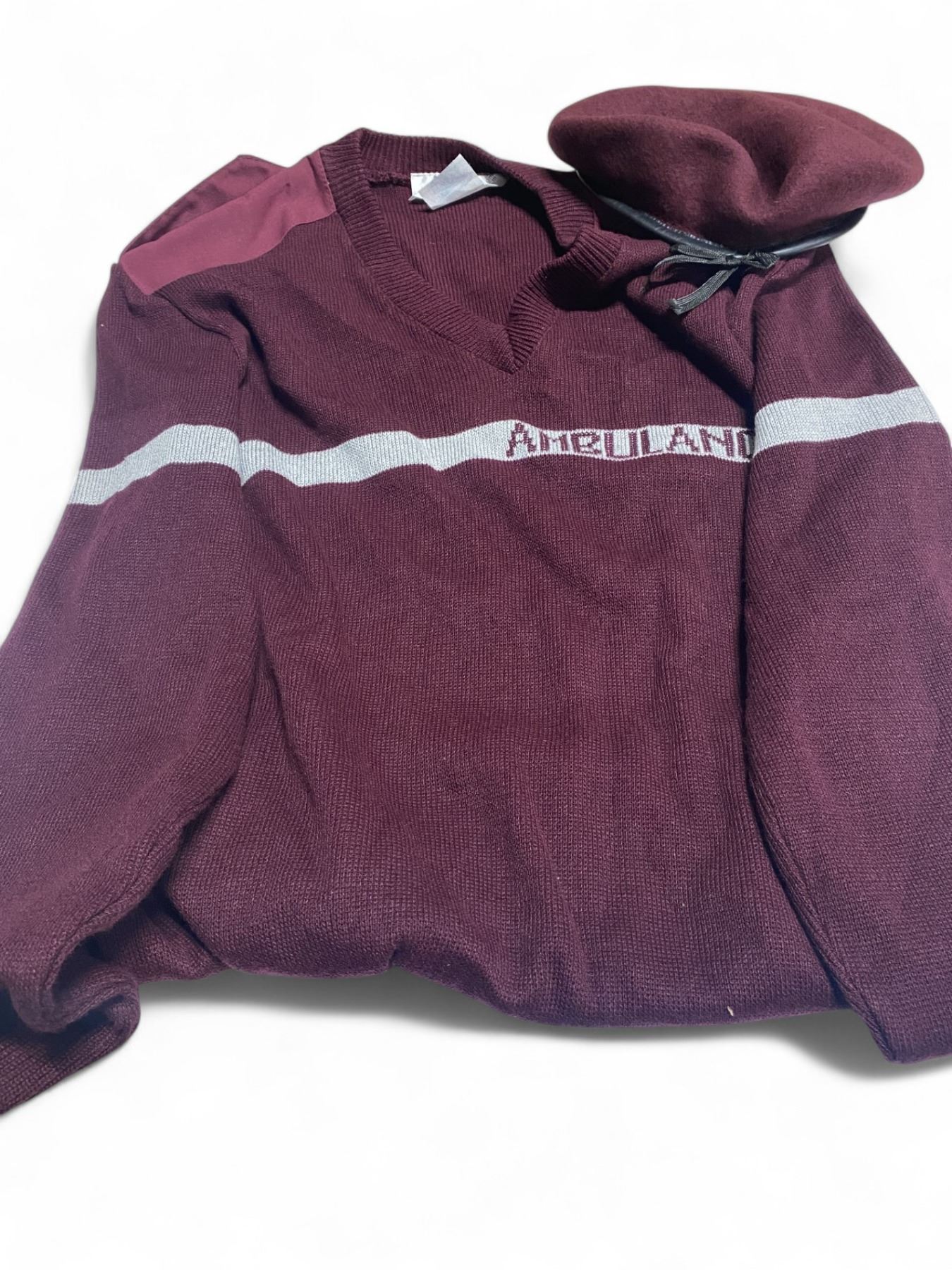Ambulance V Neck Pull over Burgundy Sweater 1x Burgundy Beret Size 7 3/8