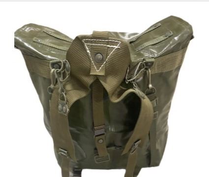 Great water resistant bag from the Czech Army. This is a good general purpose bag that will keep out the rain. A large main compartment and 2 smaller ones will fit all of your gear. Two narrow shoulder straps are attached to the pack with spring hook attachments and comes with wider shoulder strap harness. These may have some marks or fading from storage but are in very good condition. Keep your kit dry and slap it in one of these.