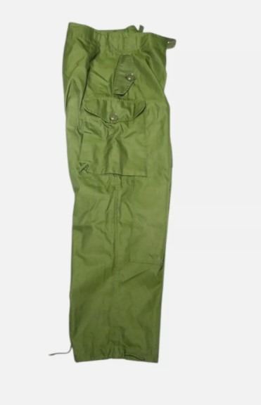 Canadian Army Issued Wind Pants. OD green army surplus.,Consists of 4 pockets (2 large and 2 small) , Large green army buttons (none missing) , Zipper front and heavy duty pull string closure , Reinforced stitching and reinforced knees, Pull String closures at bottom of legs, Reinforced seat