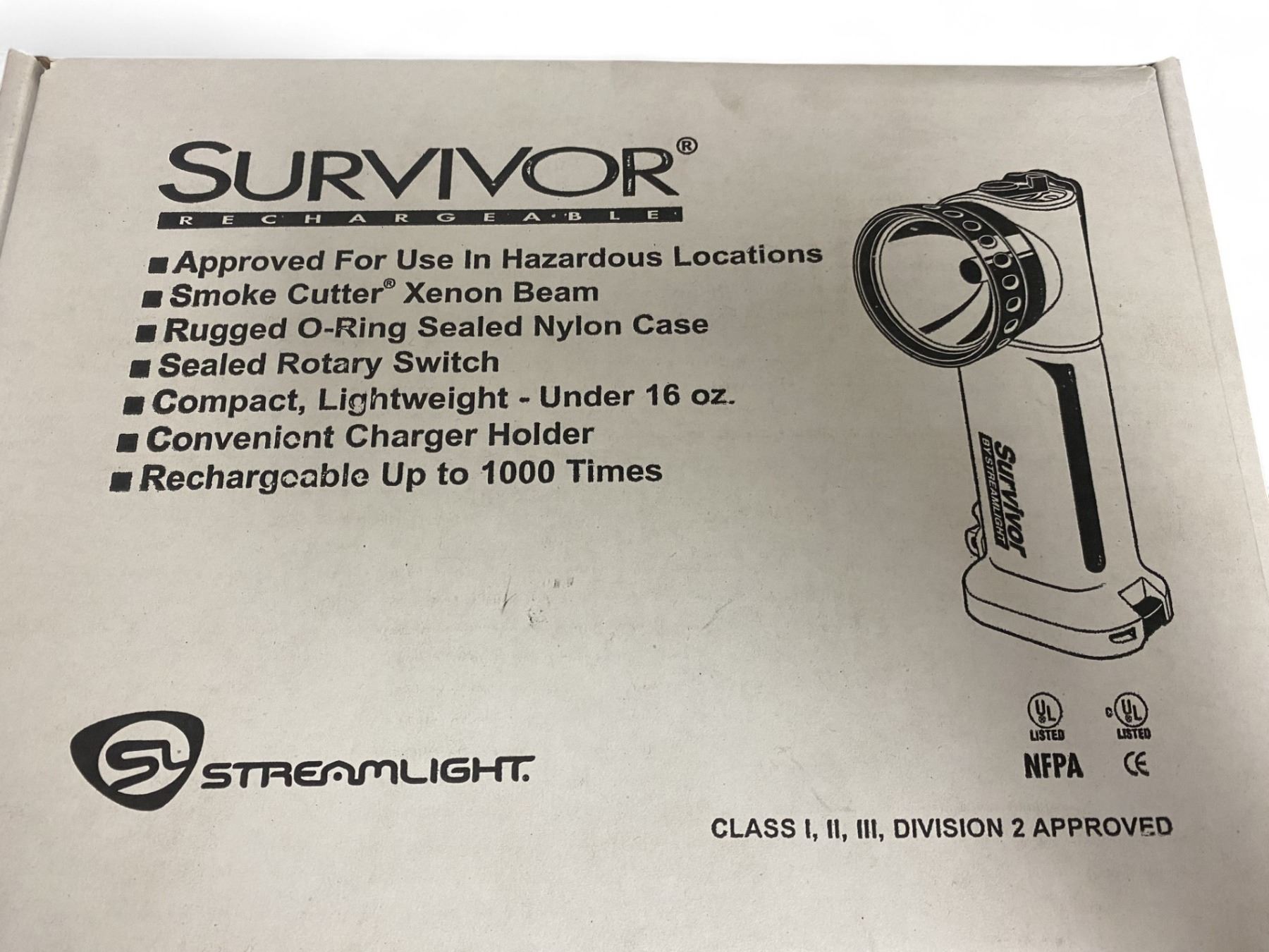 Streamlight SL90264: Yellow Survivor Flashlight W/ 12V DC Fast Charger Right angle head. Quick-change battery. The new steel hinged door and latch of the Division 2 model allow for quick loading of a spare battery. Brighter than ever. The Division 2 model features the 5.5 watt "black dot" xenon bulb with up to 25000 candlepower and "SmokeCutter®" optics. Up to 1.7 hours of continuous use between charges. New spring-loaded clip with a built in attachment ring that works with belts and harnesses.Non-incendive rotary switch with a 1/4" high actuator provides easy operation even with heavy gloves.Unbreakable Lexan® lens with anti-scratch coating. Nicad battery pack Color: Yellow