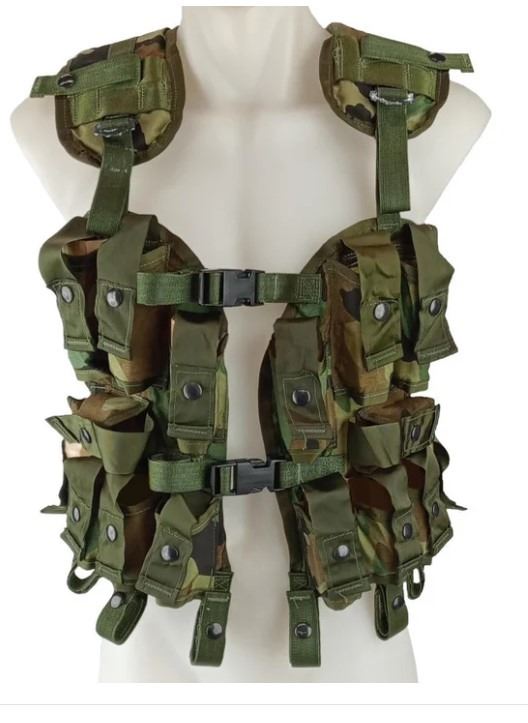 This genuine US Military issue load bearing woodland camo vest is constructed with lightweight yet durable nylon fabric with 1/2" foam padding for shoulder protection. It features sewn-in pouches, two buckles for secure fastening and adjustable draw-cords that are connected to left, right and back panels in a corset lacing system secured by cord lock. This USGI Woodland Grenade Load Bearing Vest is ideal for carrying 40mm grenades. This vest can hold a total of 14 HE Grenades and 4 x 40mm special purpose grenades in permanently attached grenade pockets. Wear with the standard equipment belt and enjoy a comfortable fit and secure load-bearing with this one-size-fits-most vest. Features: