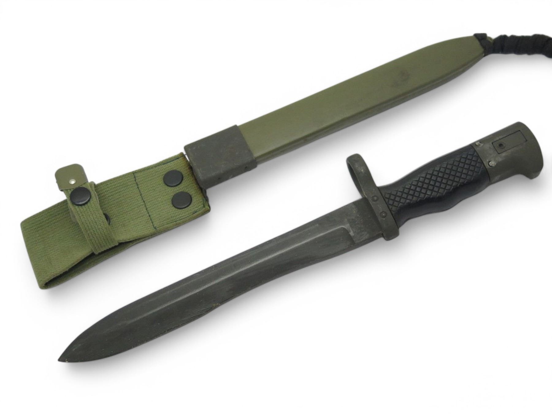 M1964 knife bayonet for use on the Spanish 7.62 mm. NATO caliber CETME Model C selective-fire rifle. The design features an unfullered "bolo" blade, with a black checkered plastic grip and large muzzle ring to fit around the flash hider. The bayonet mounting slot is in the bottom of the bayonet, and it attaches to a unique rectangular mount on the CETME rifle. The bayonet has the correct markings on the blade ricasso, which are the Coat of Arms of Toledo and the INI Factory Insignia. The bayonet comes complete with it's correct steel mounted plastic scabbard, which has an integral belt frog. Overall condition shows wear commensurate with age and service. The bayonet comes complete with it's correct steel mounted plastic scabbard, which has an integral belt frog. Overall condition shows wear commensurate with age and service. *The bayonet comes complete with it's correct steel mounted plastic scabbard, which has an integral belt frog. Overall condition shows wear with age and service.