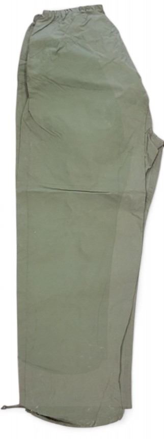 These tough Rain pants were designed for digging trenches in torrential down pours. they pull on over your boots and Jeans sealed taped seams its a PVC coating over a heavy gauge nylon. elasticized waist coupled with a draw cord and draw cords in the pant leg cuff. Two slash folded front pocket access openings, And a Matte lackluster olive green that will make you the belle of the ball! Most are in near new to very good condition.