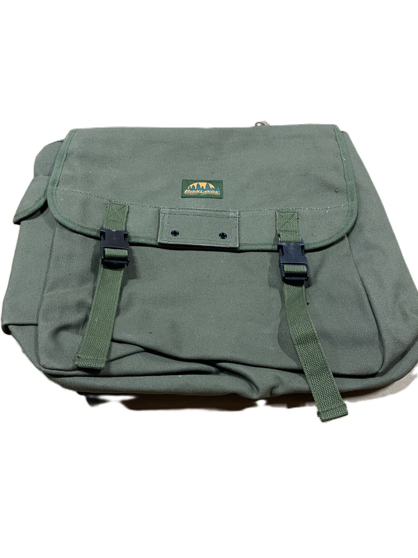 Constructed with heavy weight 22 oz. cotton canvas military styling internal and external pouches. Adjustable extra-long shoulderstraps. Plastic snap closures. Dimension 15" x 15" x 6"