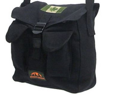 Heavy canvas construction, extra long adjustable shoulder, strap, large main compartment with metal buckle, two, outside Velcro-closure pockets. 11” x 9” x 4”