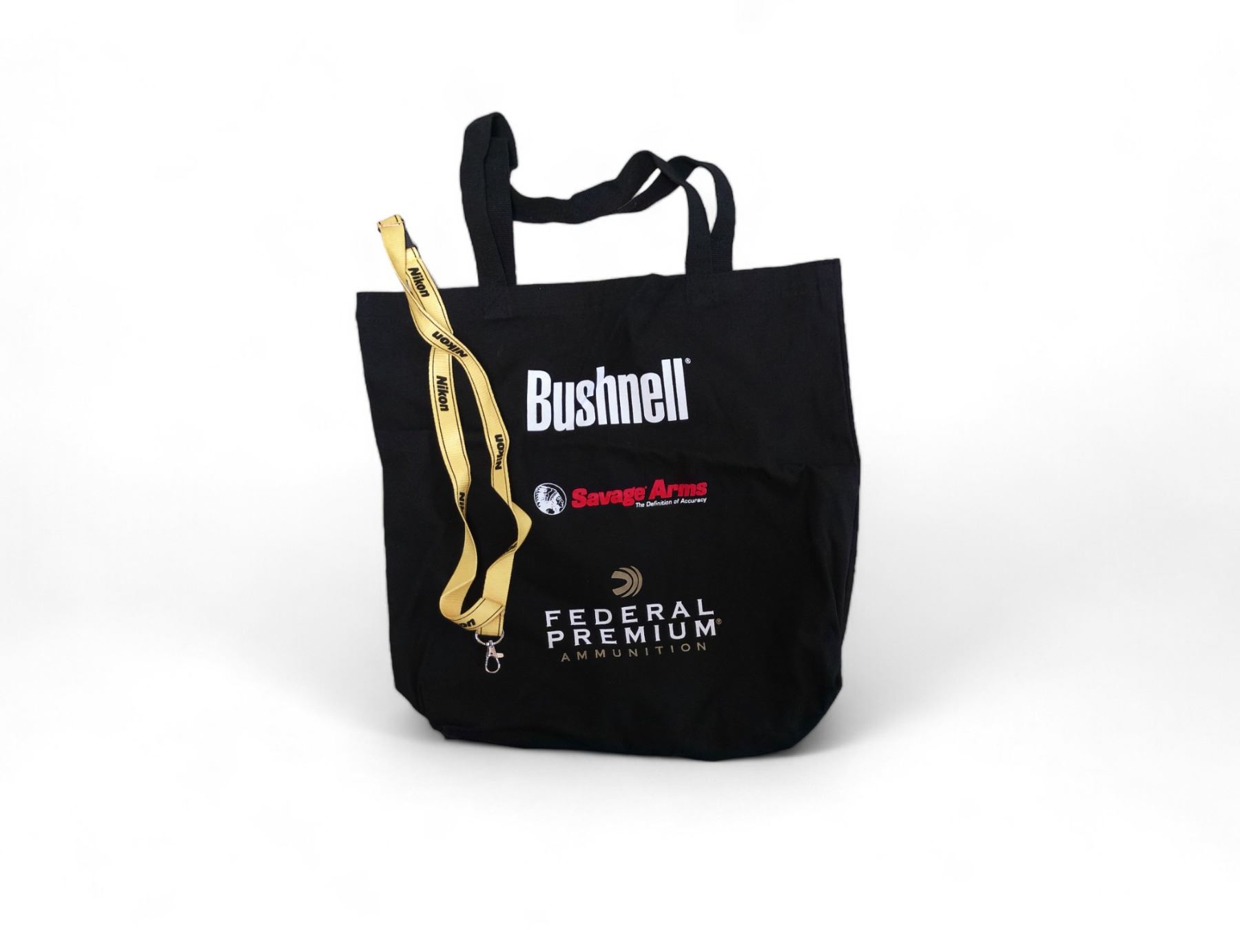 3X Tote Bag Black With Bushnell,Savage and Federal Logos, 3X Neck Lanyard Yellow Nikon Logo