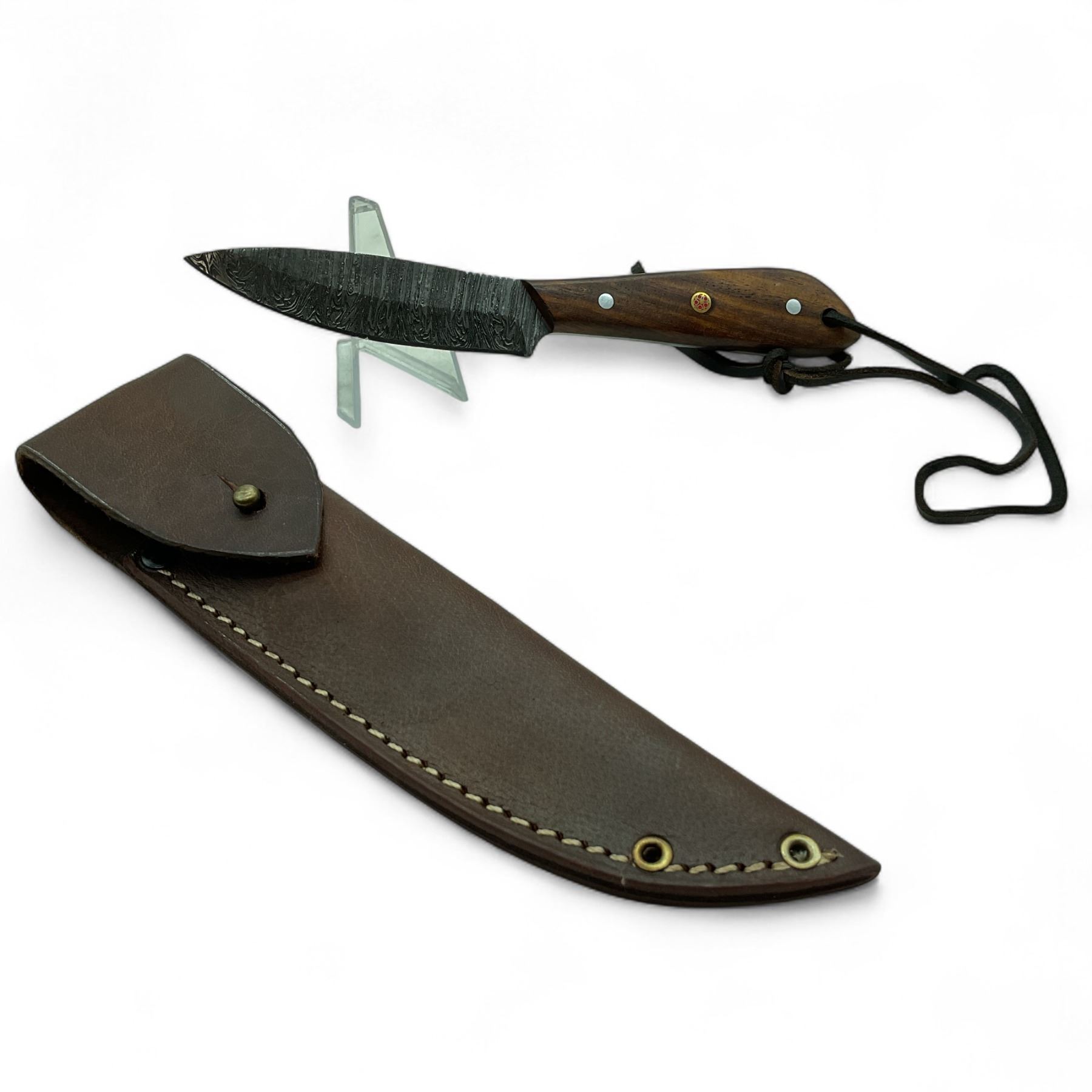 4" Fixed Damascus Blade Knife with Wood Handle and Leather Sheath