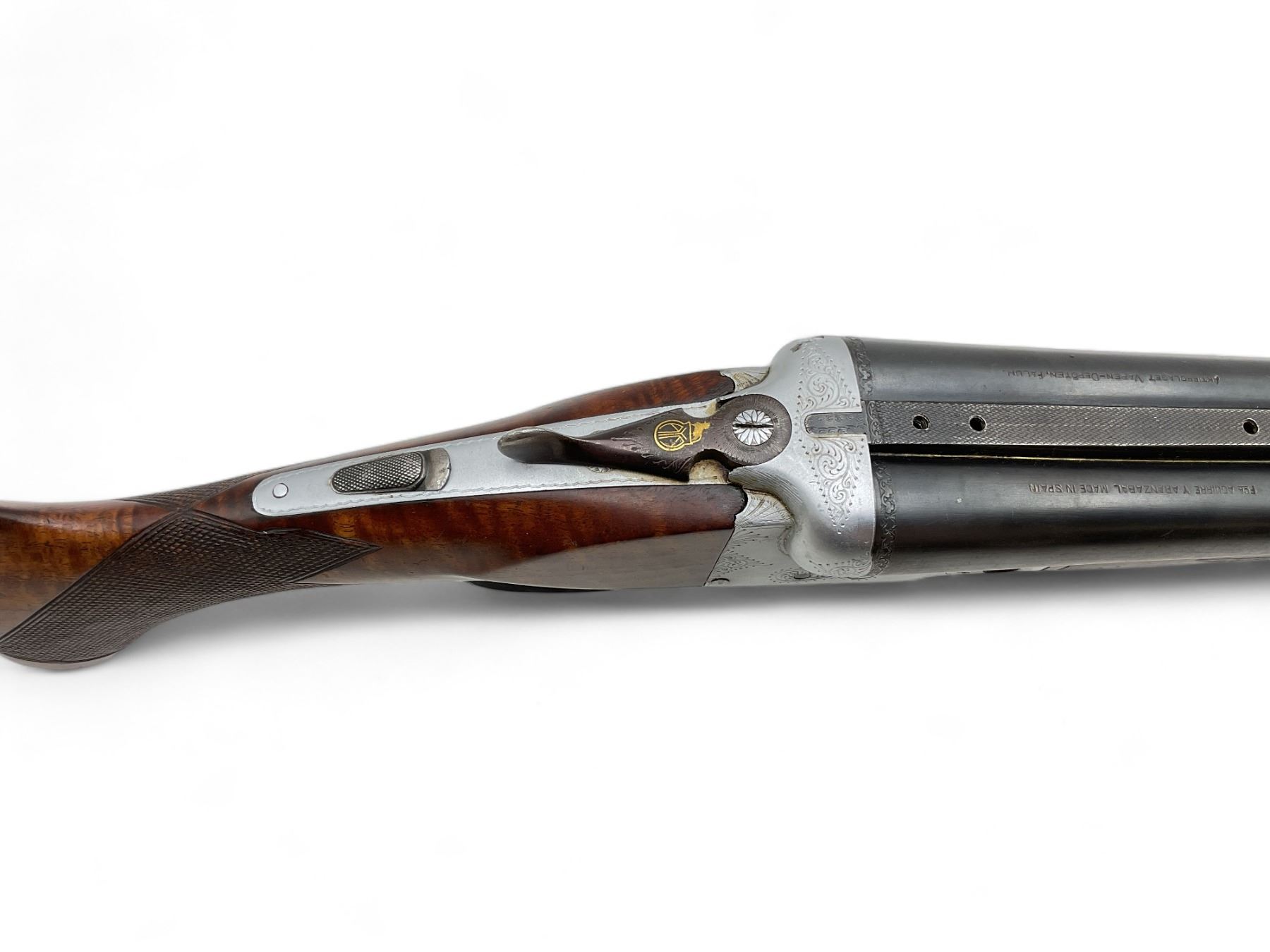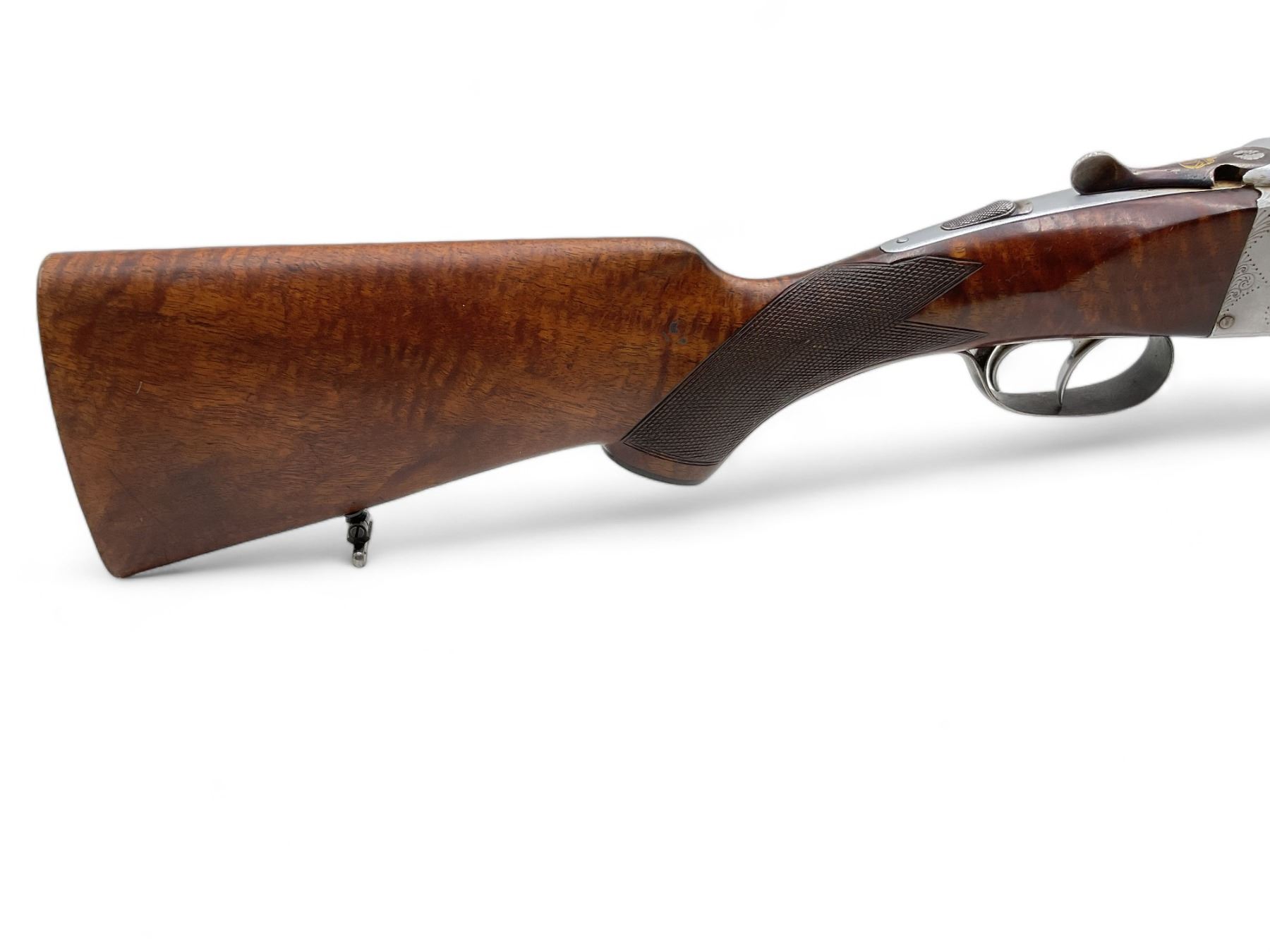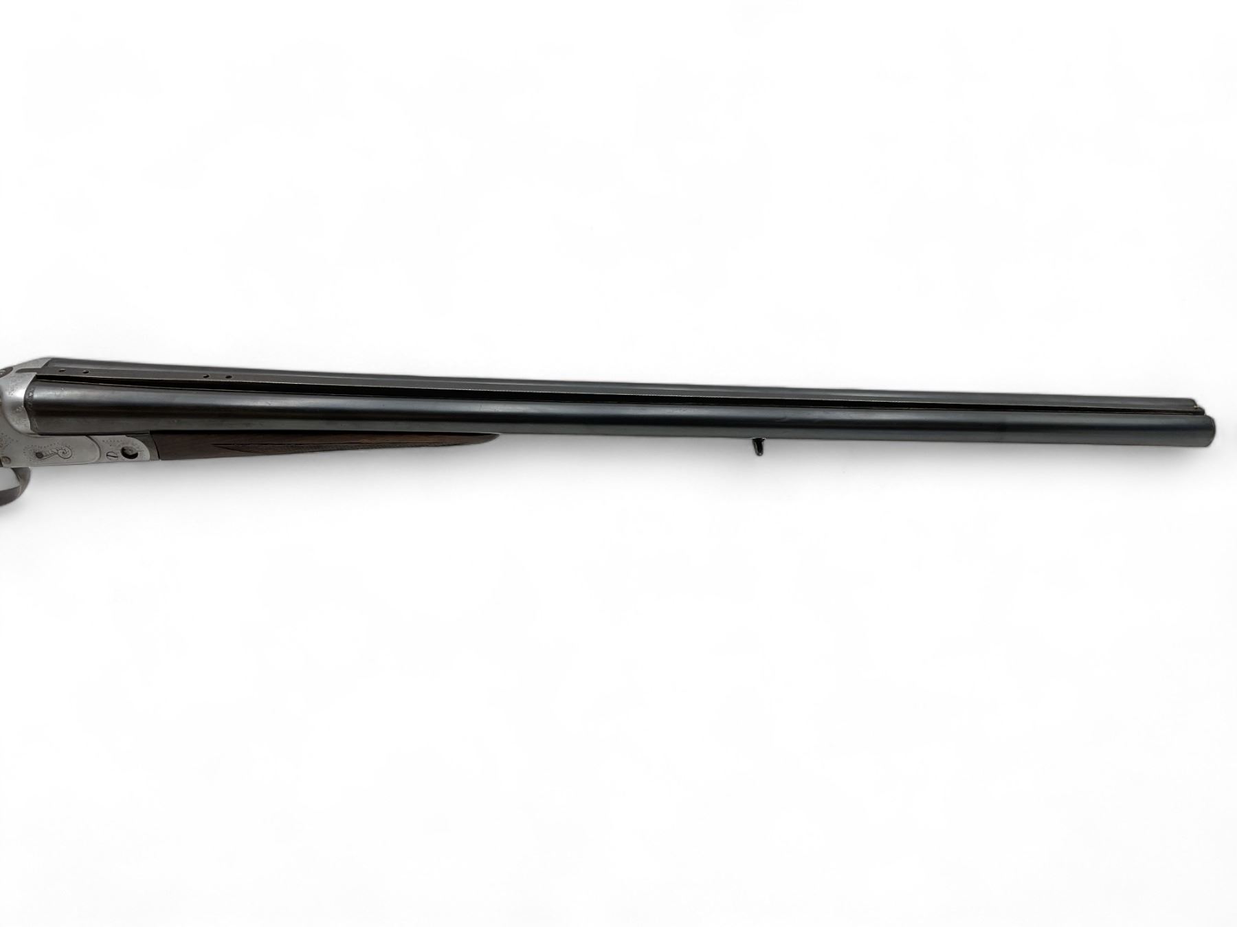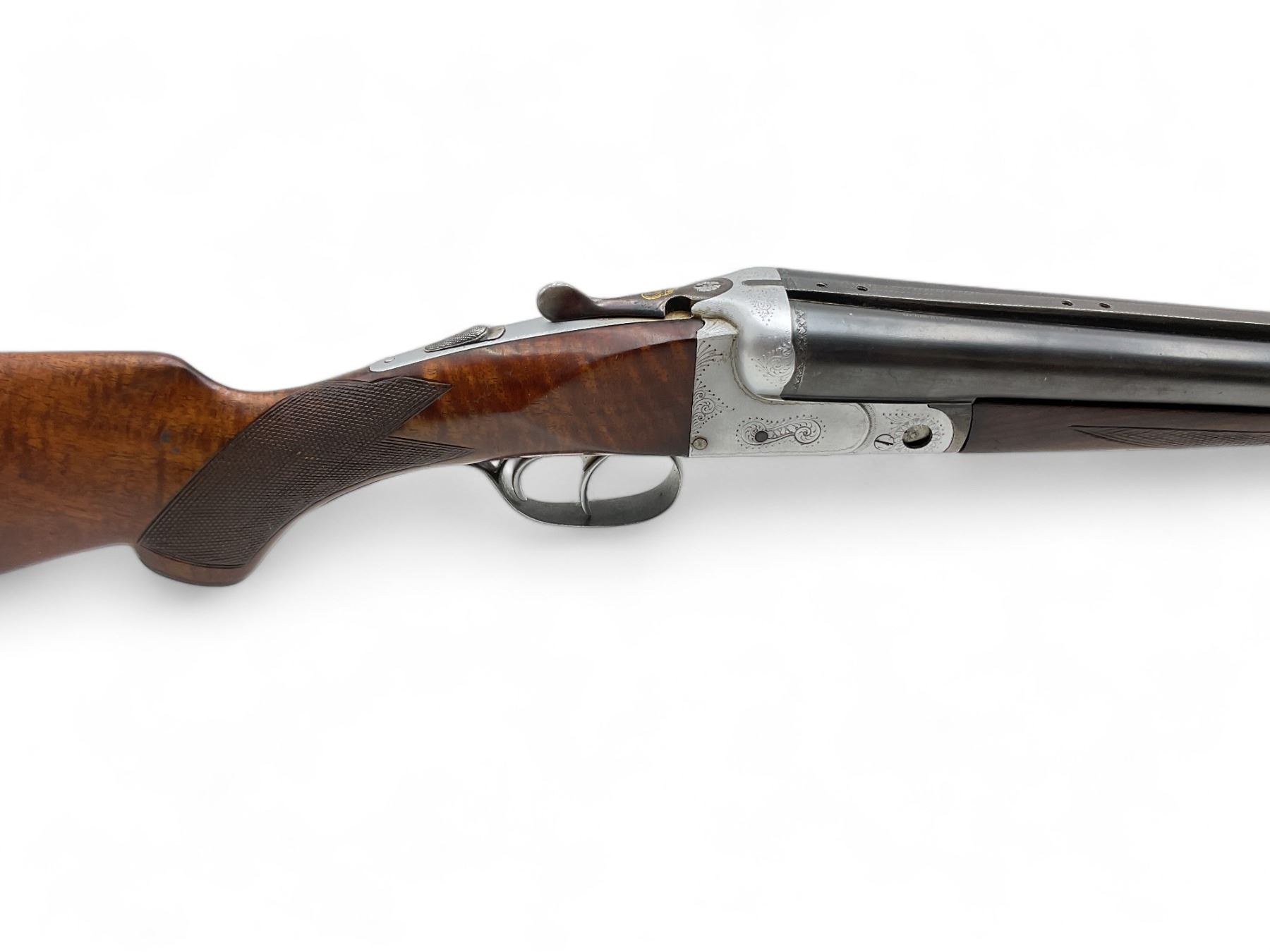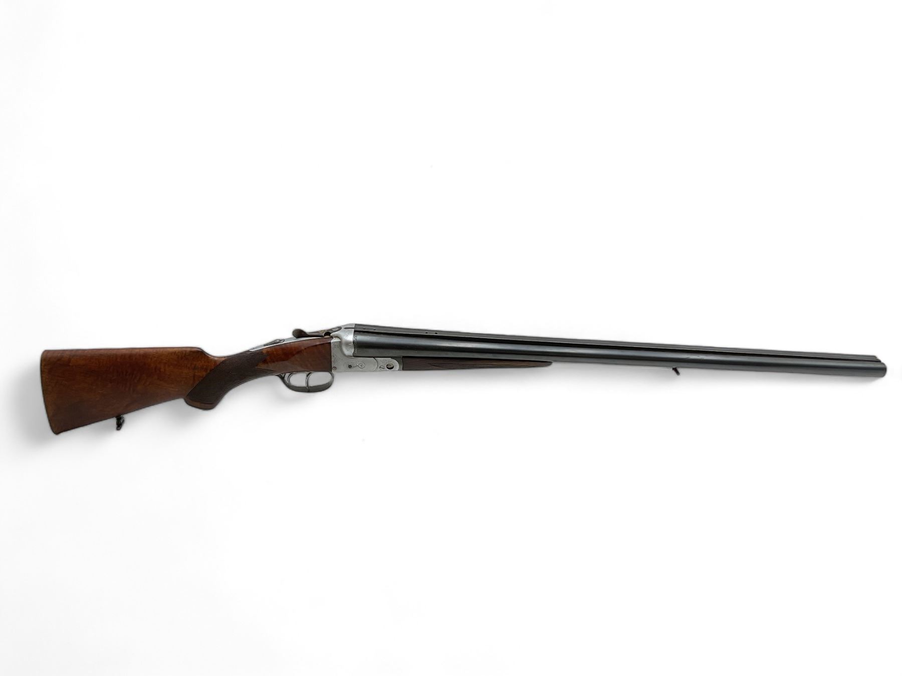 AYA Side By Side 12Ga Shotgun 27.5" Barrels Wood Stock. Fixed chokes, bead sight. No buttplate, comes with sling mounts. Receiver missing plug cover on right side. This is a non-restricted firearm.