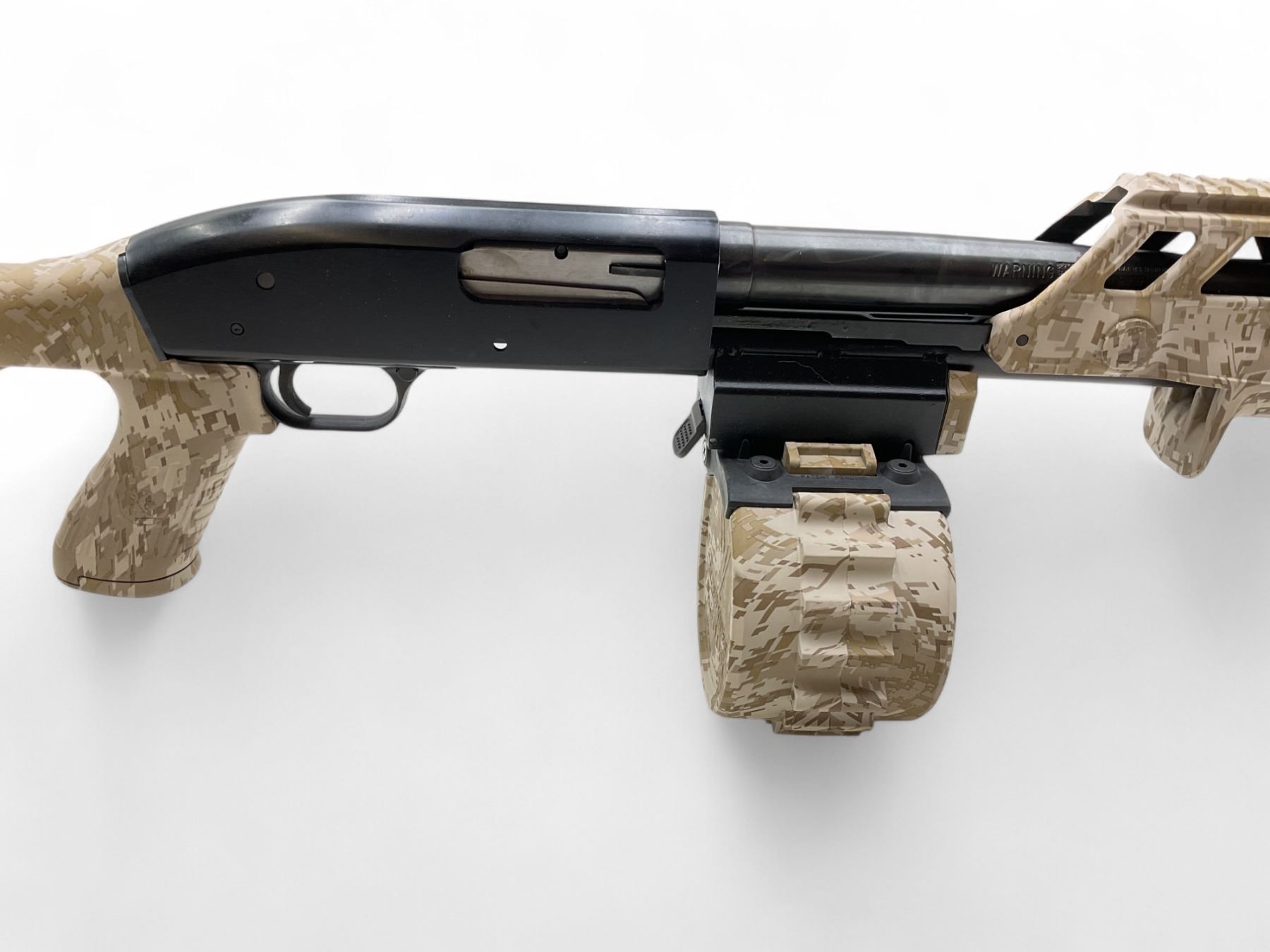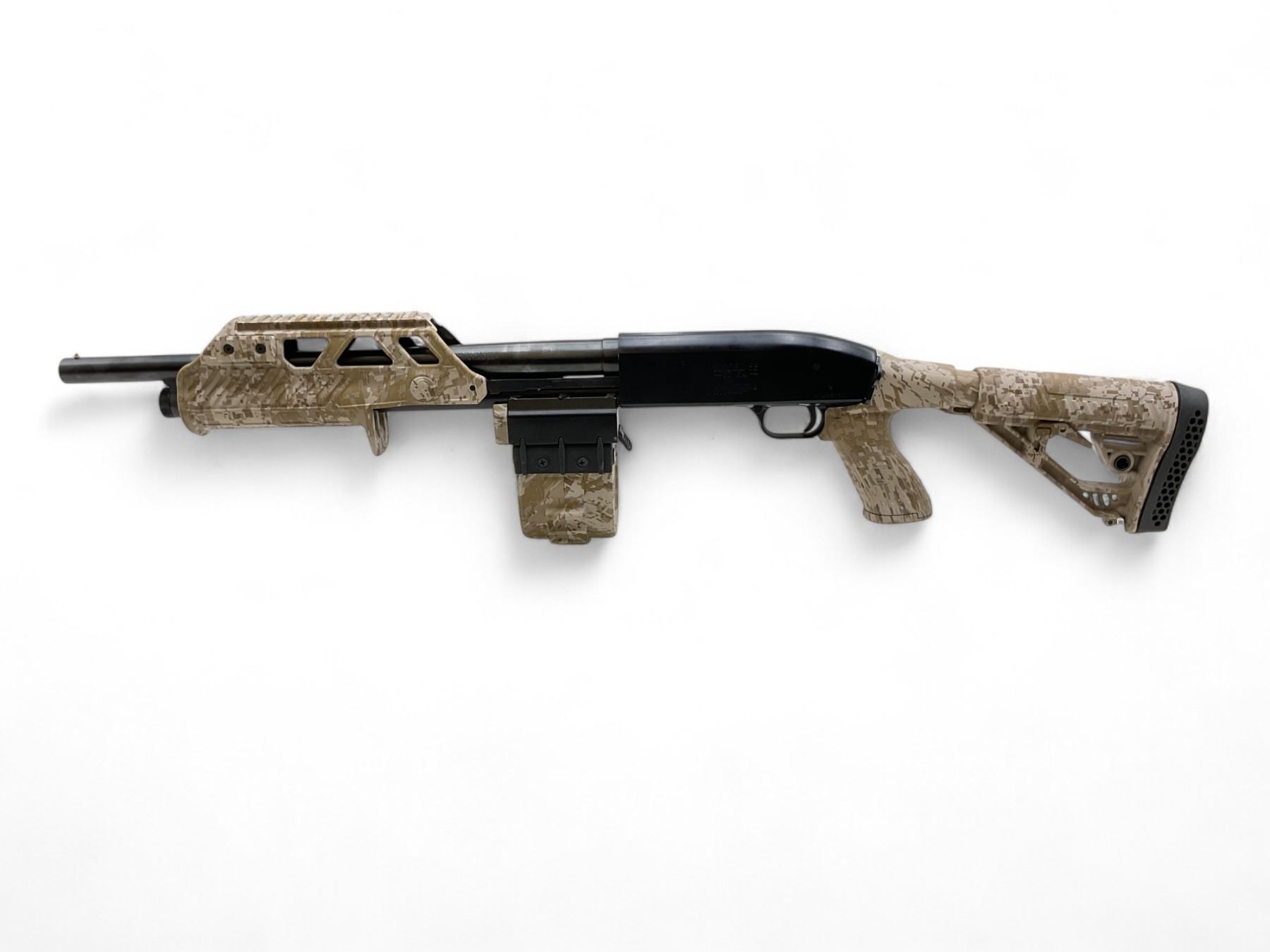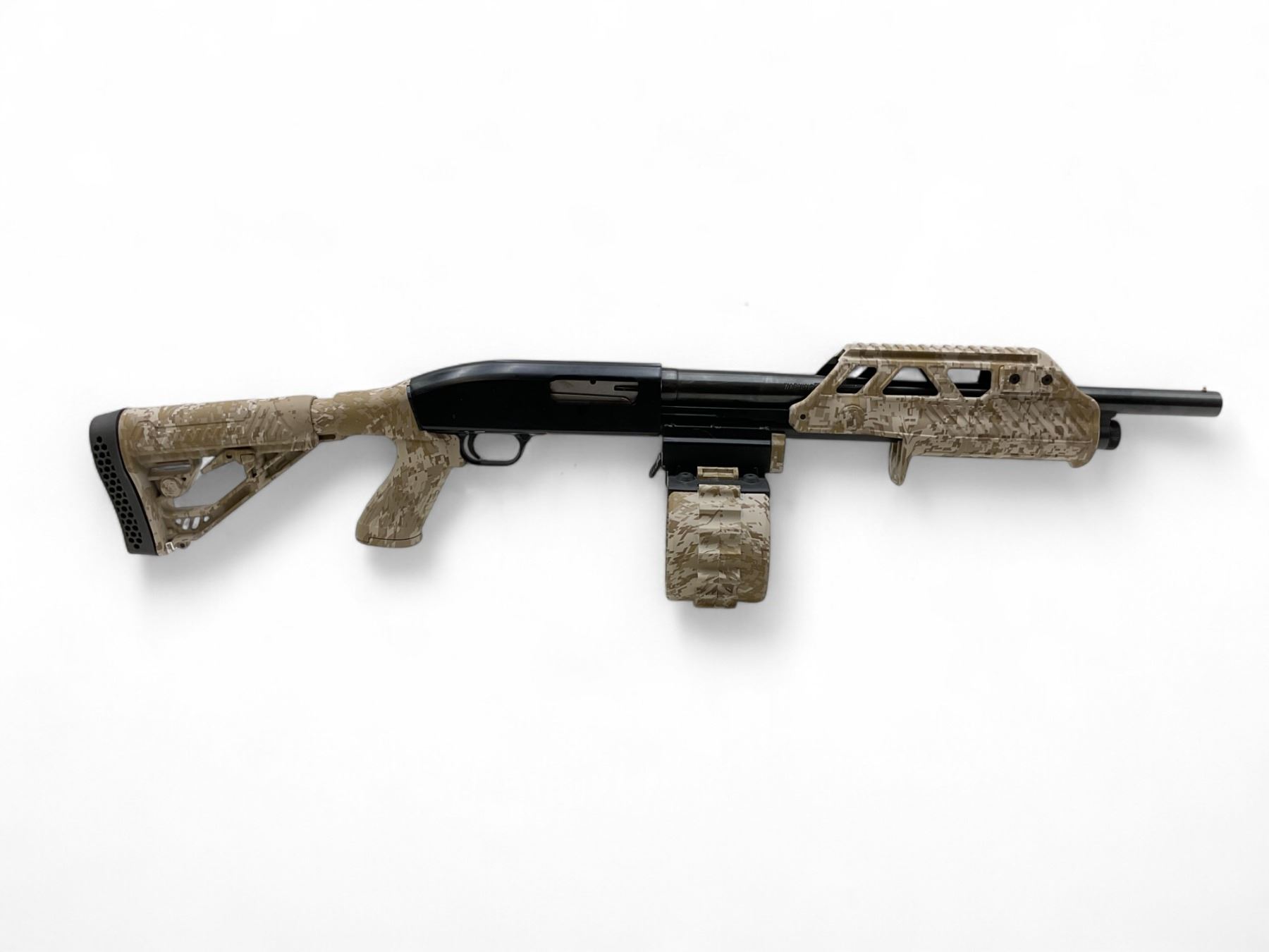 Adaptive Tactical Maverick Model 88 Pump Action Shotgun 12Ga 3" Chamber 18.5" Barrel Camo Adj Stock. Bead sight, fixed choke. Comes with a detachable drum magazine. This is a non-restricted firearm.