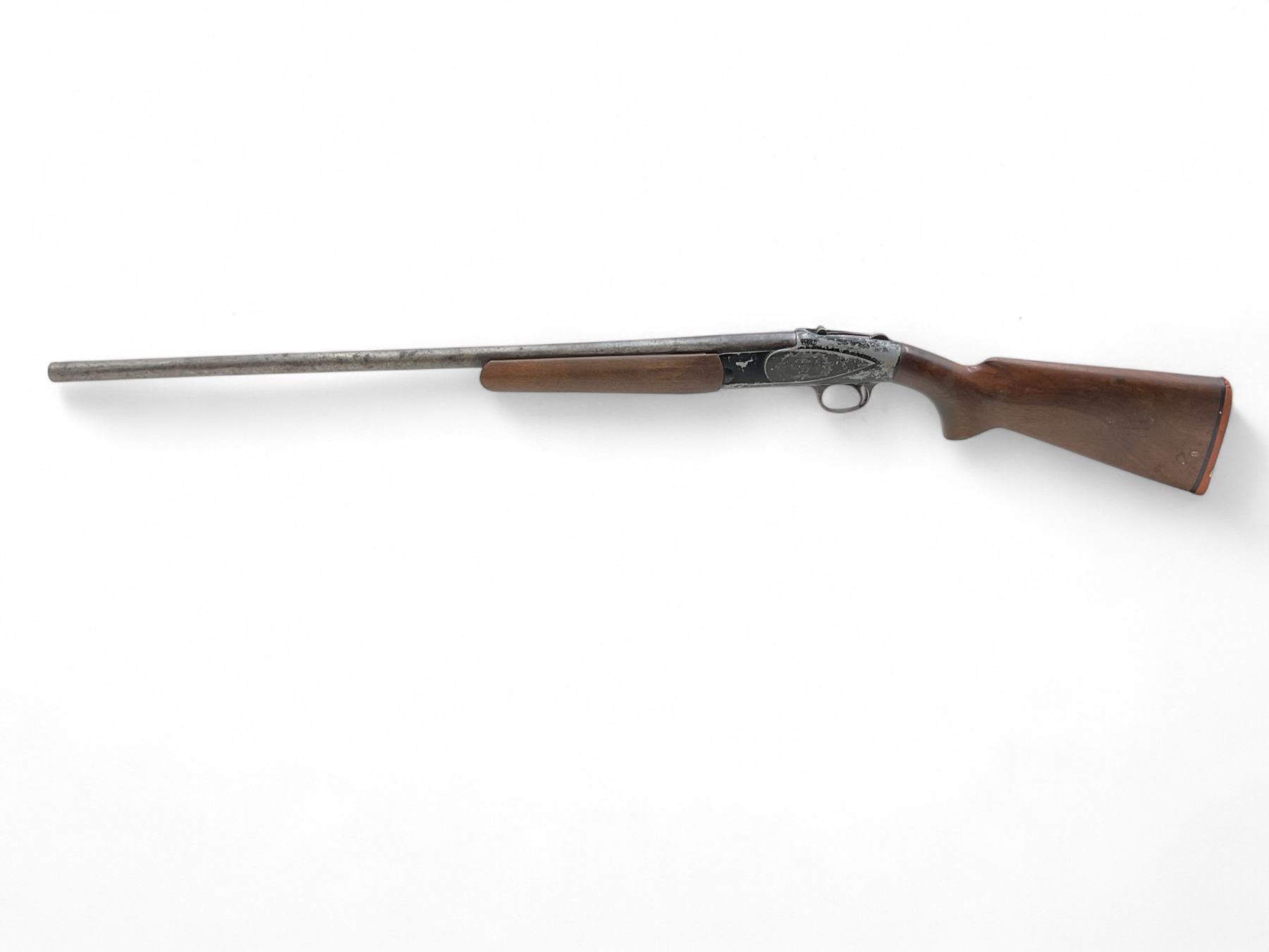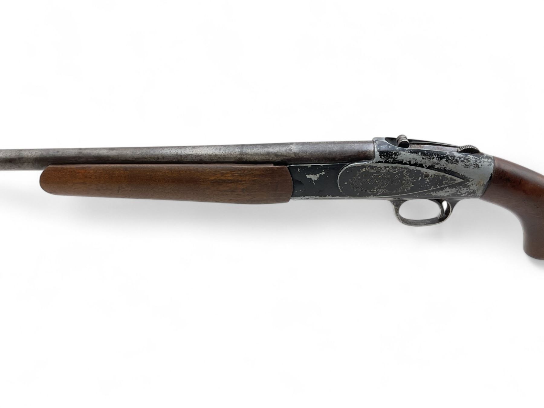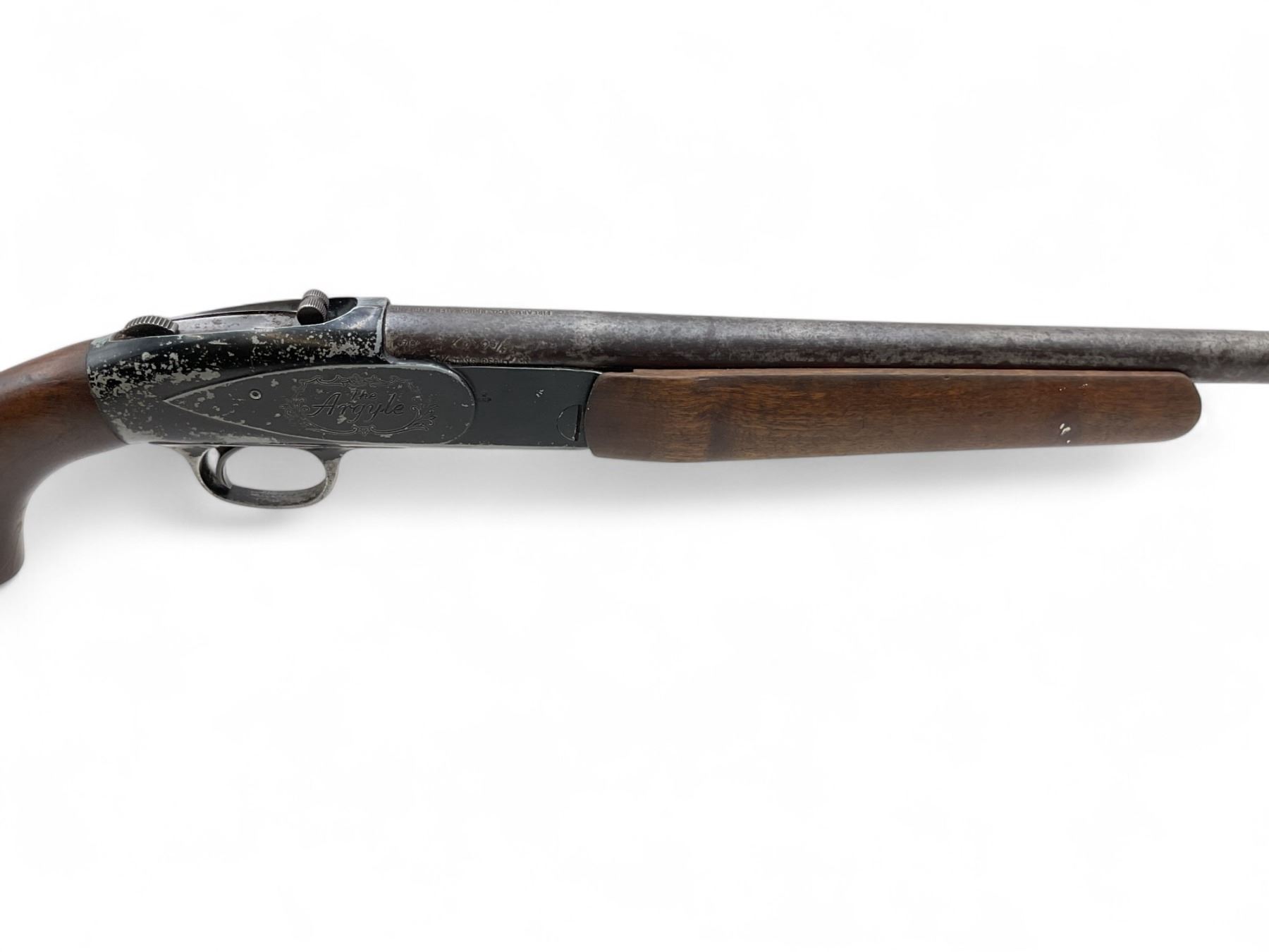 Argyle Single Shot Shotgun 12Ga 2.75" Chamber 30" Barrel Wood Stock. Missing bead sight; fixed choke. Rear stock cracked and loose, butt pad is damaged. This is a non-restricted firearm.