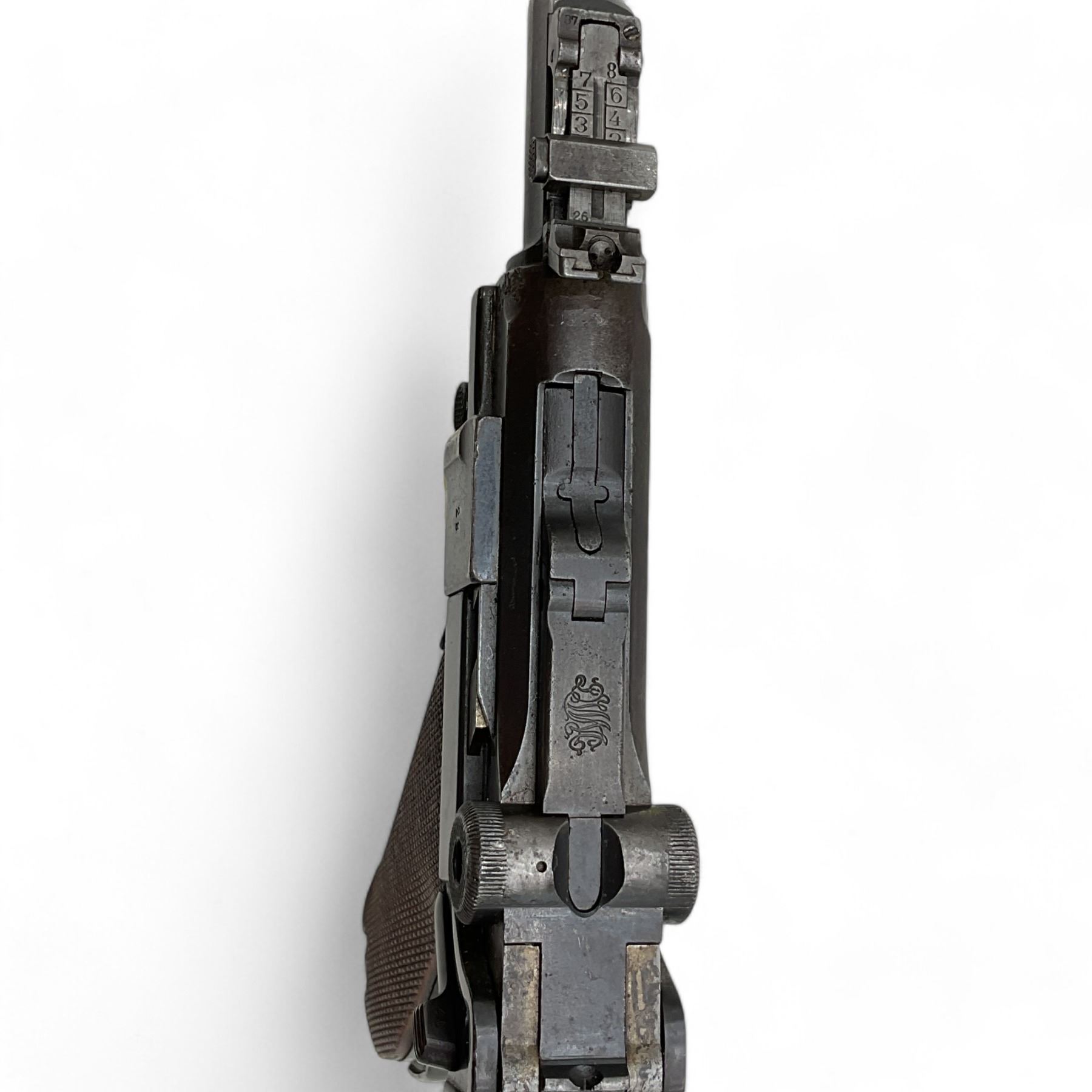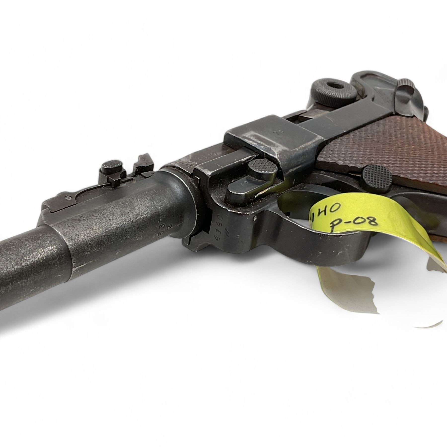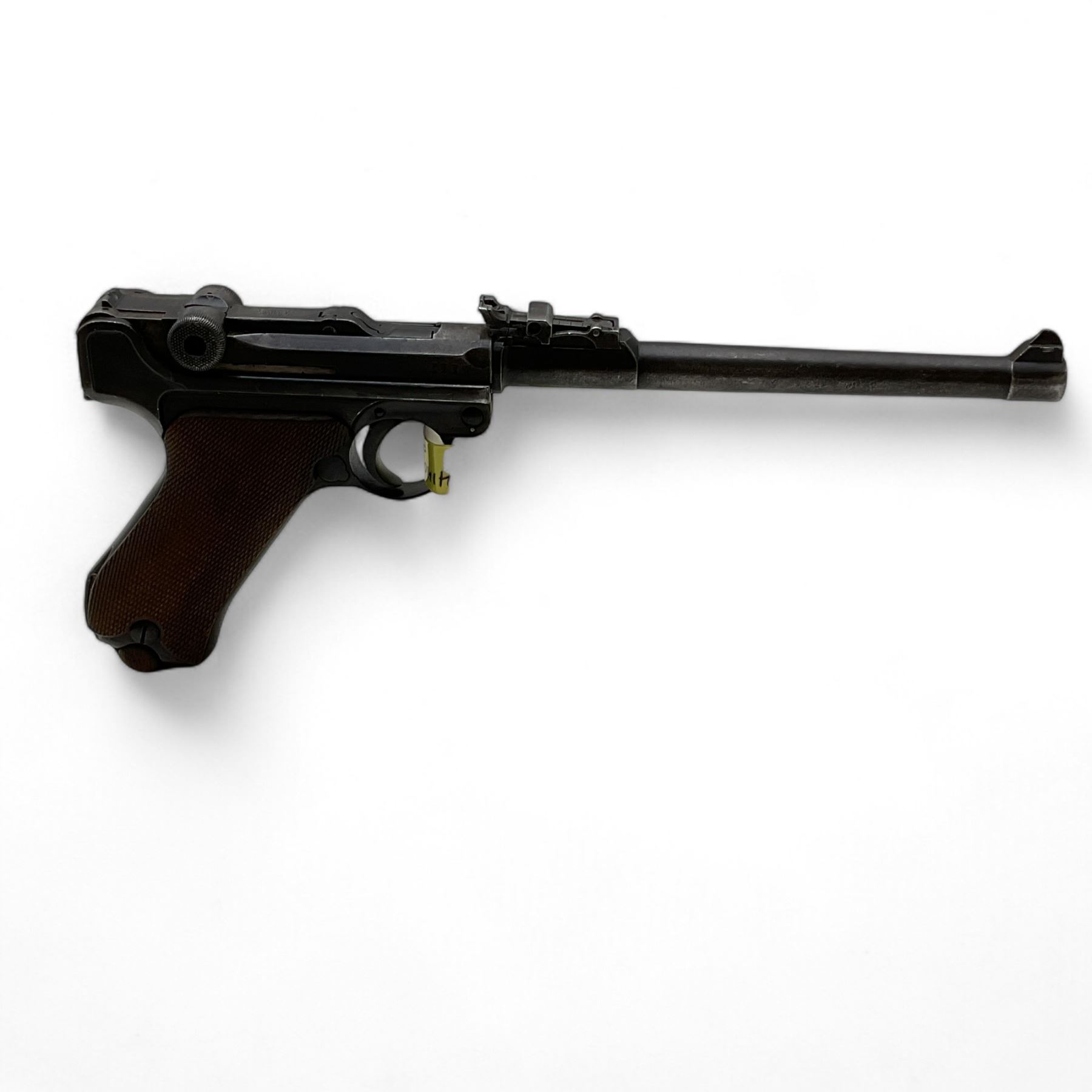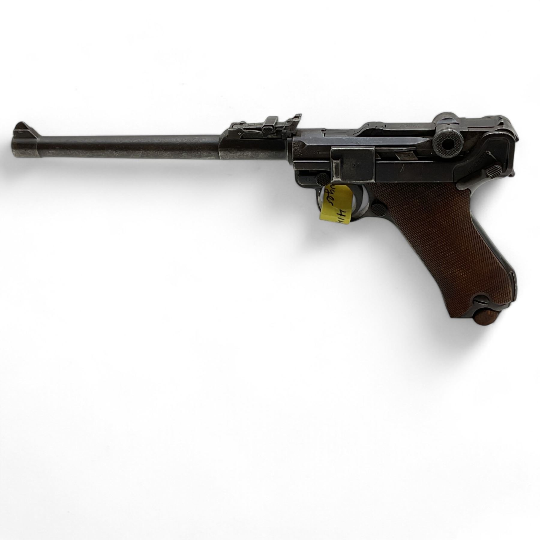 Artillery Luger Semi Auto Pistol 7.5" Barrel, Restricted. Comes with one magazine. Fixed front sight, adjustable rear sight.