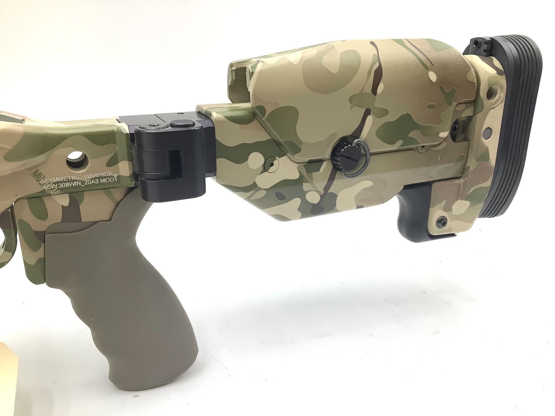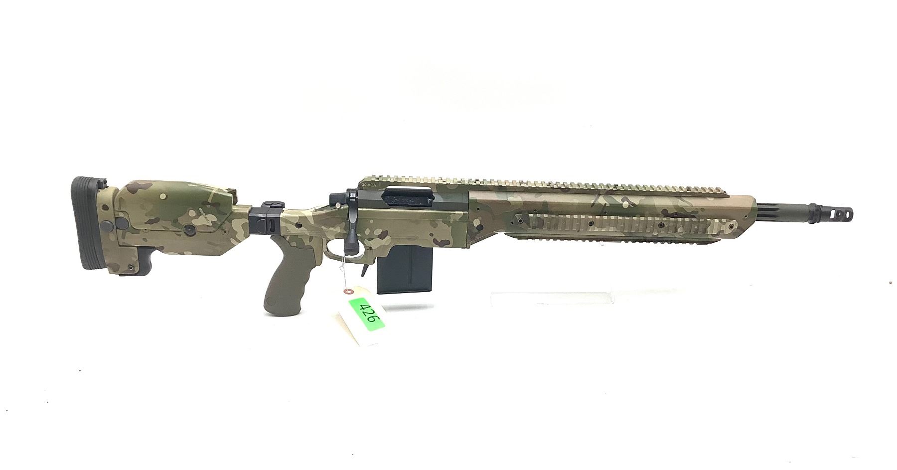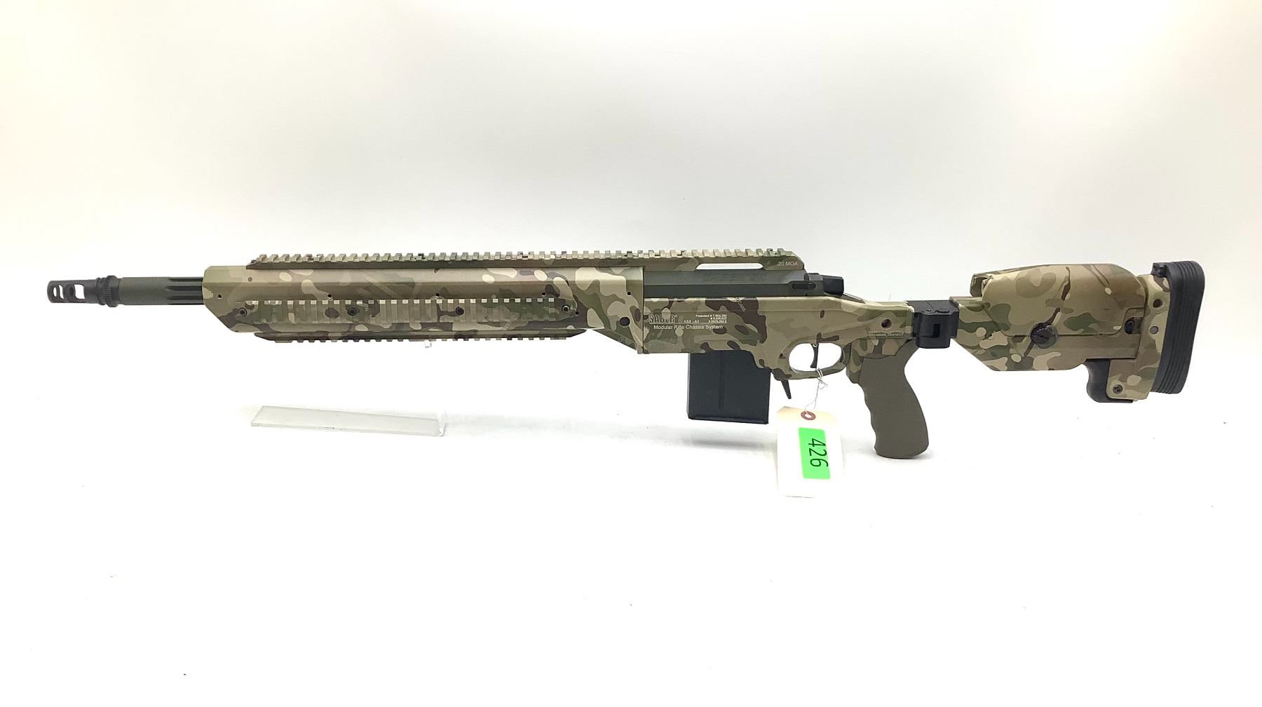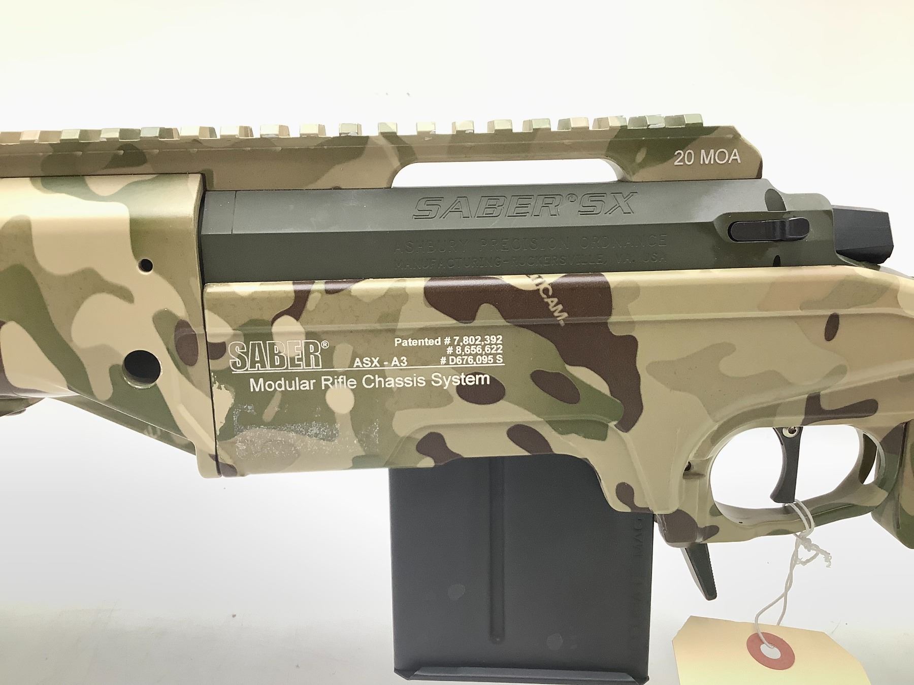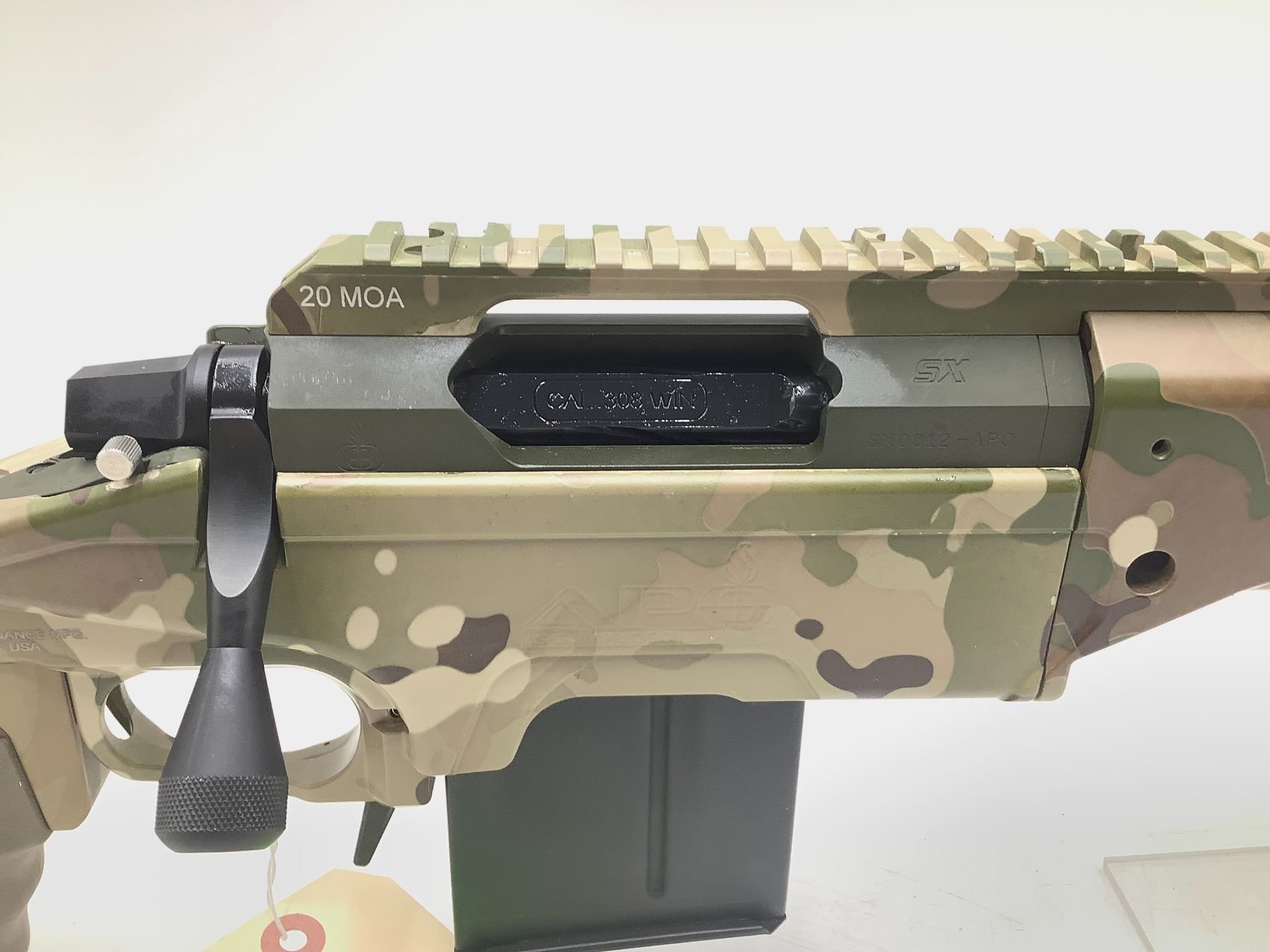 Ashbury Precision Ordnance Saber SX Bolt Action Rifle 308 Win 20" Threaded Fluted Barrel Green And Camo. Detachable magazine, adjustable stock. 20 MOA rail, AAC Brake, ergo grip. Very uncommon to find these rifles; here is your chance to own something special! This is a non-restricted firearm. This gun has about 20 rounds thru it. We used it at an LE demo shoot to showcase some optics.
