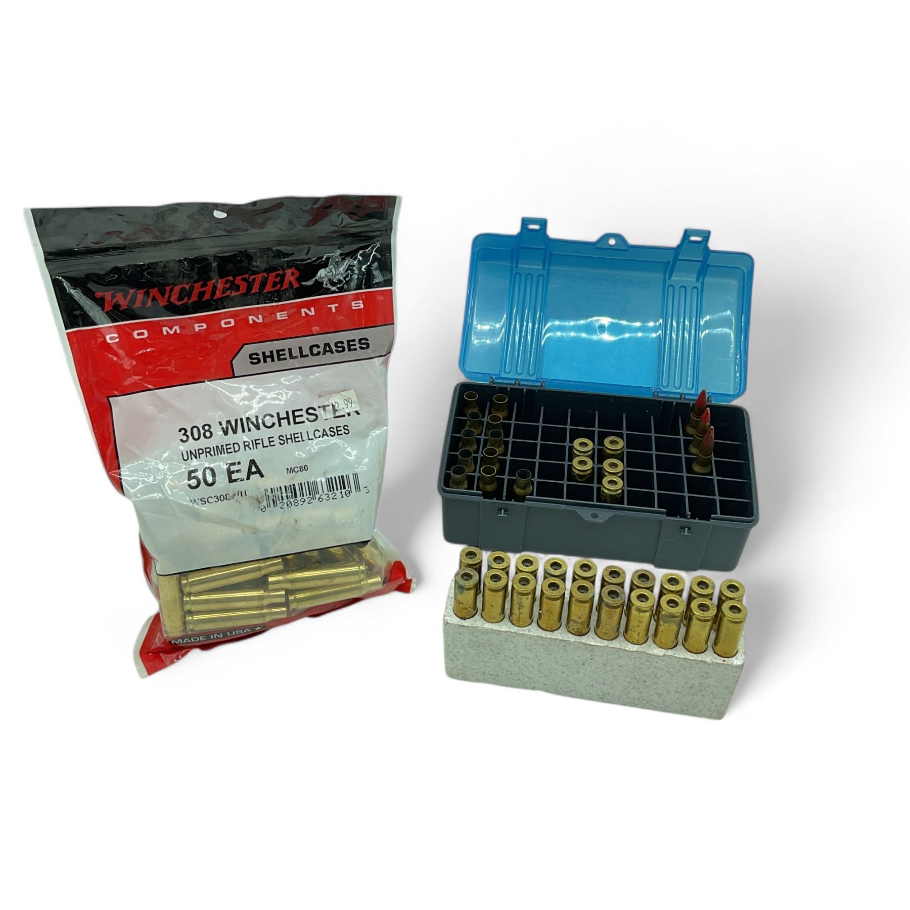 Assorted .308 Ammunition, Fired Brass Casings, Unprimed Brass Casings and Plano Rifle Ammo Case