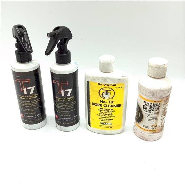 Thompson Center T17 Black Powder Bore Solvent x 2, No. 13 Bore Cleaner x 1, and CVA Slick Load Barrel Blaster Solvent x 1