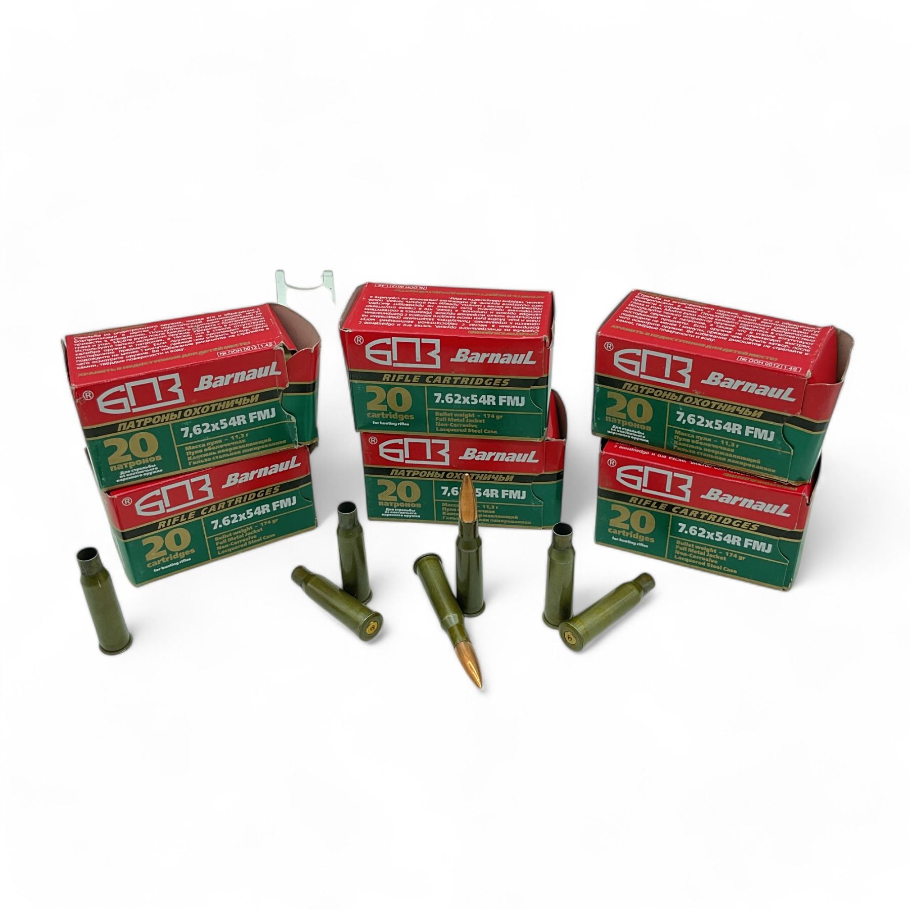 Barnaul 7.62 x 54R, 174 Grain FMJ Ammunition, 114 Rounds and 5 Casings
