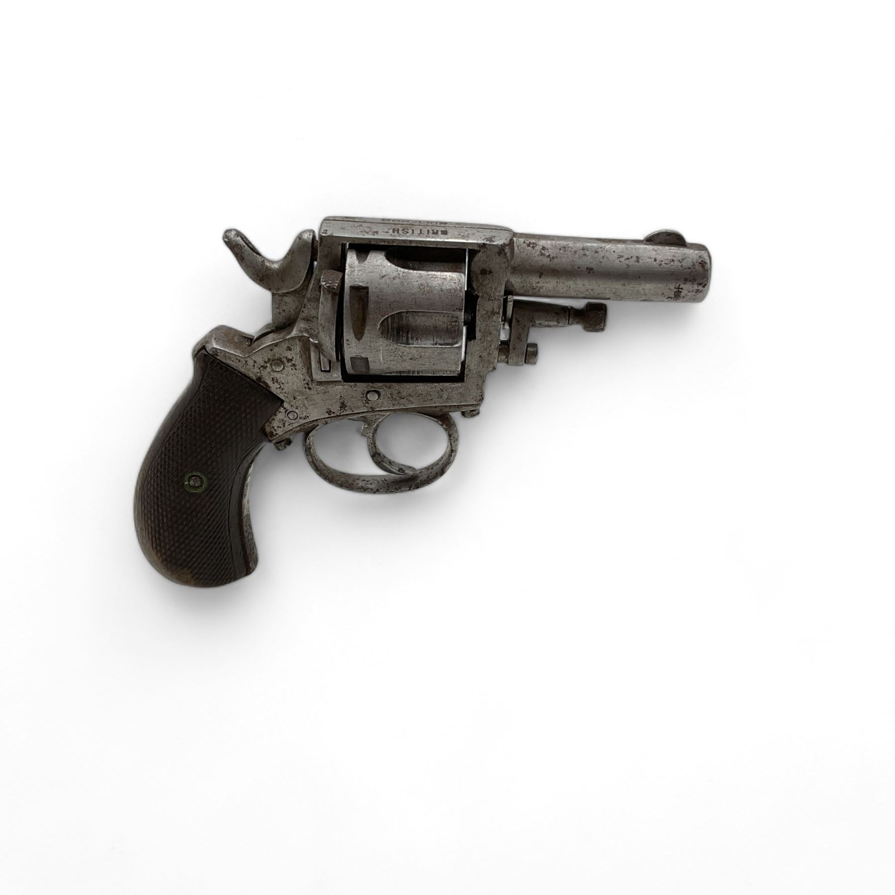 Belgian Made British Bull-Dog Revolver, 2.5" Barrel, 380 Rev Short CF, Antique. 6 round capacity. It appears to function fine except the trigger spring is a bit weak and you have to push the trigger forward the last 1/4 inch or so. It might also be gummed up side and not weak.