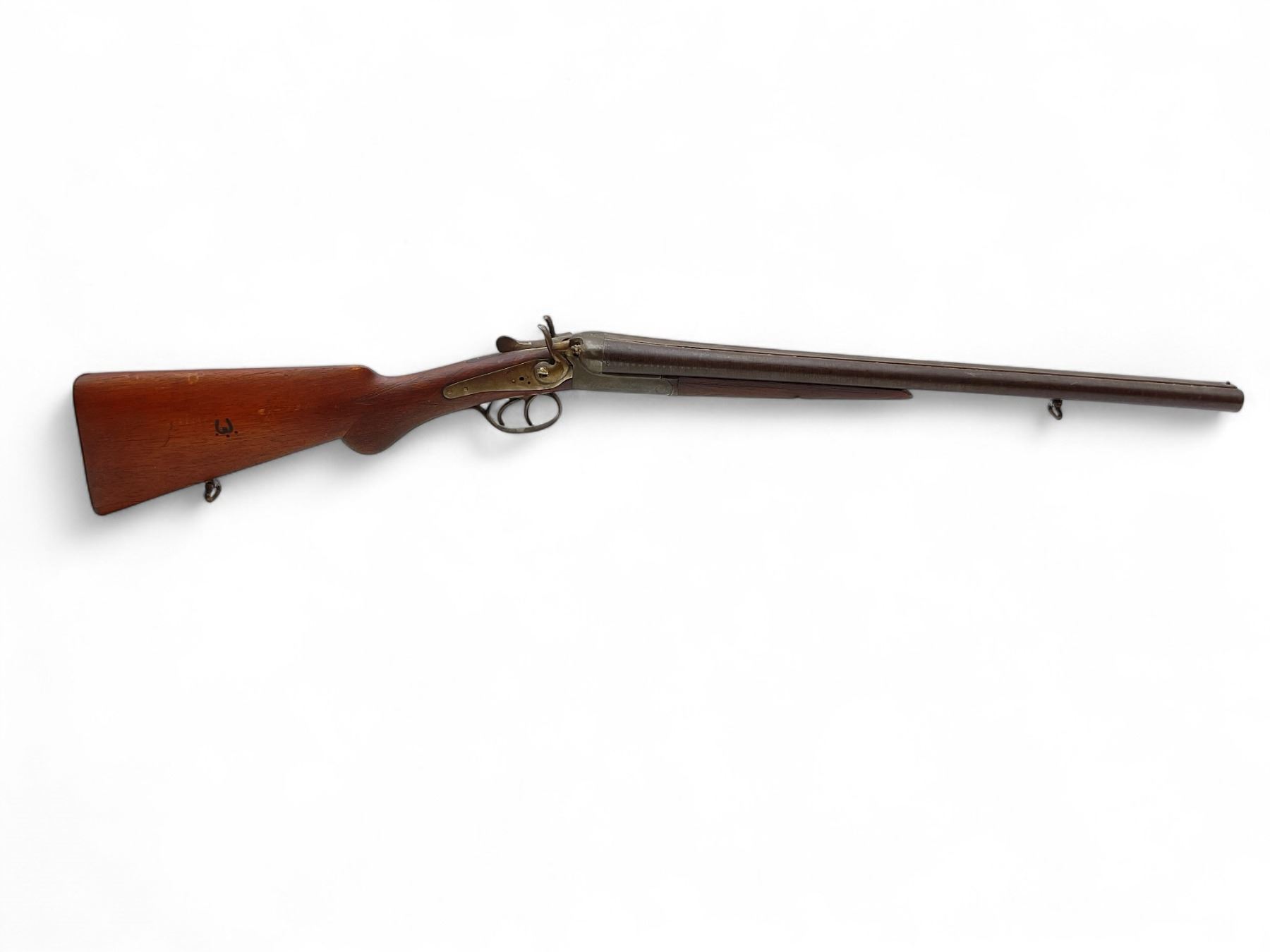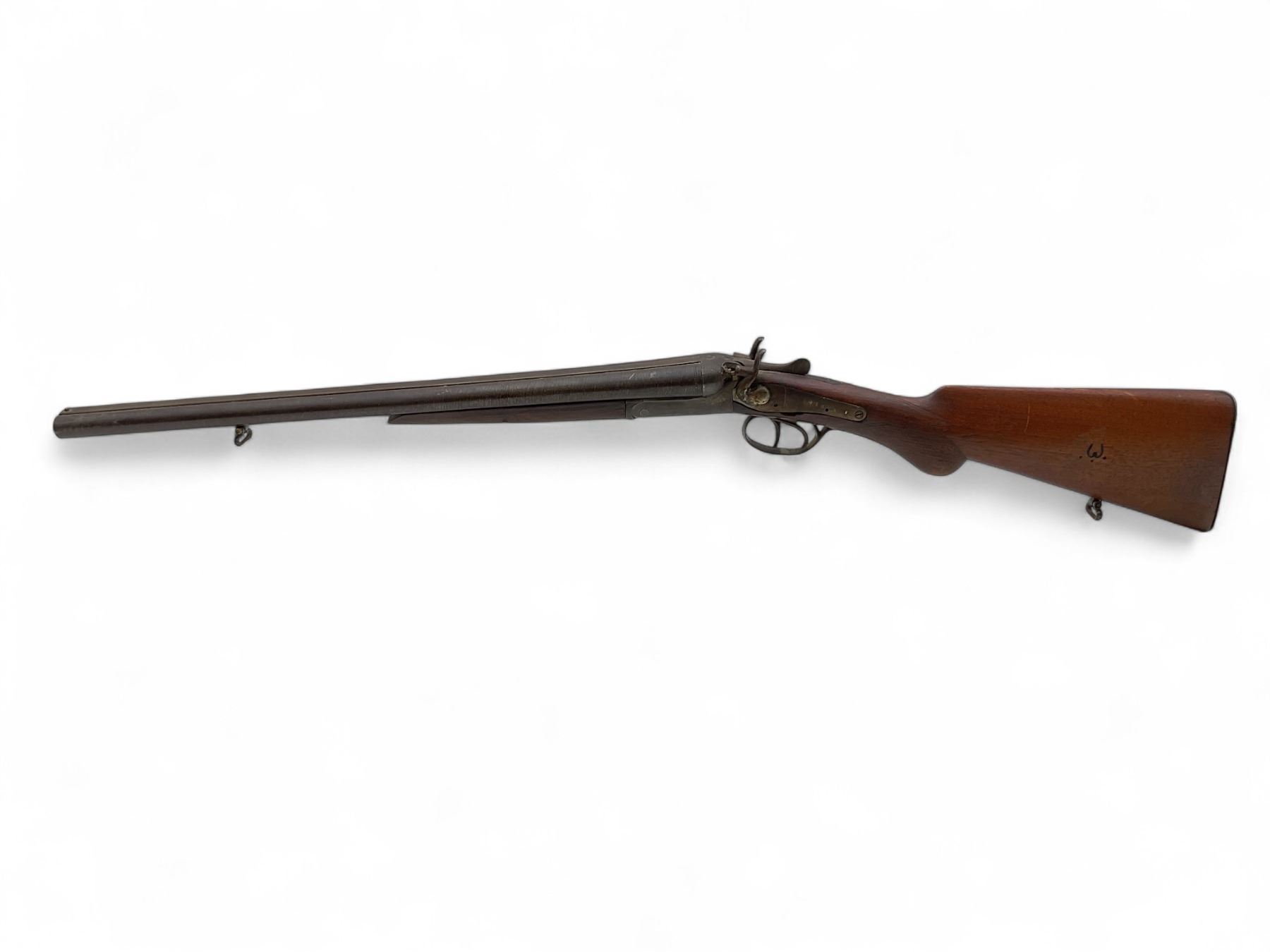Belgian Side By Side Shotgun 16Ga 20" Barrels Wood Stock.  Bead sight; Damascus barrels appear to have been cut down.  Both barrels plugged.  Exposed hammers have been welded.  Rear stock cracked and missing a piece.  This is a non-restricted firearm.