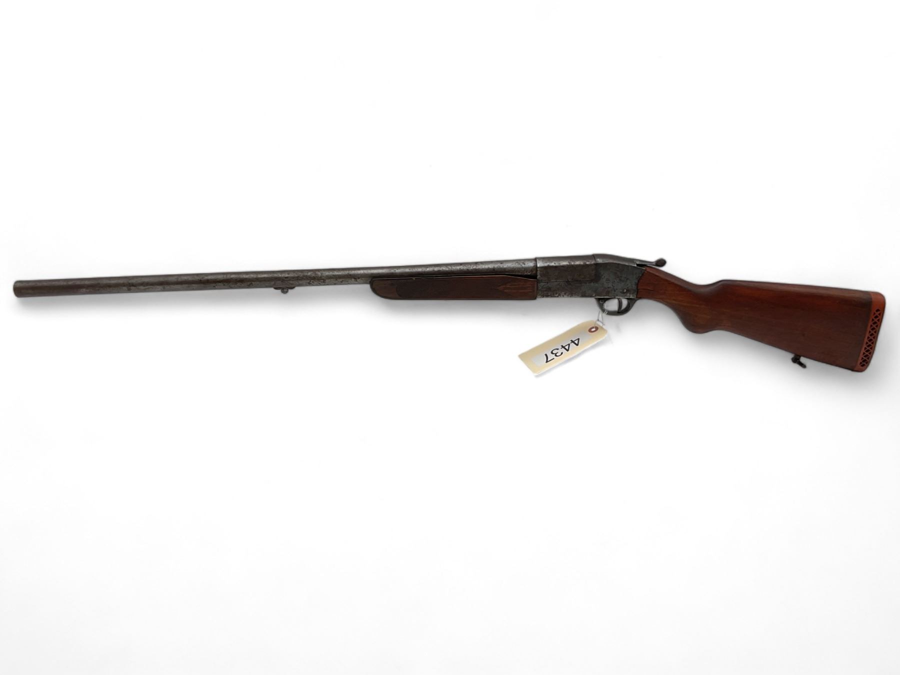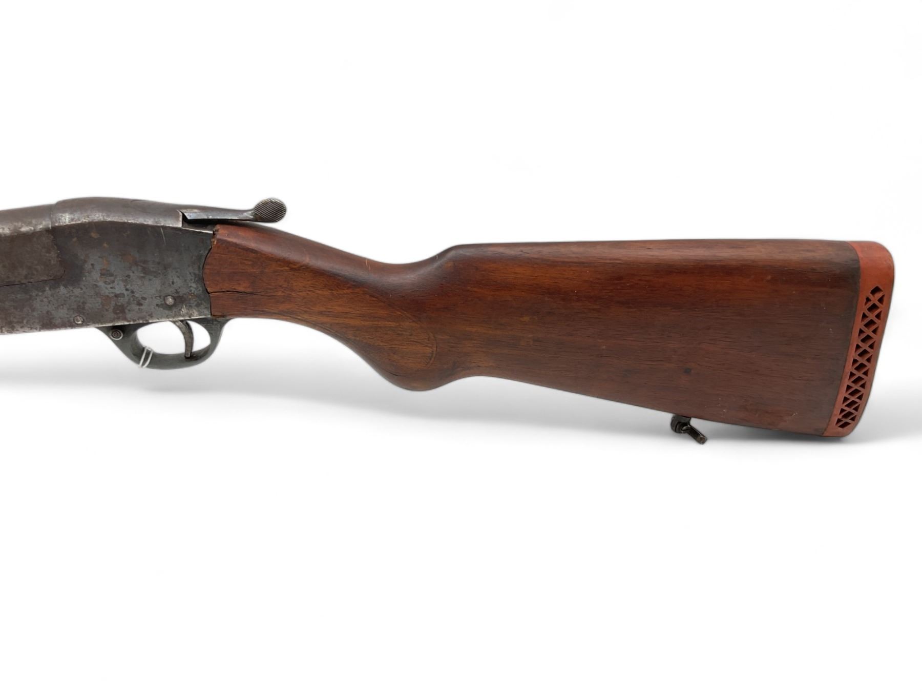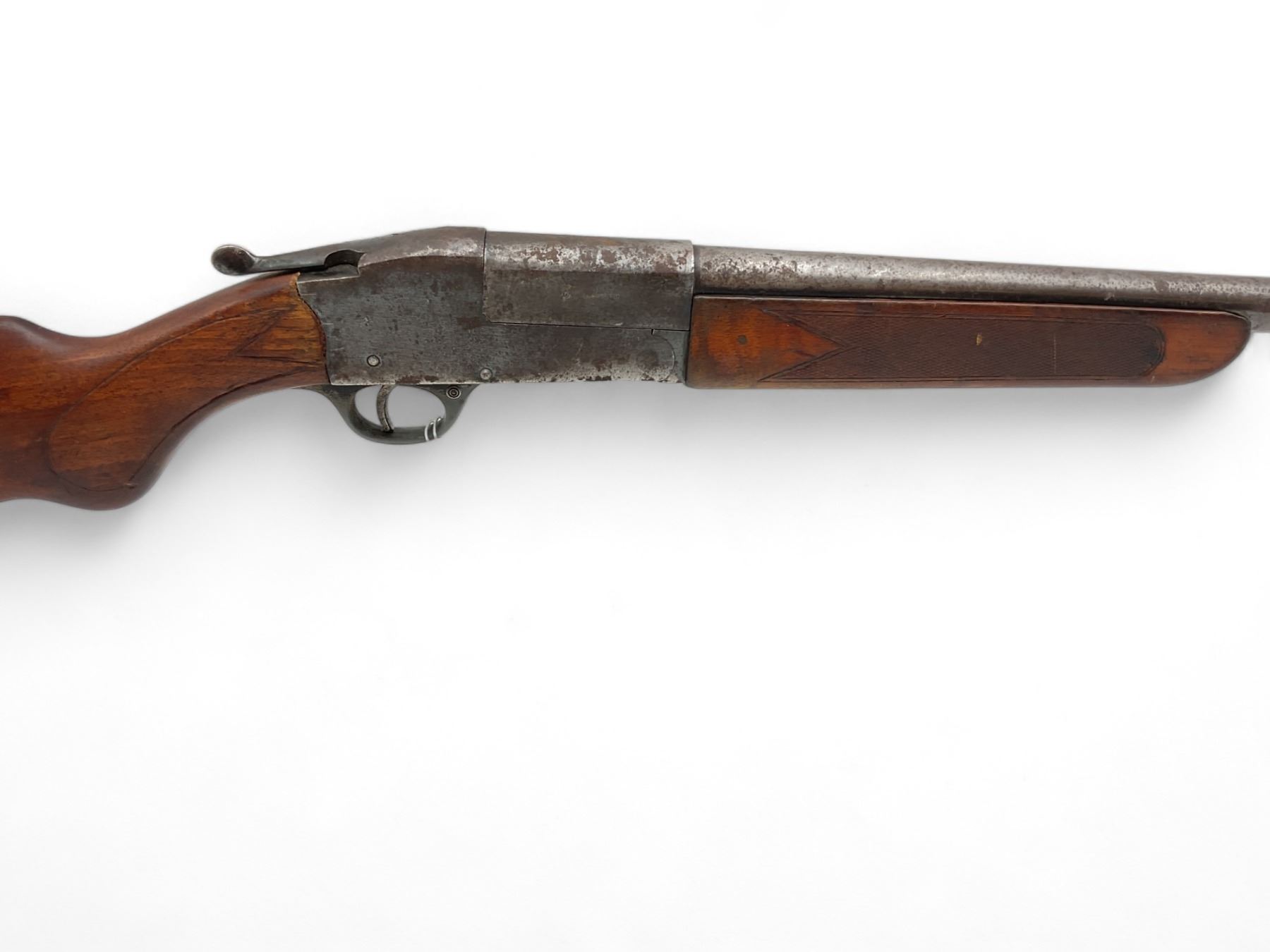 Belgian Single Shot 12Ga Shotgun 30" Barrel Wood Stock. Bead sight, fixed choke. Rear stock is cracked in several places and loose. This is a non-restricted firearm.