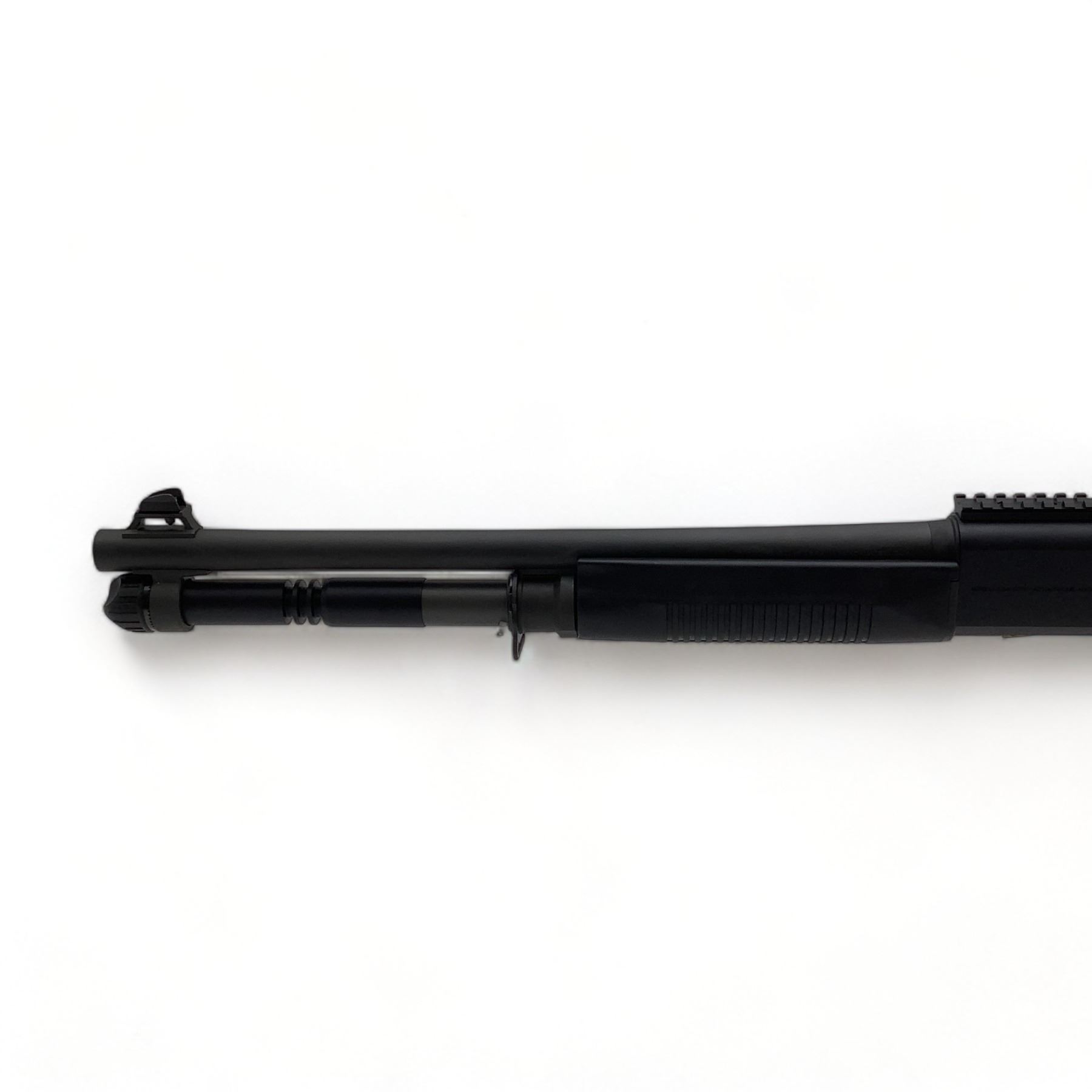 Benelli M4 Semi Auto Shotgun 12Ga 3" Chamber 18.5" Barrel Adjustable Stock Black, Display Model. This is a display model; it has fires approximately ten rounds. No box for this gun. Comes with a removable choke. Receiver drilled and tapped with rail installed. Fixed front sight, adjustable rear sight. This is a non-restricted firearm.