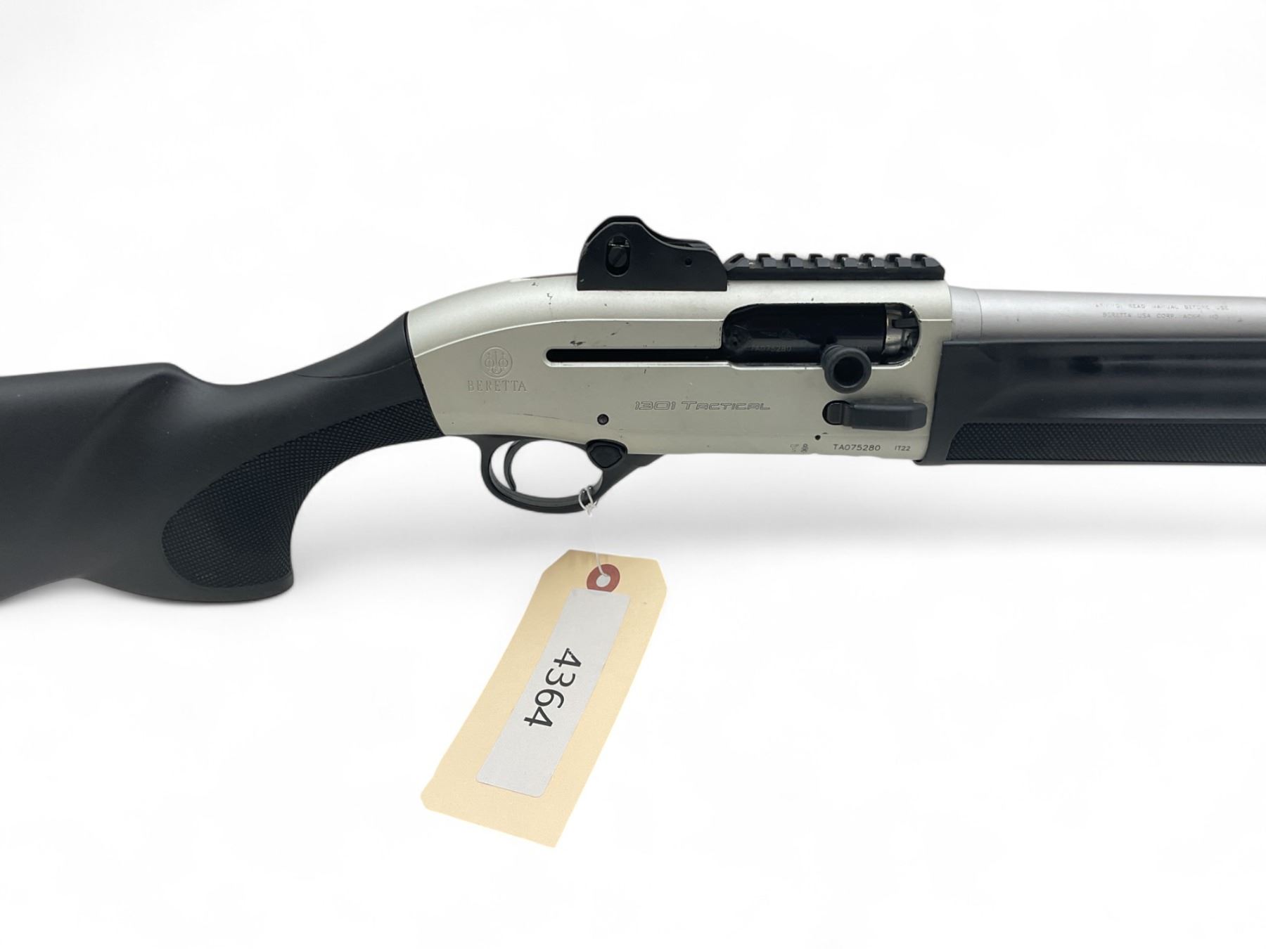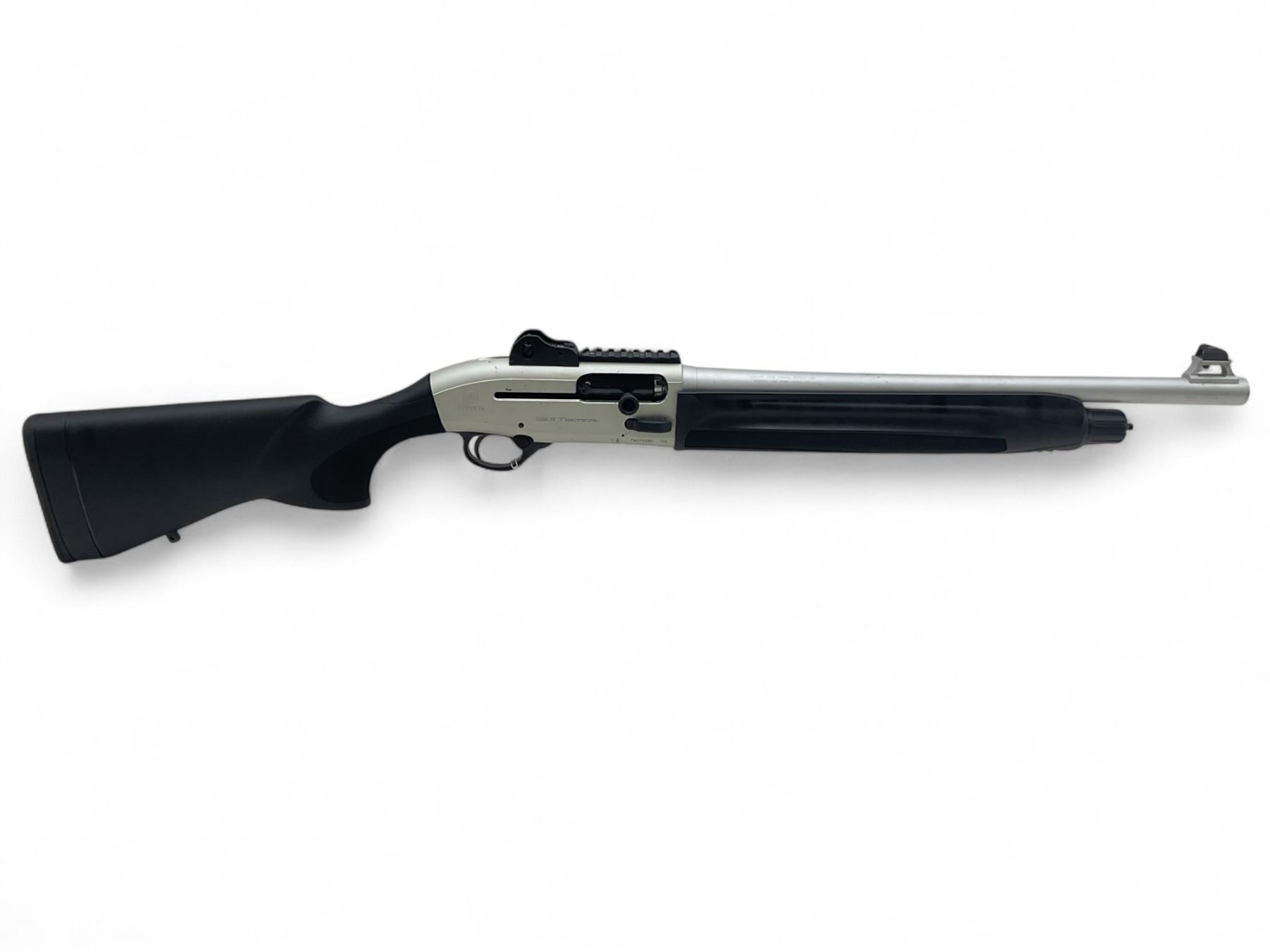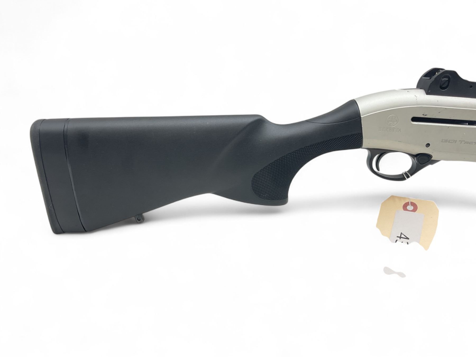 Beretta 1301 Tactical Silver Semi Auto Shotgun 12Ga 3" Chamber 18.5" Barrel Black Synthetic Stock. Fixed front sight with adjustable rear sight; comes with a removable choke. Receiver drilled and tapped with small rail installed. S&J velcro sidesaddle; also includes plastic hard case. This is a non-restricted firearm.