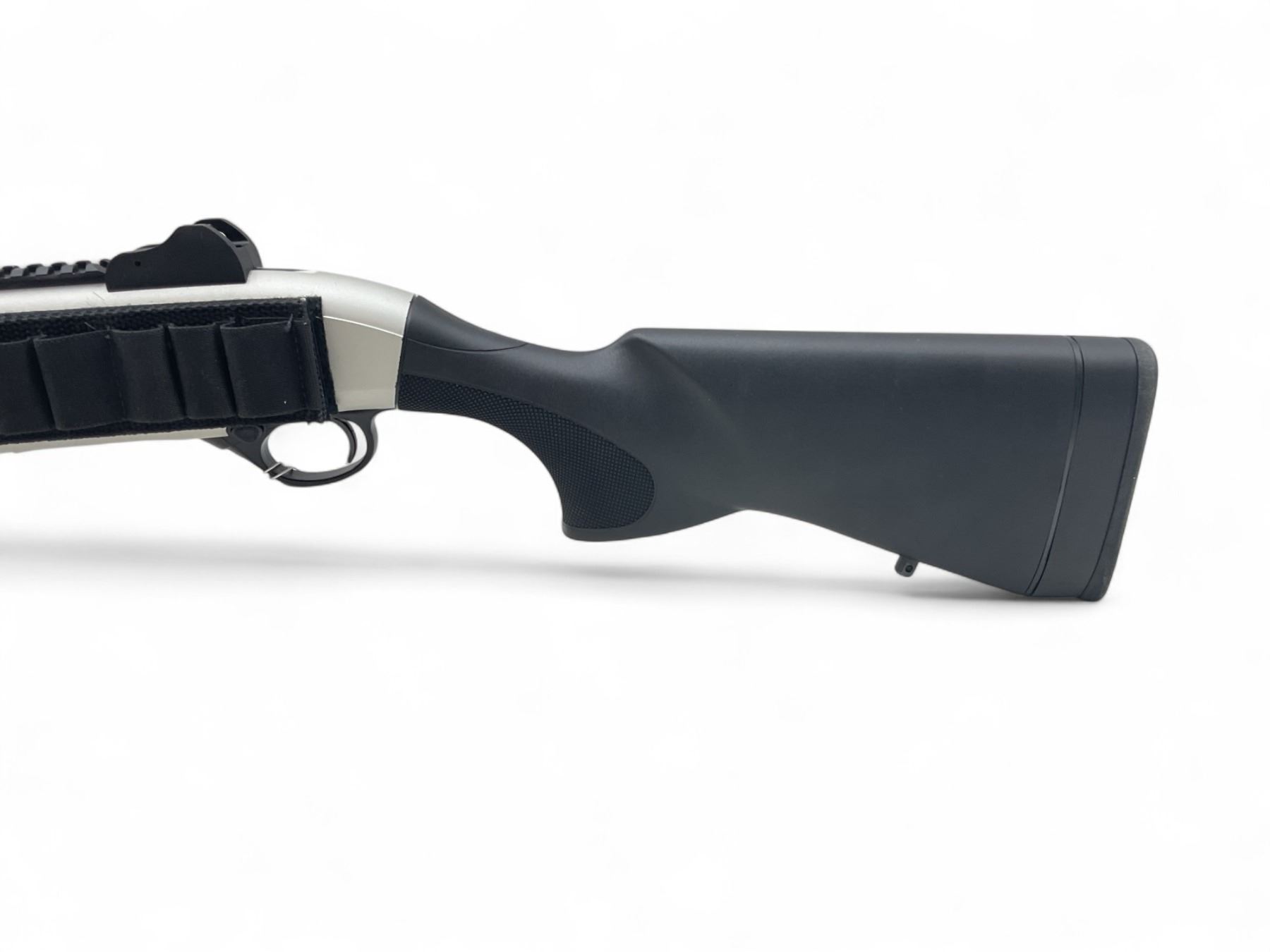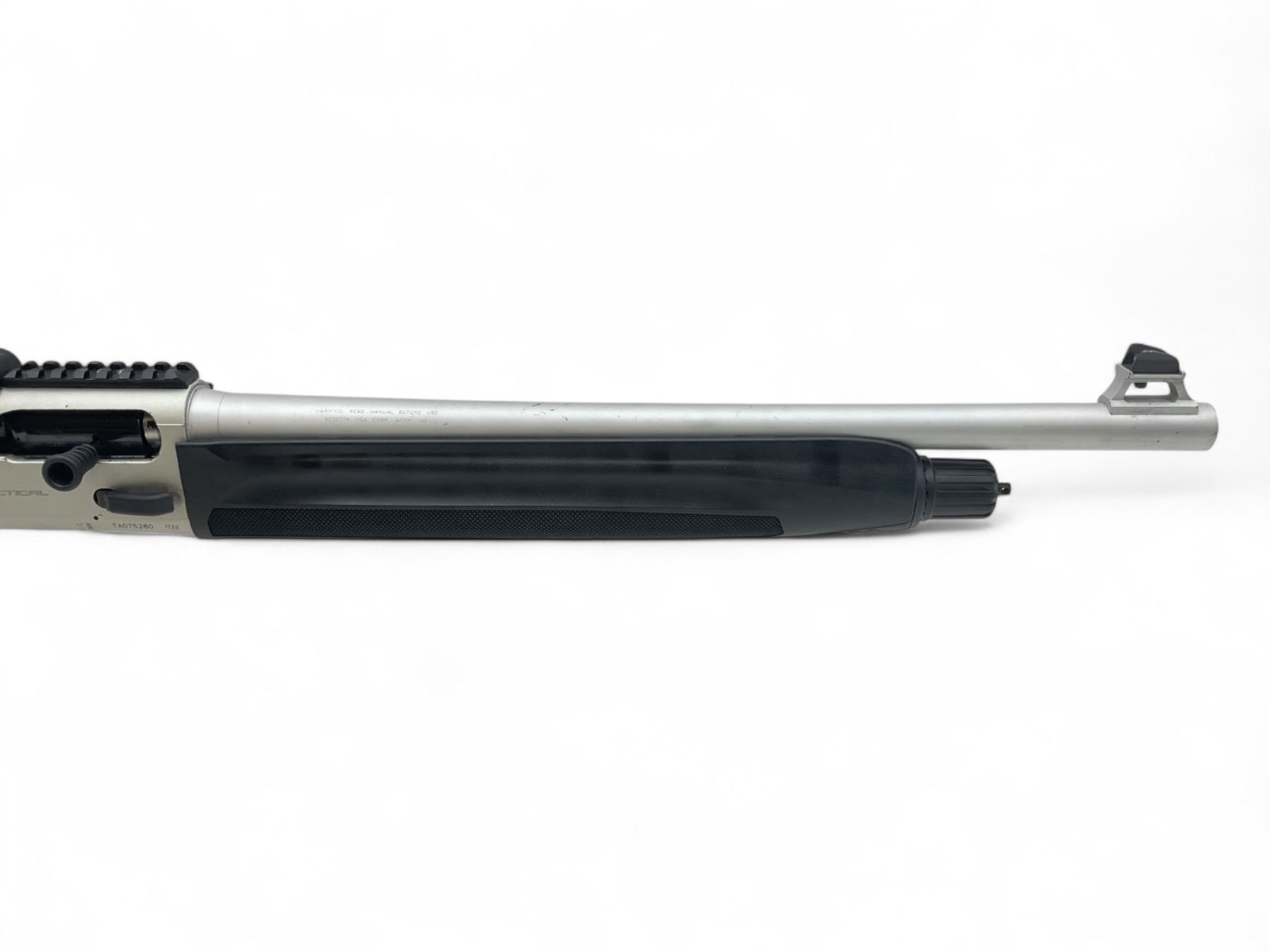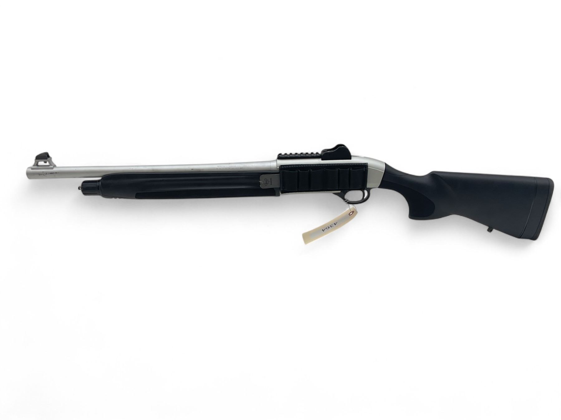 Beretta 1301 Tactical Silver Semi Auto Shotgun 12Ga 3" Chamber 18.5" Barrel Black Synthetic Stock. Fixed front sight with adjustable rear sight; comes with a removable choke. Receiver drilled and tapped with small rail installed. S&J velcro sidesaddle; also includes plastic hard case. This is a non-restricted firearm.