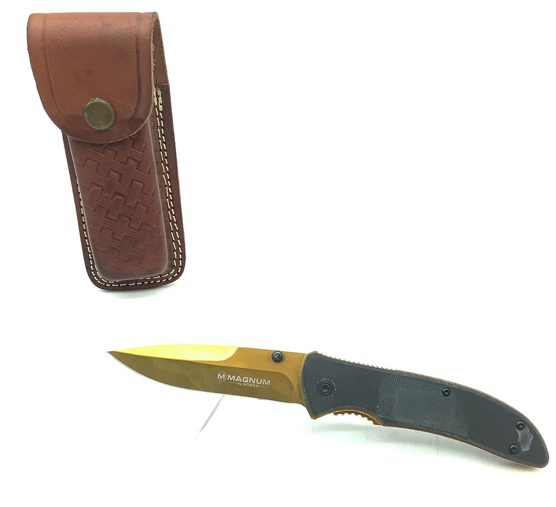 Boker Magnum Folding 3 1/2" Blade Pocket Clip Knife with Gold Blade and Liner with Leather Carrier