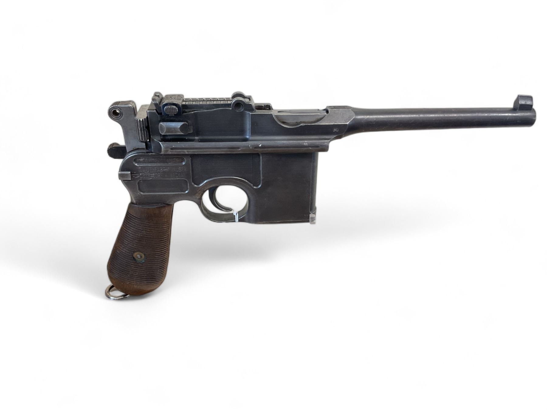 Broomhandle Mauser Semi Auto Pistol 7.63MM 5.5" Barrel, Restricted. Fixed front sight, adjustable rear sight. Internal magazine, lanyard ring. This is a restricted firearm and can only be sold to exempted individuals under the new firearms legislation, other businesses, export, deactivated for a fee of $250, or stripped and sold without the frame for an additional $95 fee.
