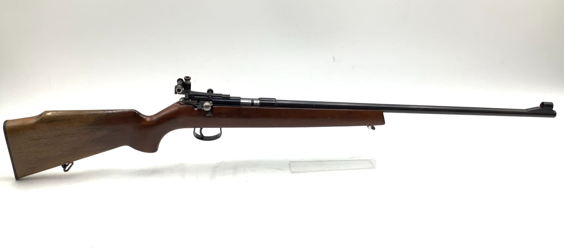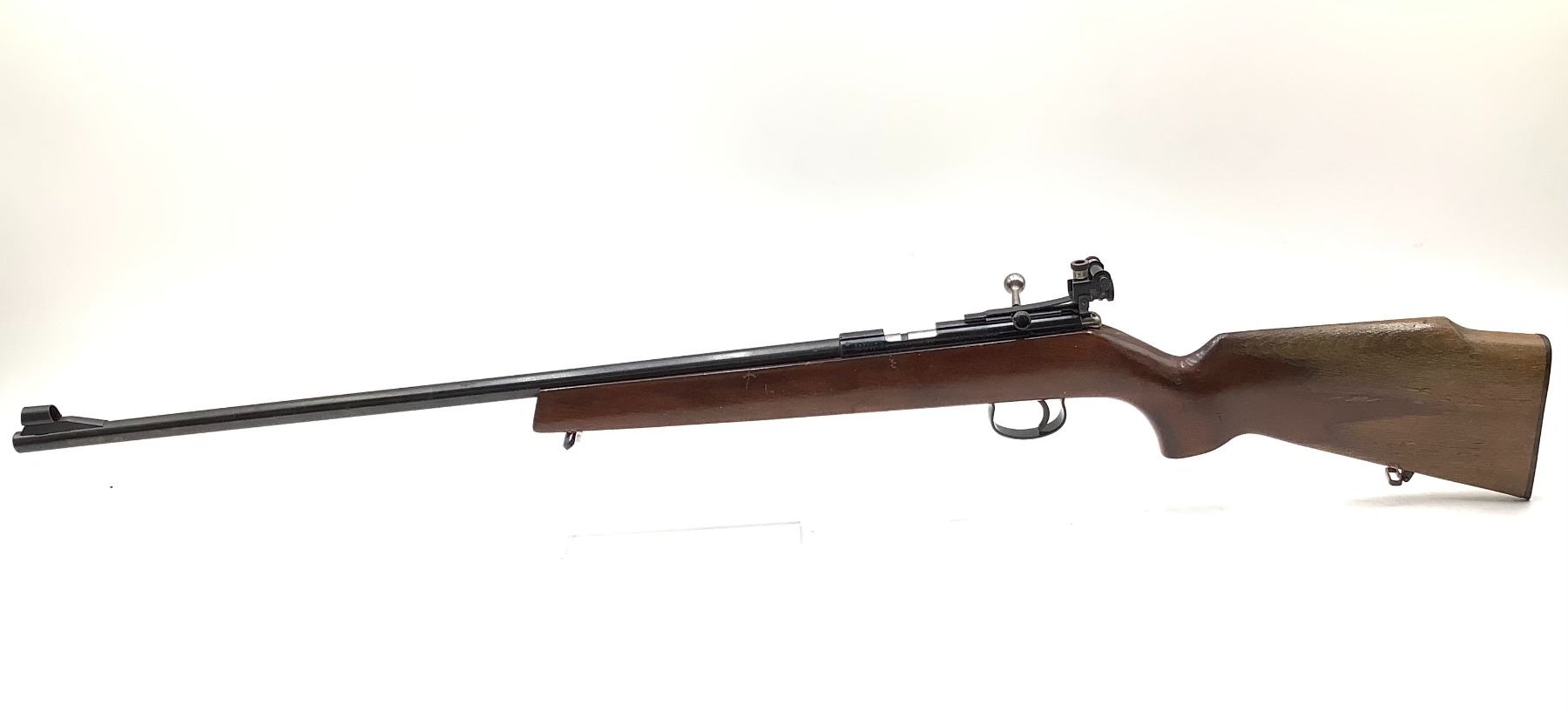 CIL Anschutz Model 180 Single Shot Rifle 22 S/L/LR 24" Barrel. Hooded front sight. Receiver has been drilled for a mount, sling mounts present. Wood stock has scratches, nicks and chips and shows signs of water damage. Metal finish shows wear and a few scratches present. This is a non-restricted firearm.
