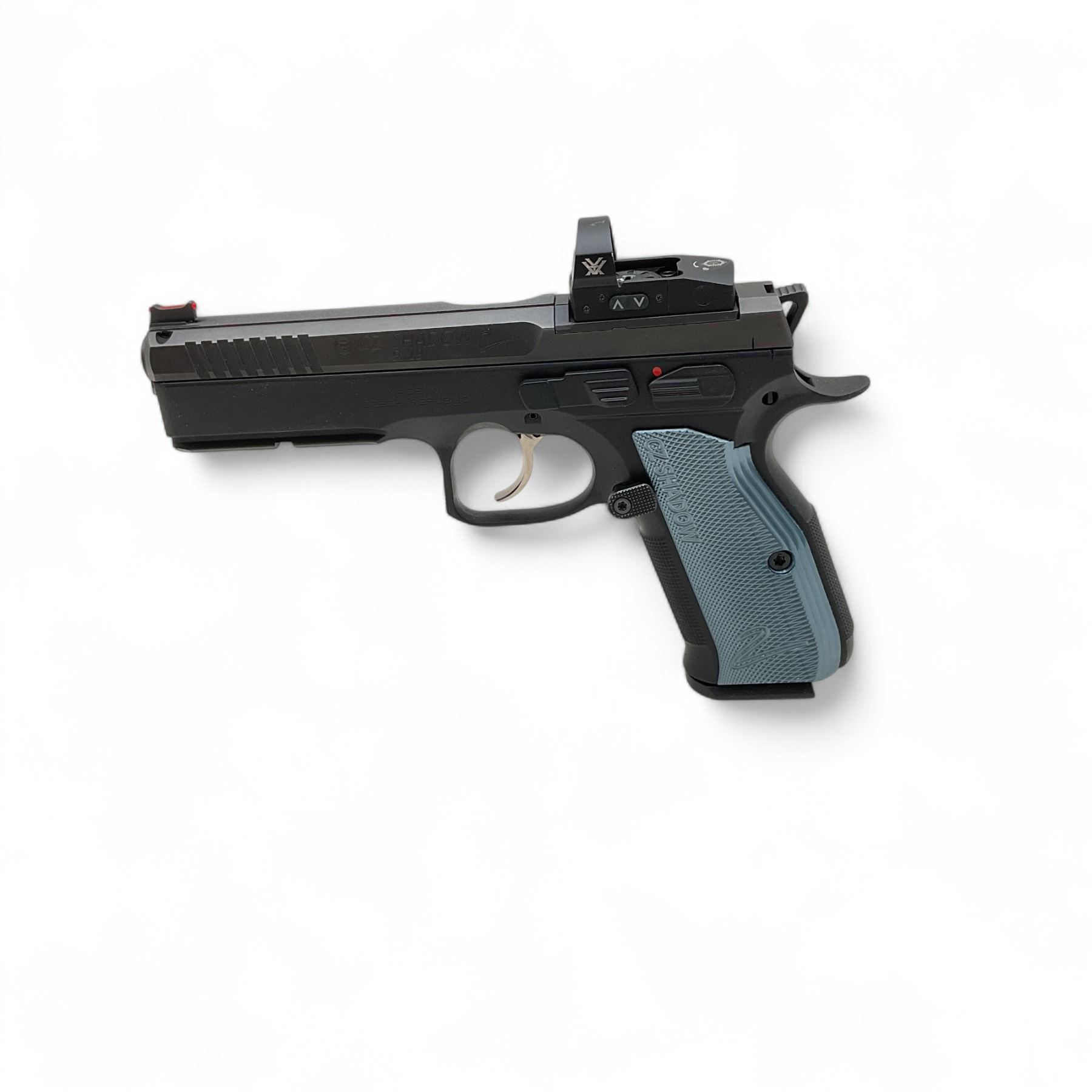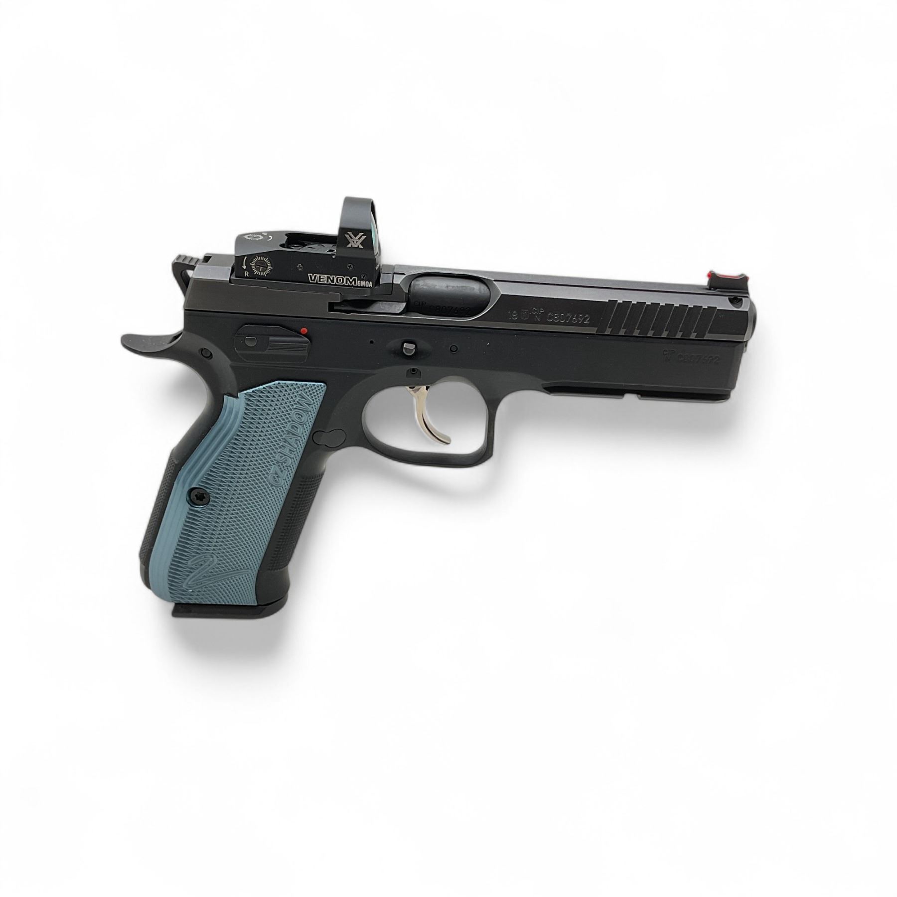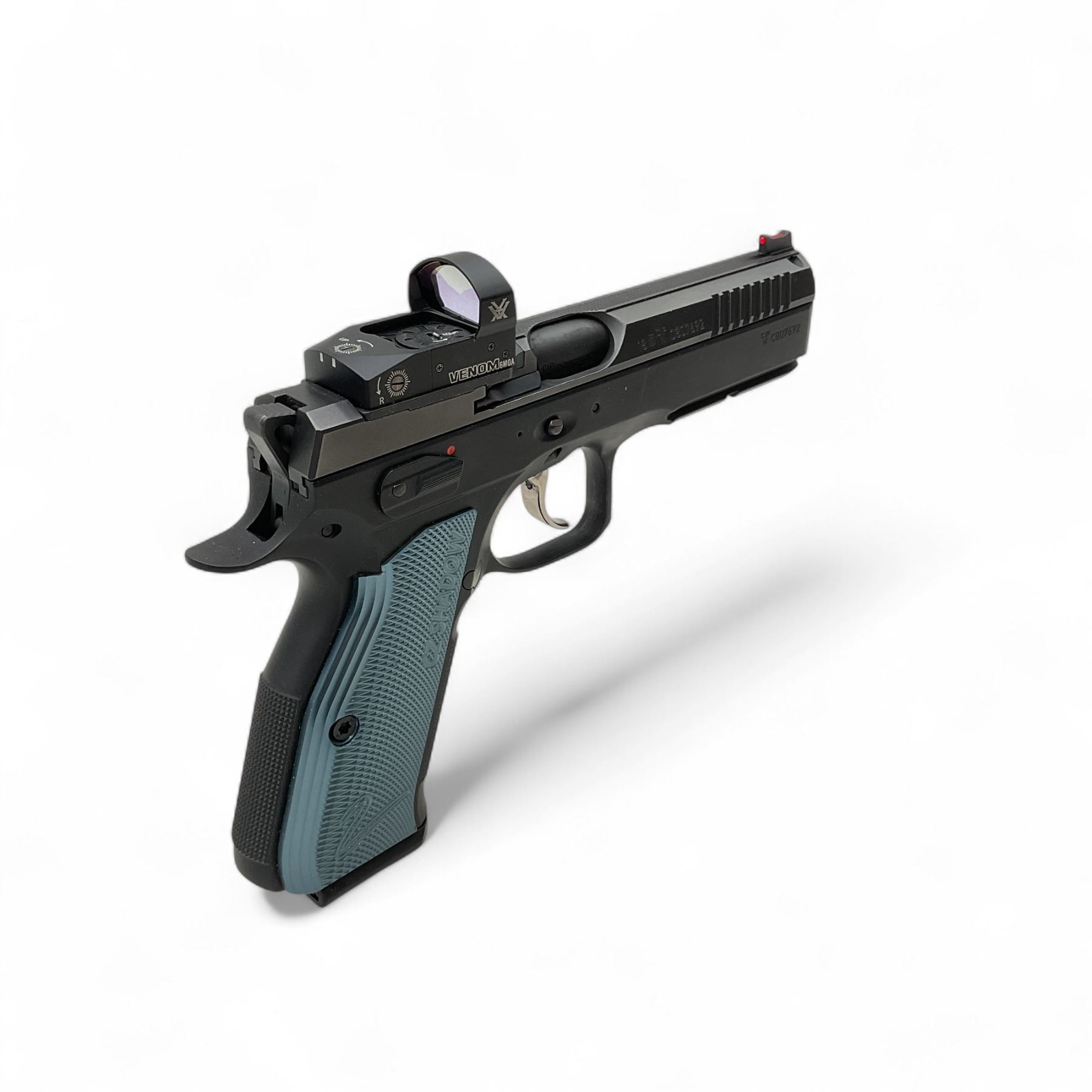 CZ Shadow 2 Semi Auto Pistol 9MM 4.75" Barrel Blue Grips With Vortex Venom 6MOA Red Dot, Restricted. Comes with one detachable magazine.