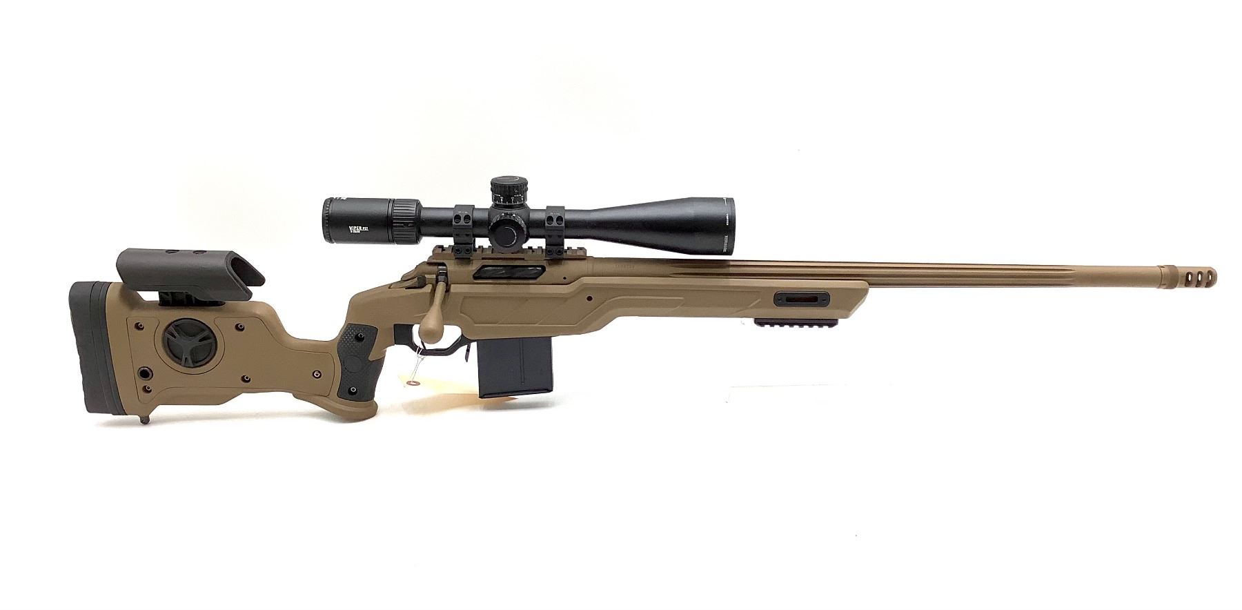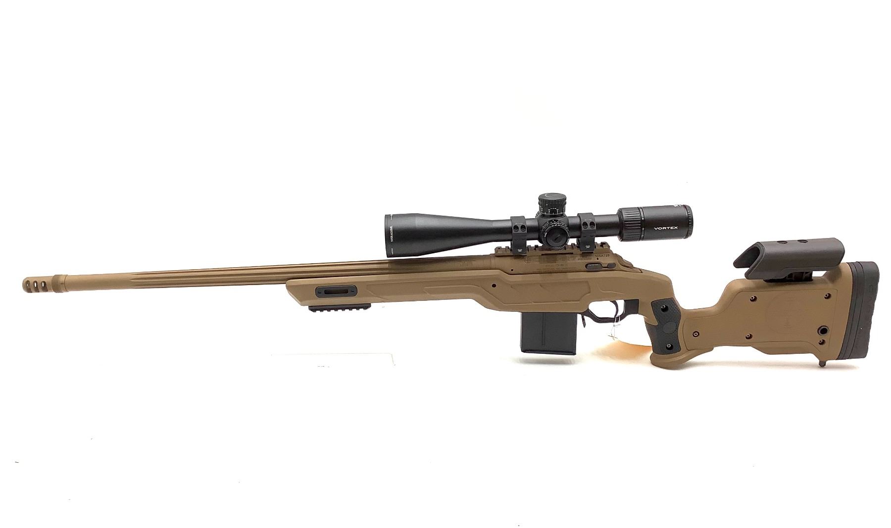 Cadex CDX-R7 SHP Bolt Action Rifle 6.5 Creedmoor 24" Threaded Barrel Tan With Vortex 5-25X50, New. Strike Nuke chassis, detachable magazine. Adjustable cheek rest, rubber butt pad. Receiver drilled and tapped with rail. Comes with Vortex Viper PST Gen II First Focal Plain 5-25X50 Scope. Includes tan drag bag. This is a non-restricted firearm. Everything is brand new, never fired except for at the factory. We built this for the auction.
