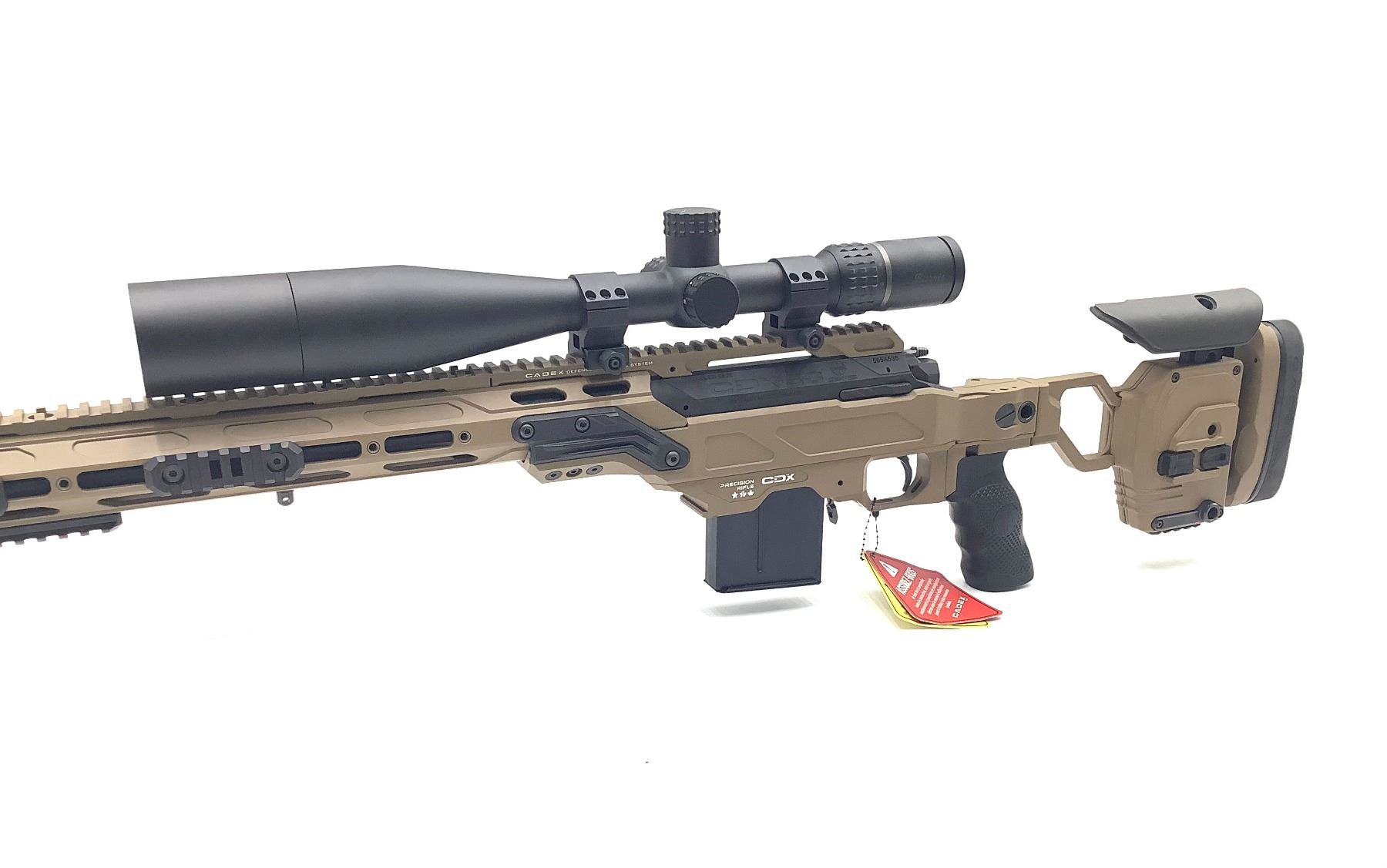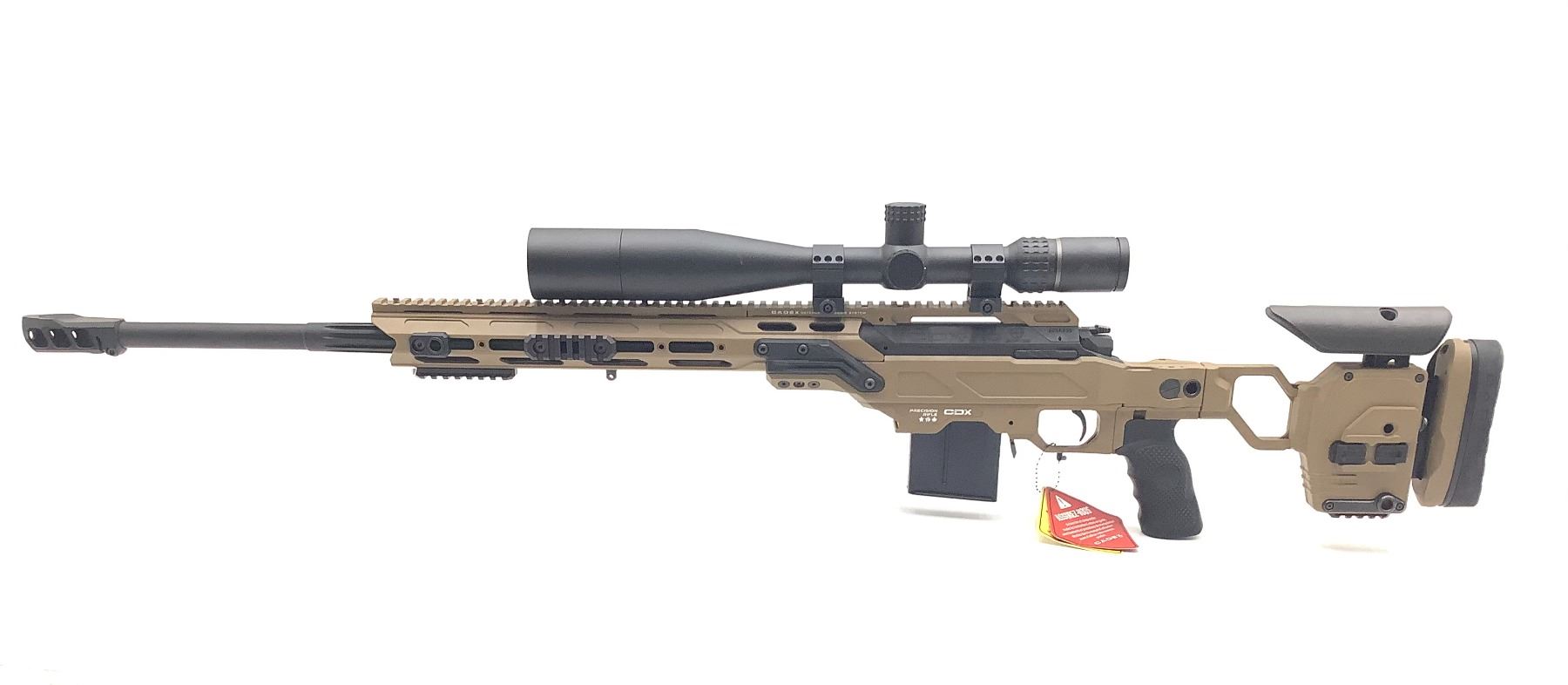 Cadex CDX30 Bolt Action Rifle 308 Win 26" Barrel Tan And Black With Burris 5-25X50 Scope. Consigner says gun was never fired. Detachable magazine, adjustable stock. Threaded barrel with brake. Burris Veracity 5-25X50 scope; also includes drag bag. This is a non-restricted firearm.