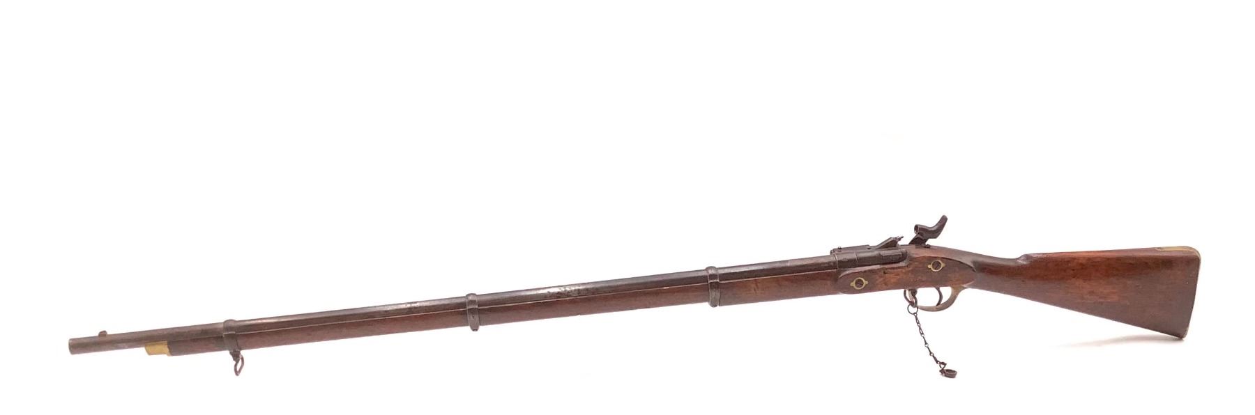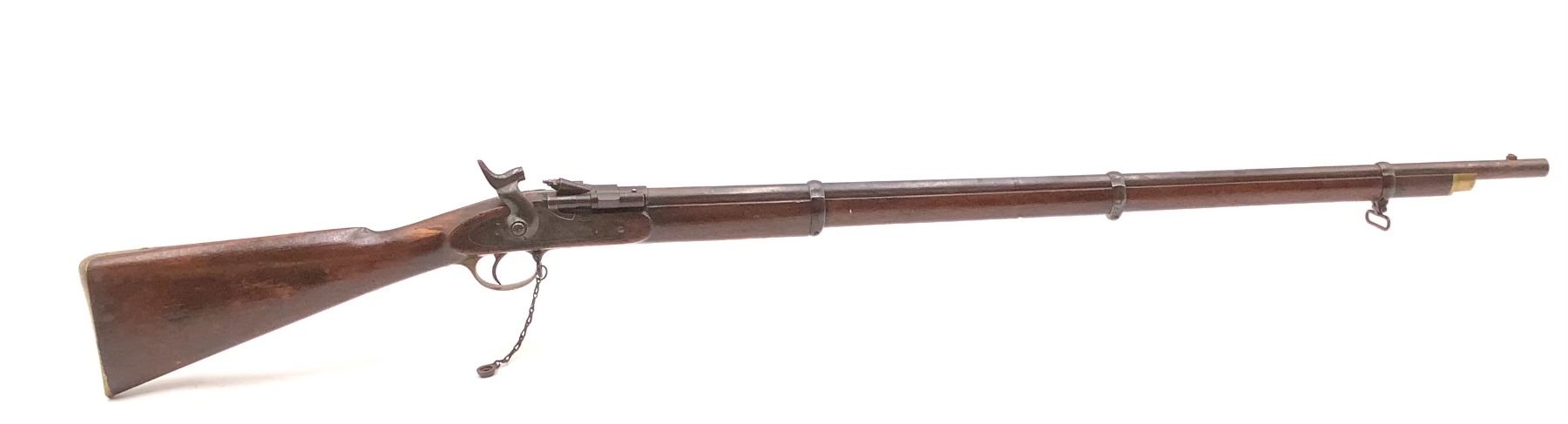 A Canadian Snider-Enfield Mark II* single-shot breech-loading service rifle chambered in .577 Snider. The rear sight and clearing rod are missing. 1864 Enfield lockplate. Some pitting in the barrel. The snap cap is broken but still in place. The rifle is marked "RG," likely the 10th Royal Grenadiers, now the Royal Regiment of Canada rack number 381.